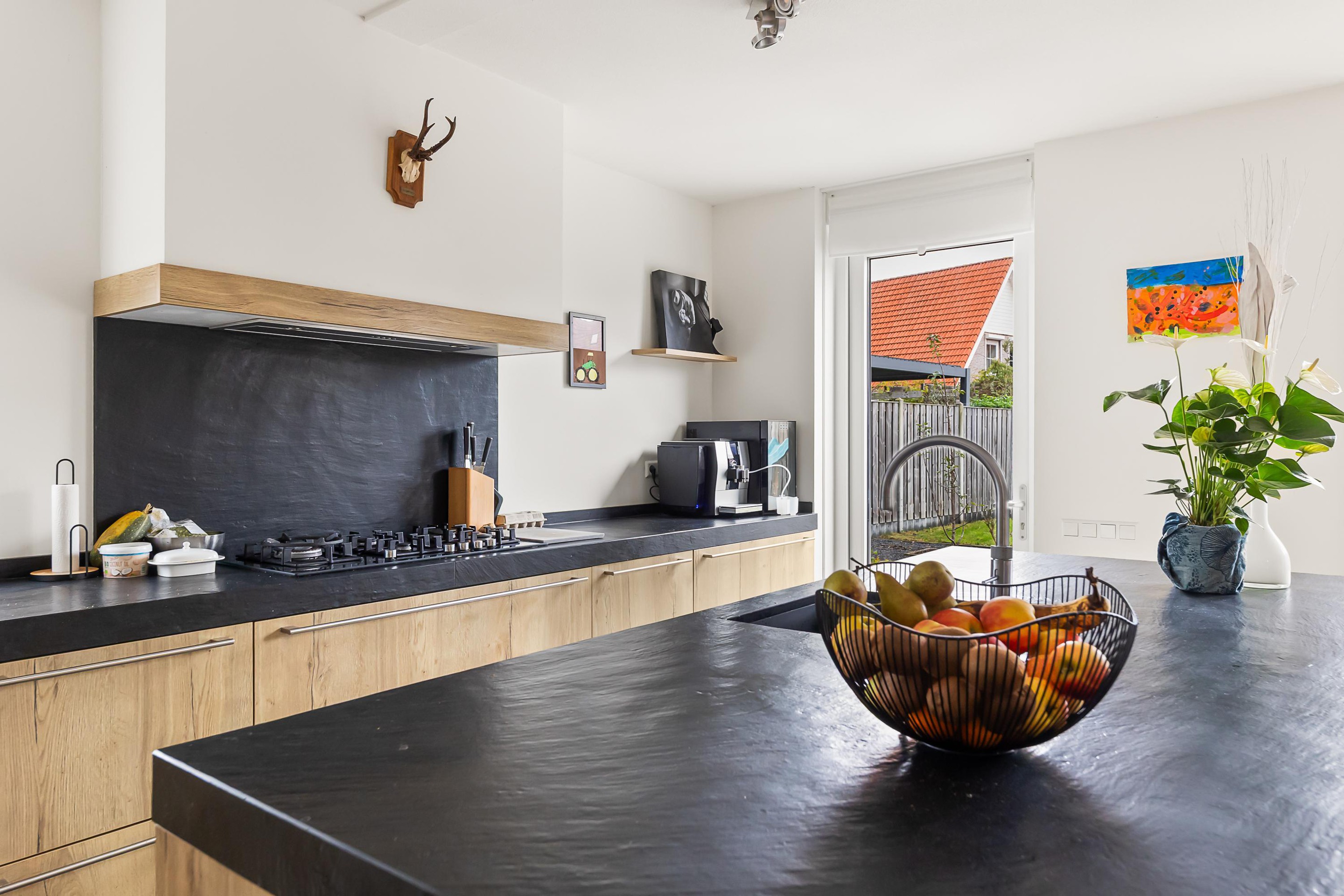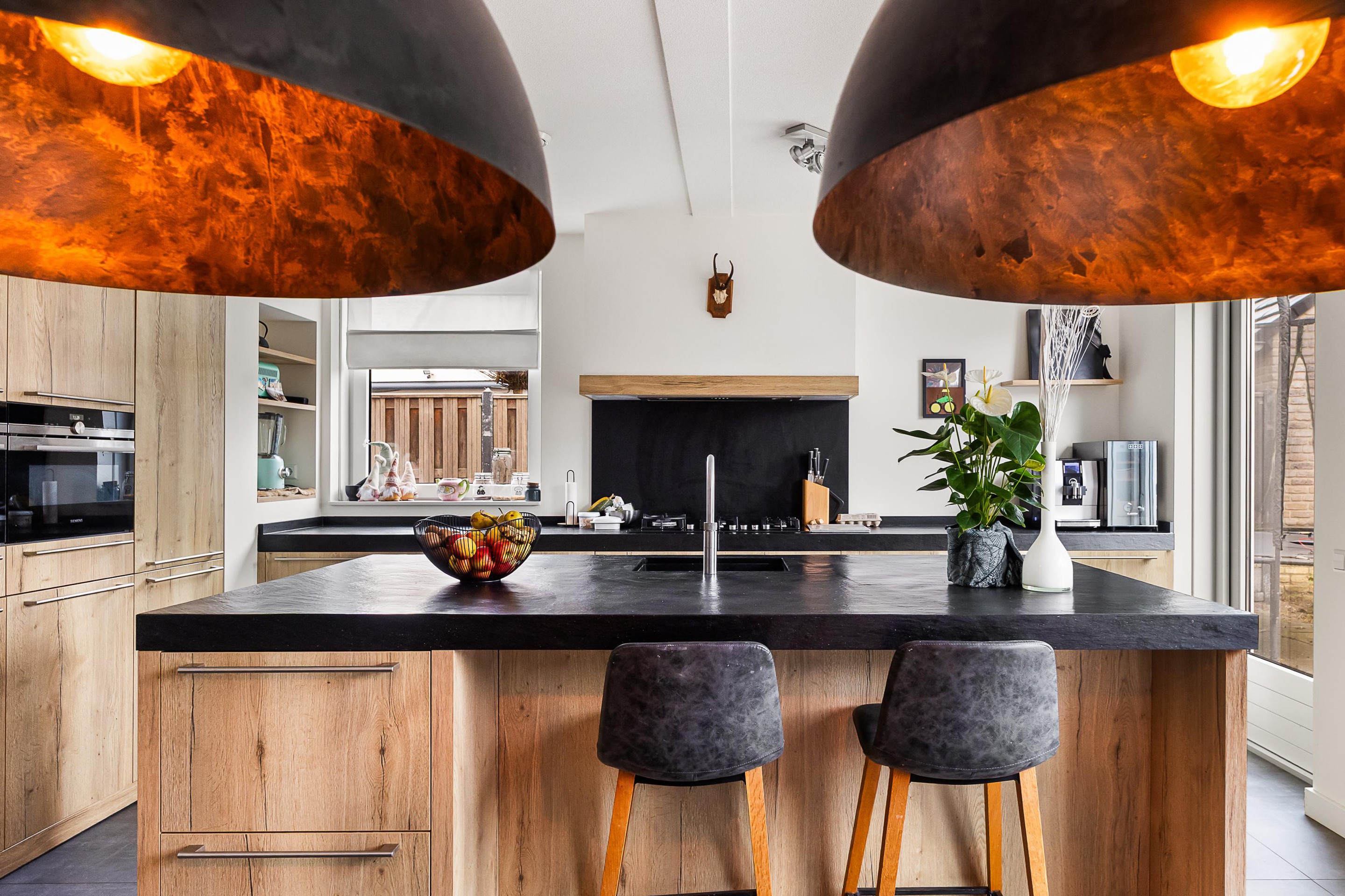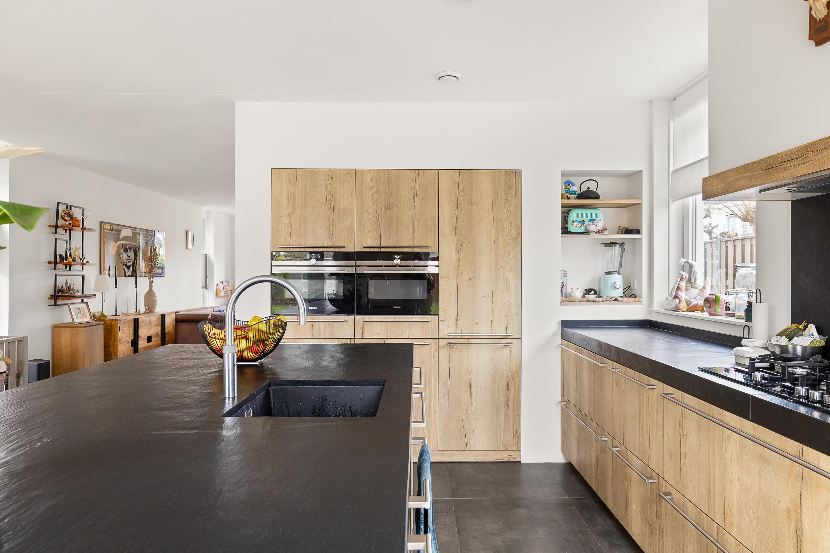 De luxe open keuken is een echte eyecatcher en compleet uitgerust met onder andere een gaskookplaat met wokbrander, combi-stoomoven, magnetron, koelkast, vaatwasser en Quooker. Het spoeleiland met barfunctie maakt deze keuken dé plek om samen te koken en te genieten. De gehele begane grond is afgewerkt met een praktische en stijlvolle tegelvloer.