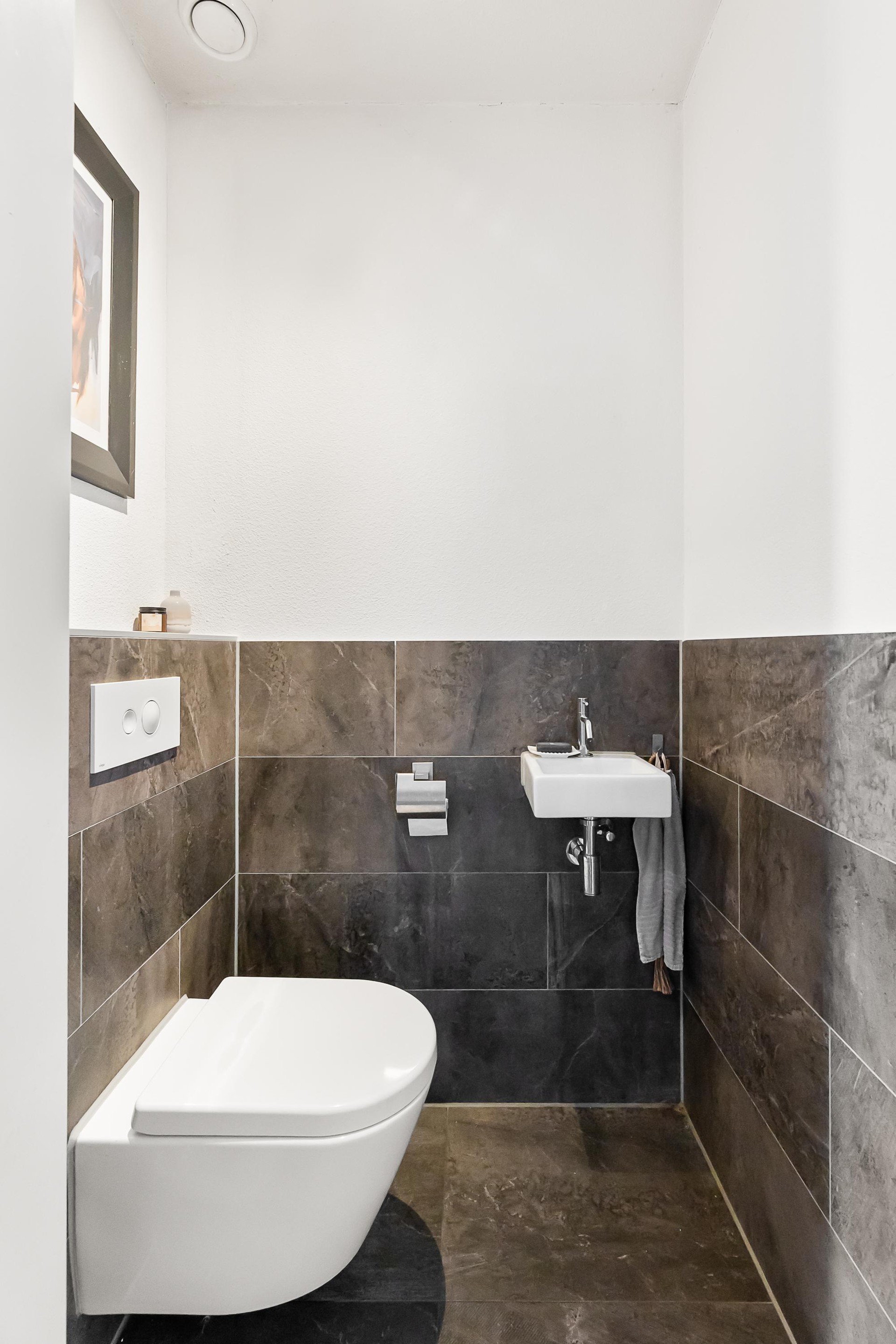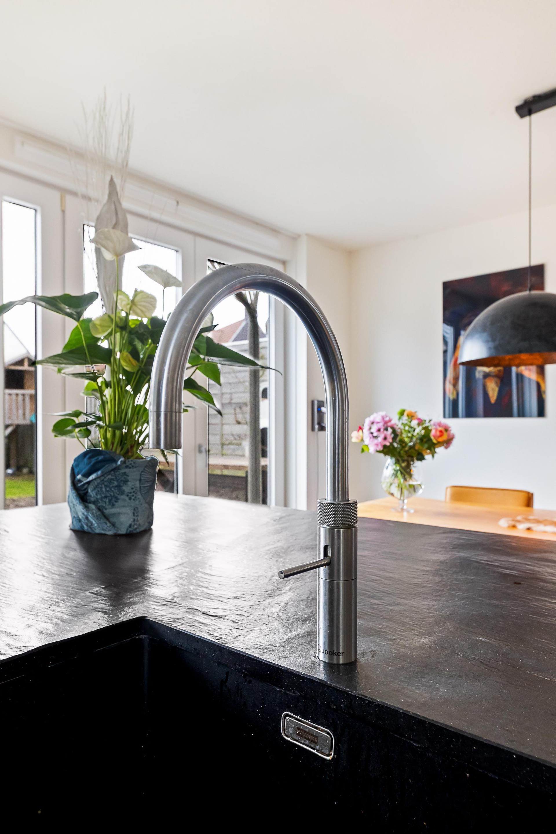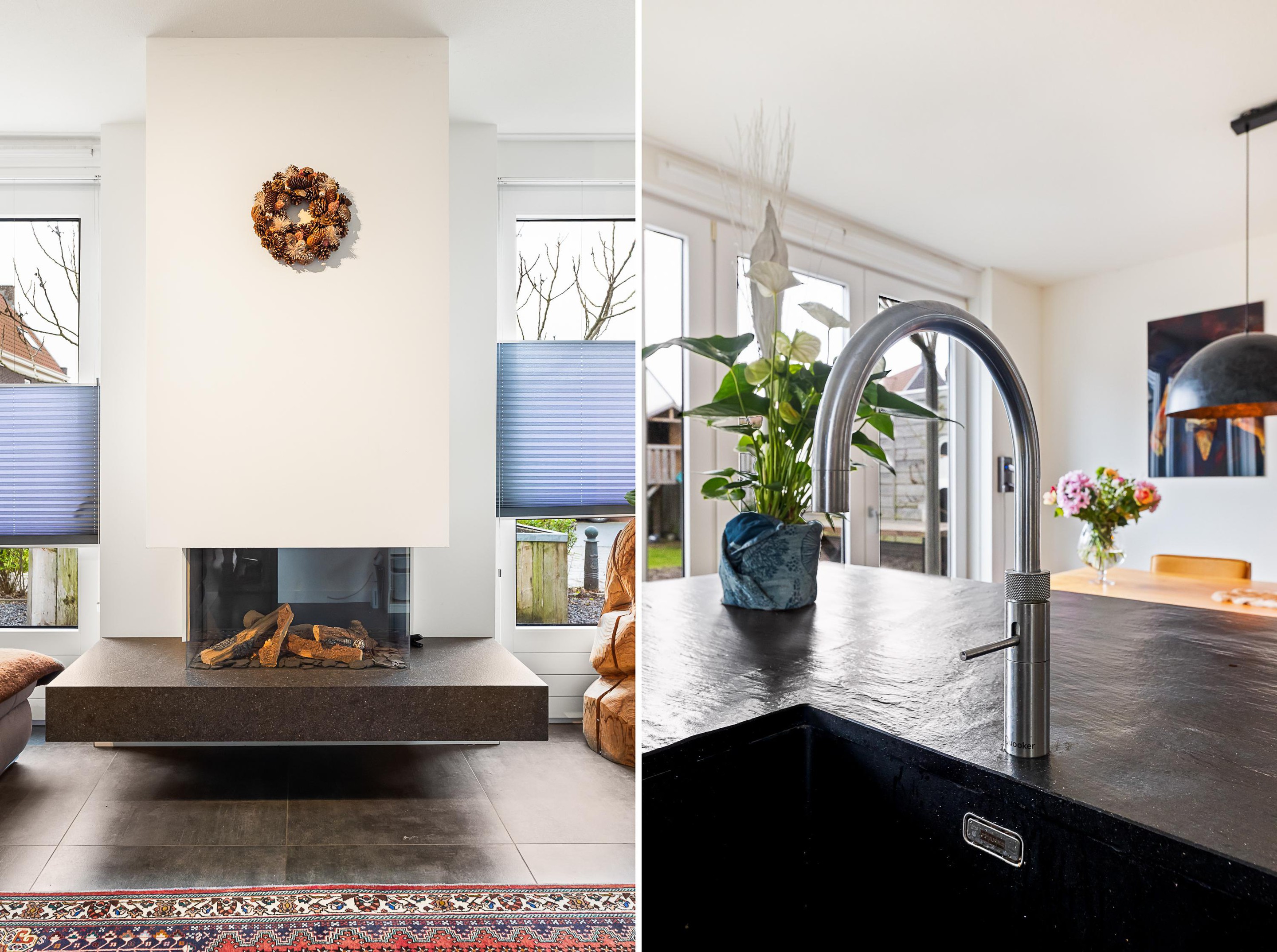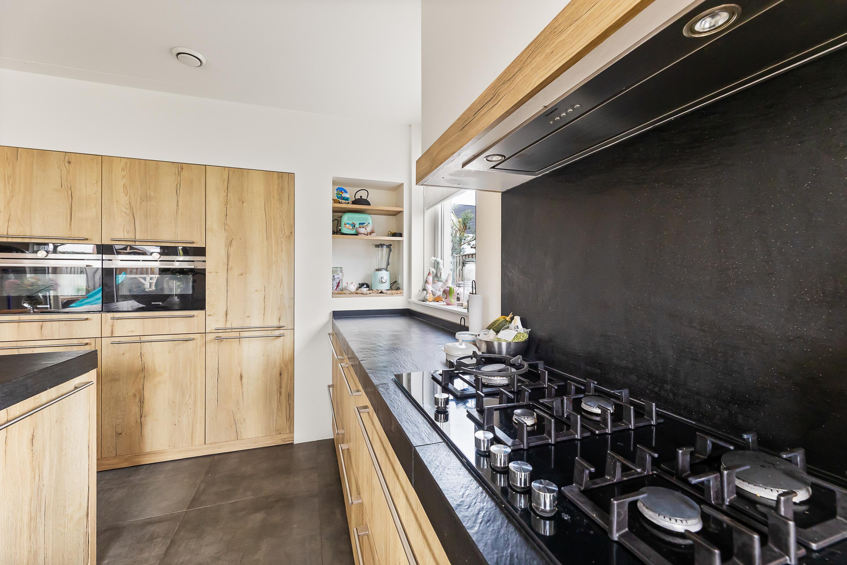De luxe open keuken is een echte eyecatcher en compleet uitgerust met onder andere een gaskookplaat met wokbrander, combi-stoomoven, magnetron, koelkast, vaatwasser en Quooker. Het spoeleiland met barfunctie maakt deze keuken dé plek om samen te koken en te genieten. De gehele begane grond is afgewerkt met een praktische en stijlvolle tegelvloer.