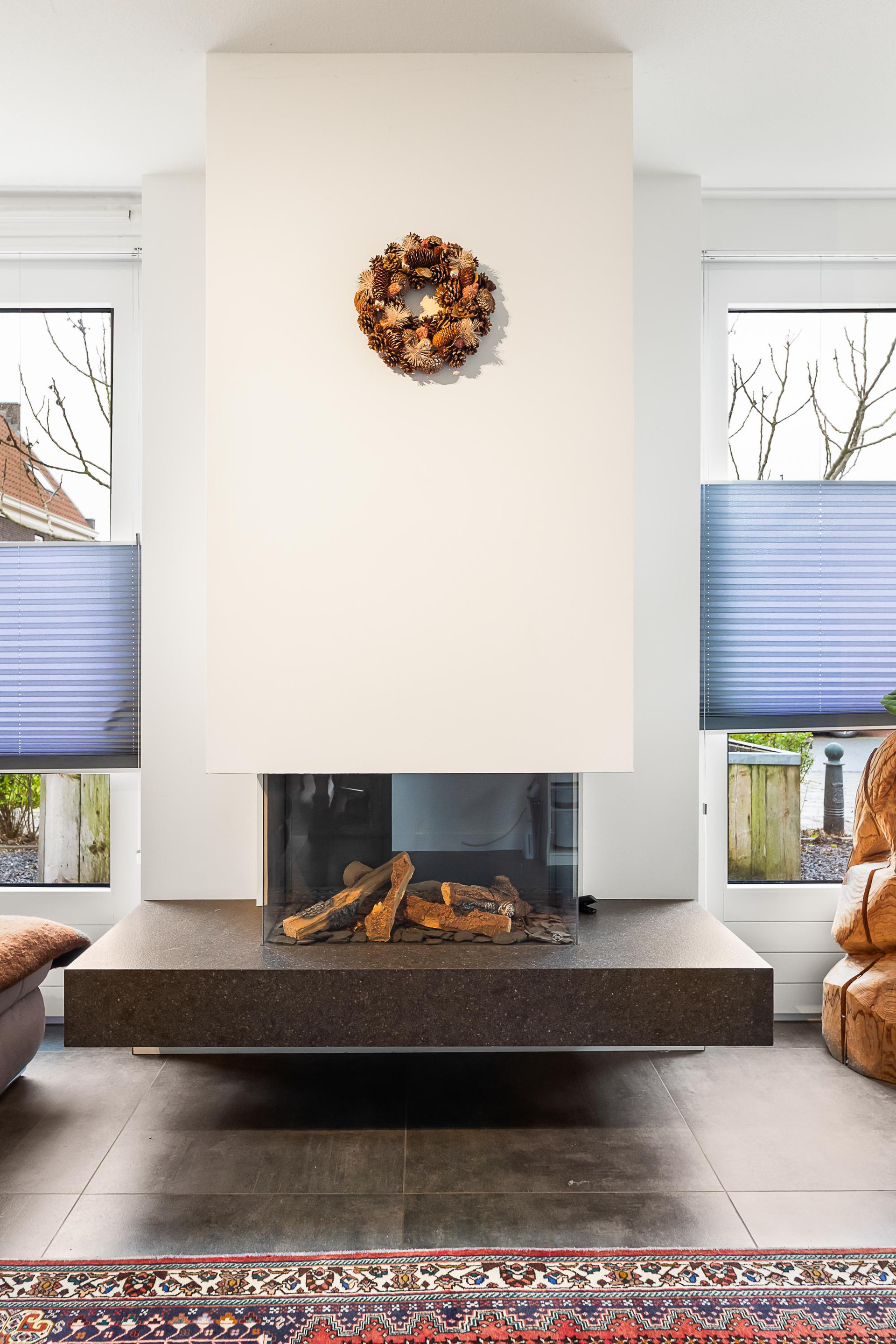 Begane grond Via de hal met trapopgang en toilet betreed je de royale, speels ingedeelde woonkamer met gezellige gashaard. Grote raampartijen zorgen voor veel licht en een prettige verbinding met de tuin.