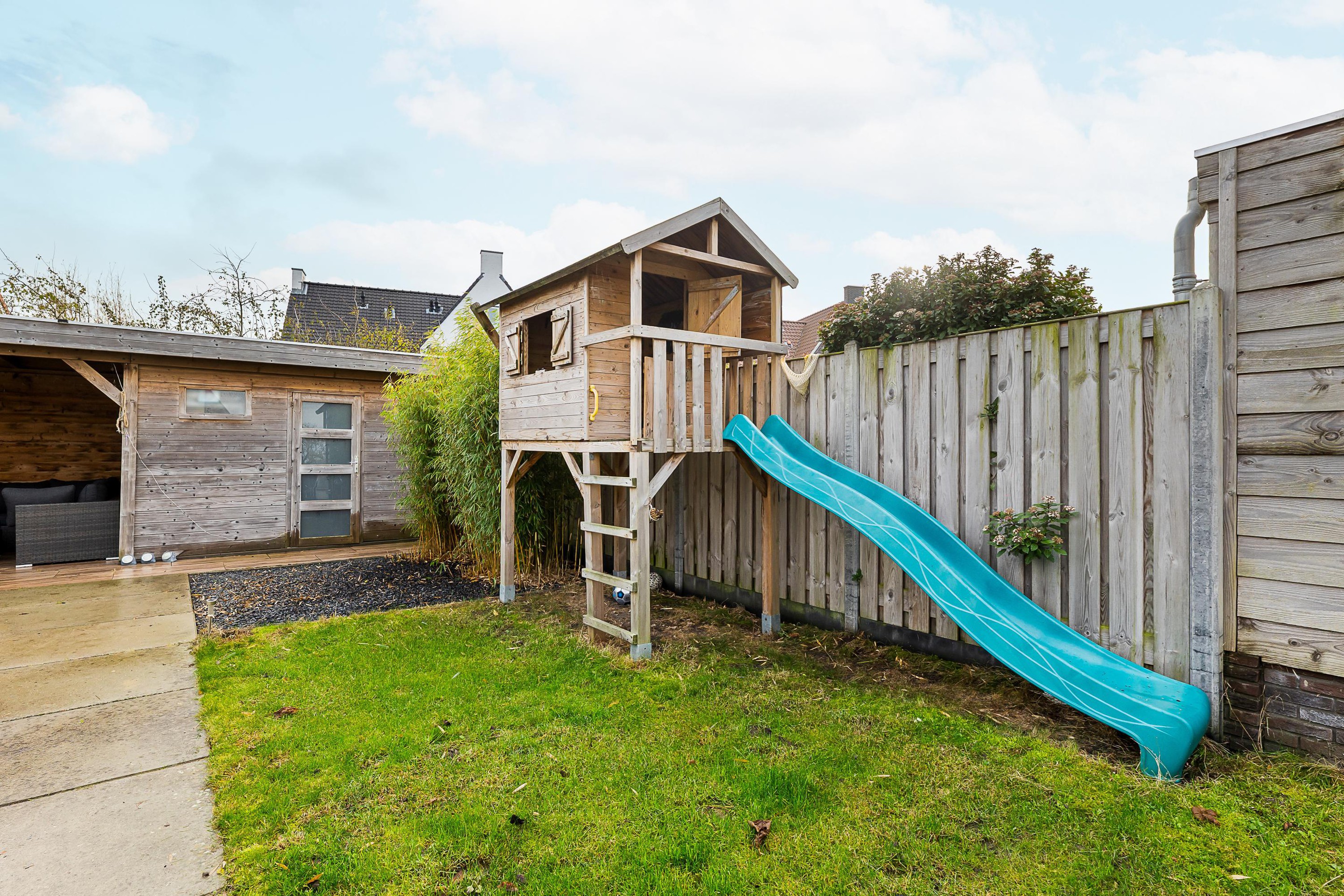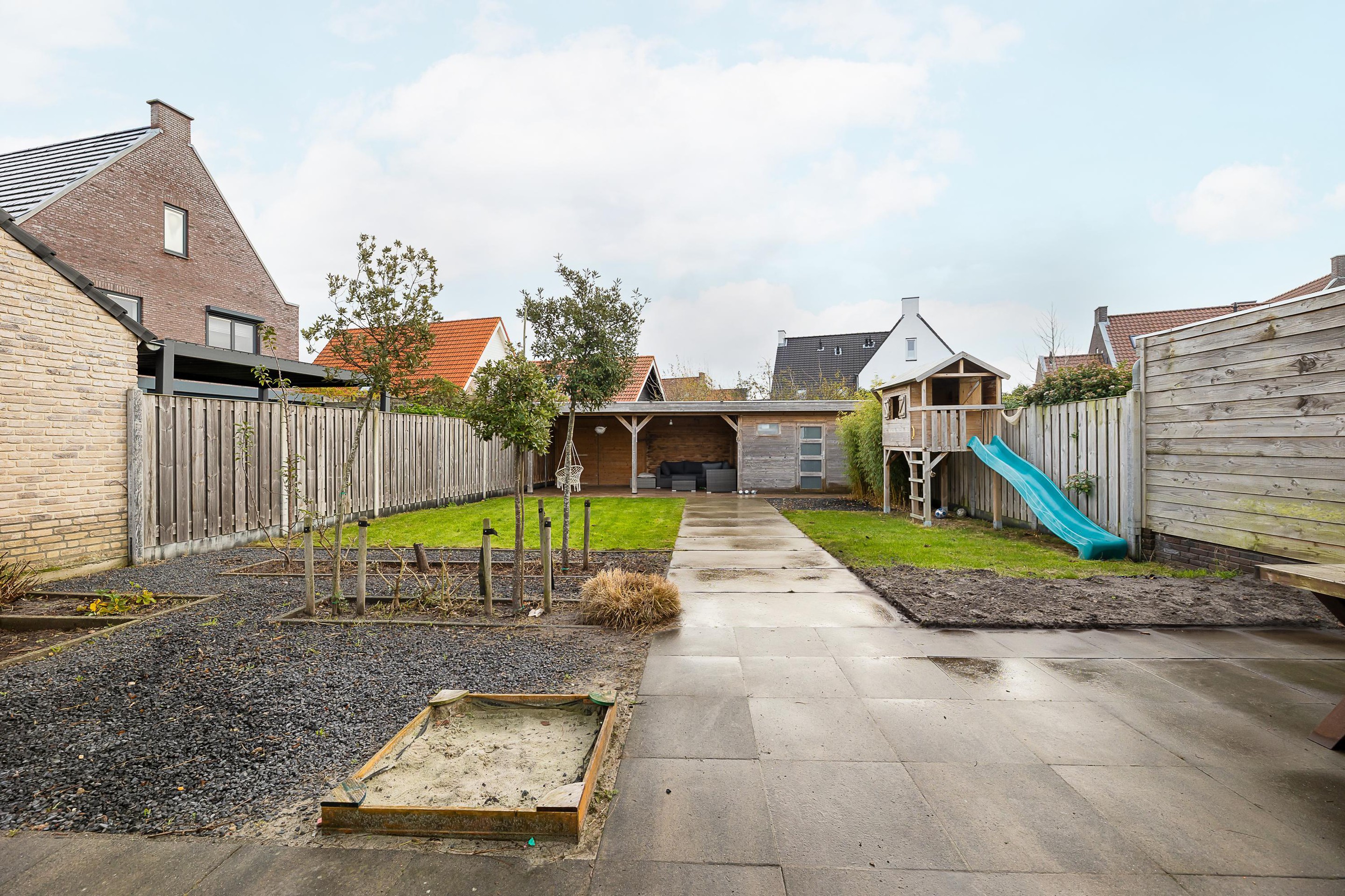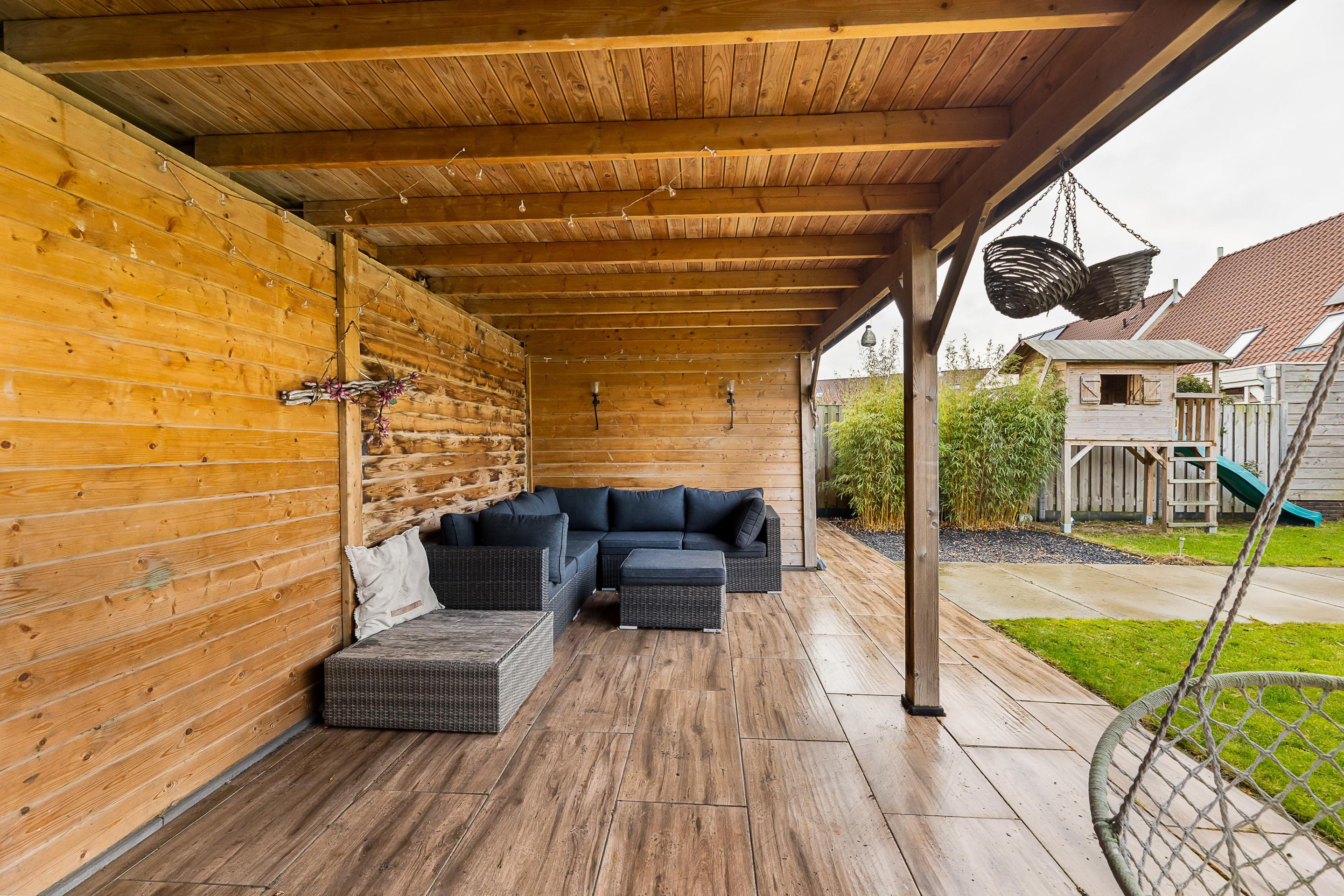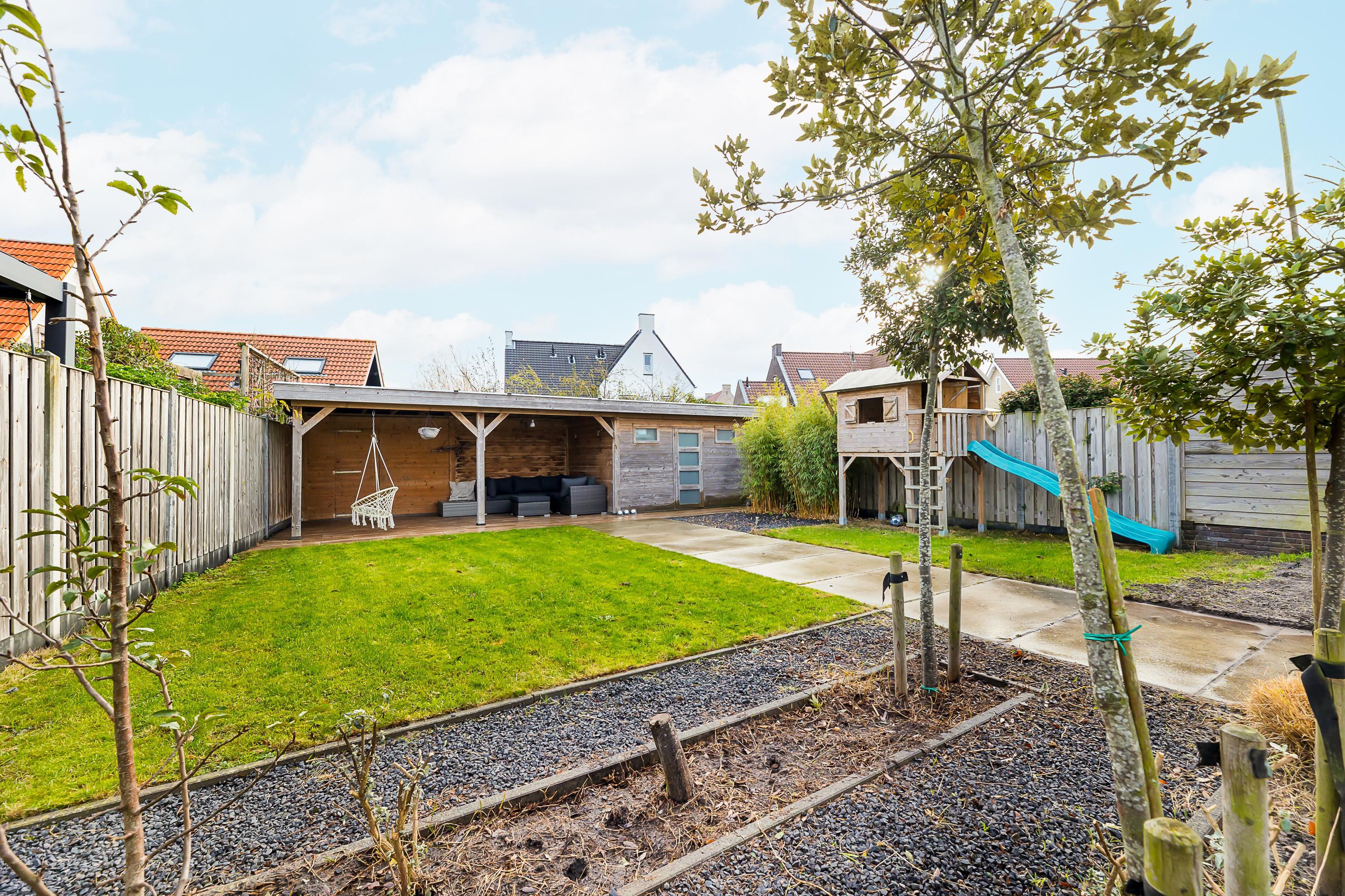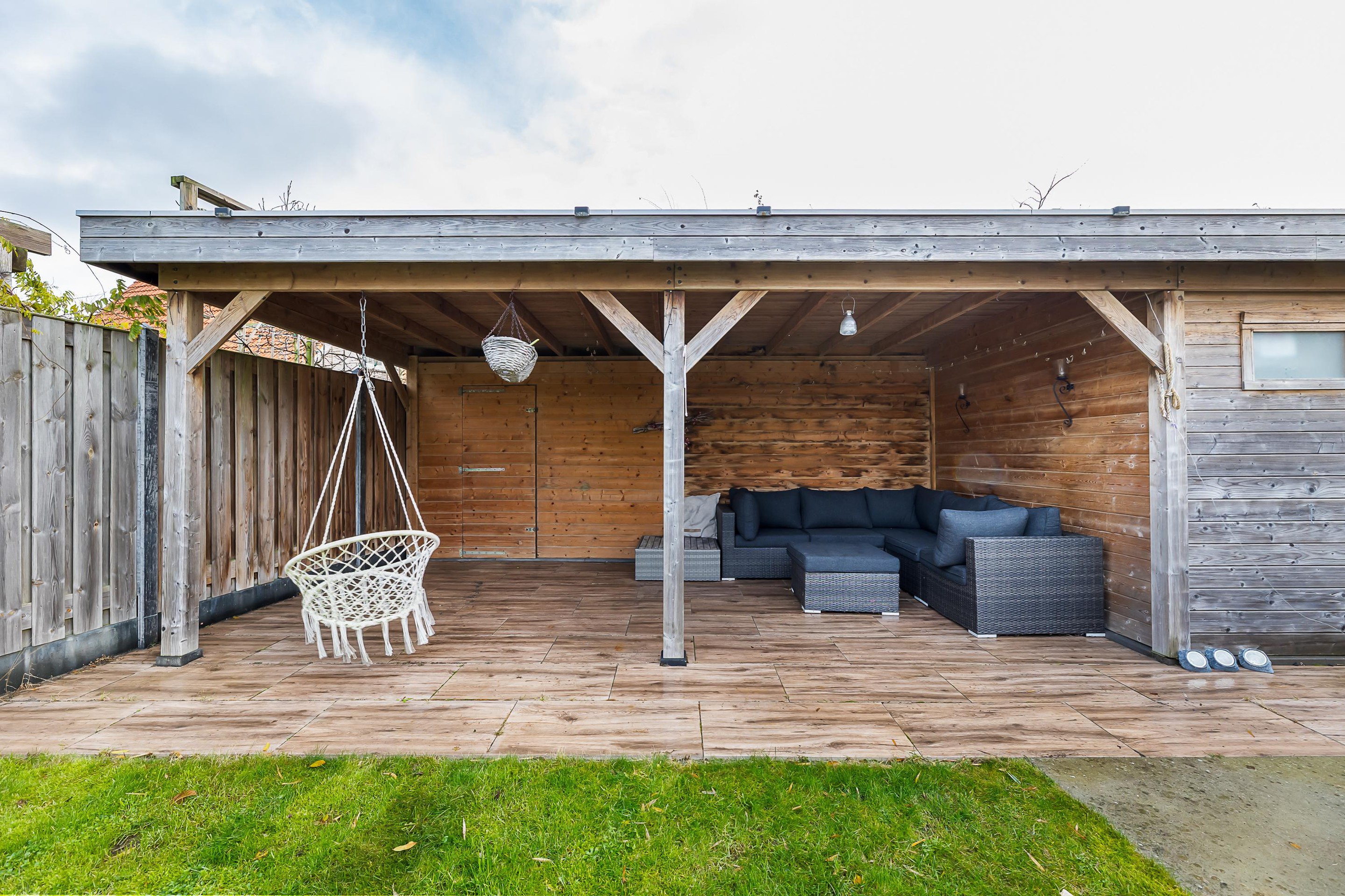 De diepe achtertuin op het oosten biedt volop zon en privacy. Aangelegd met een groot terras, gazon en borders. Achterin de tuin staat een houten tuinhuis en een extra bergruimte met aangrenzende veranda – ideaal voor lange zomeravonden.