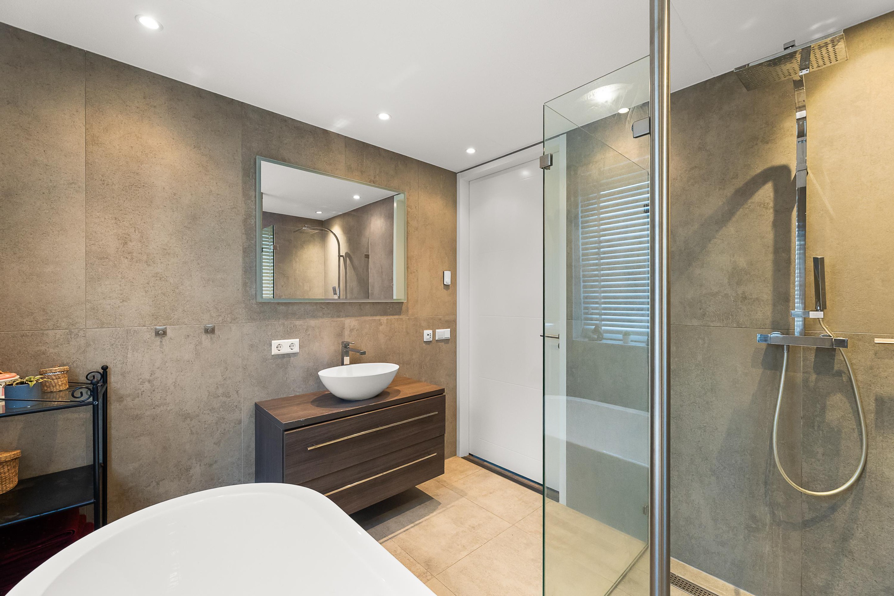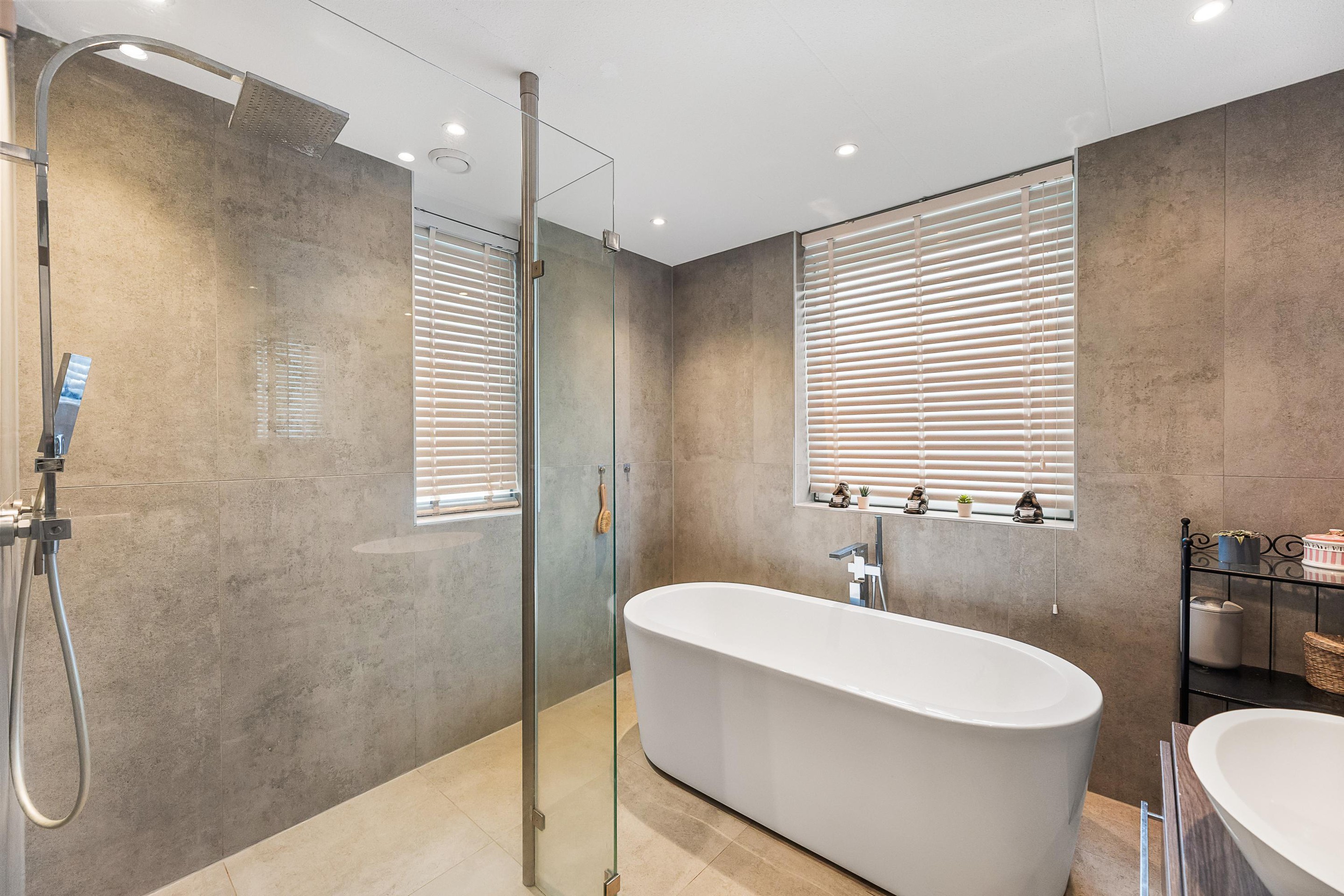 Eerste verdieping Overloop met toegang tot de grote master bedroom met inloopkast. Daarnaast een tweede slaapkamer met uitzicht op het park, een separaat toilet en een luxe badkamer met inloopdouche, vrijstaand ligbad en wastafelmeubel.