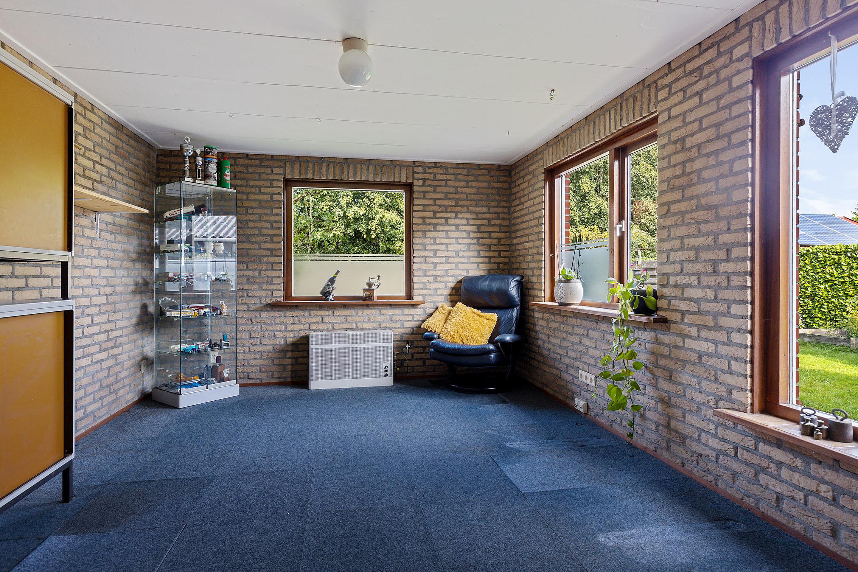 Begane grond Entree, hal, ruime woonkamer van 37 m2 met een open keuken van 10m2. Via de keuken naar de bijkeuken en badkamer. Via de bijkeuken naar de besloten tuin met berging en garage. De berging is ingericht als kantoor.