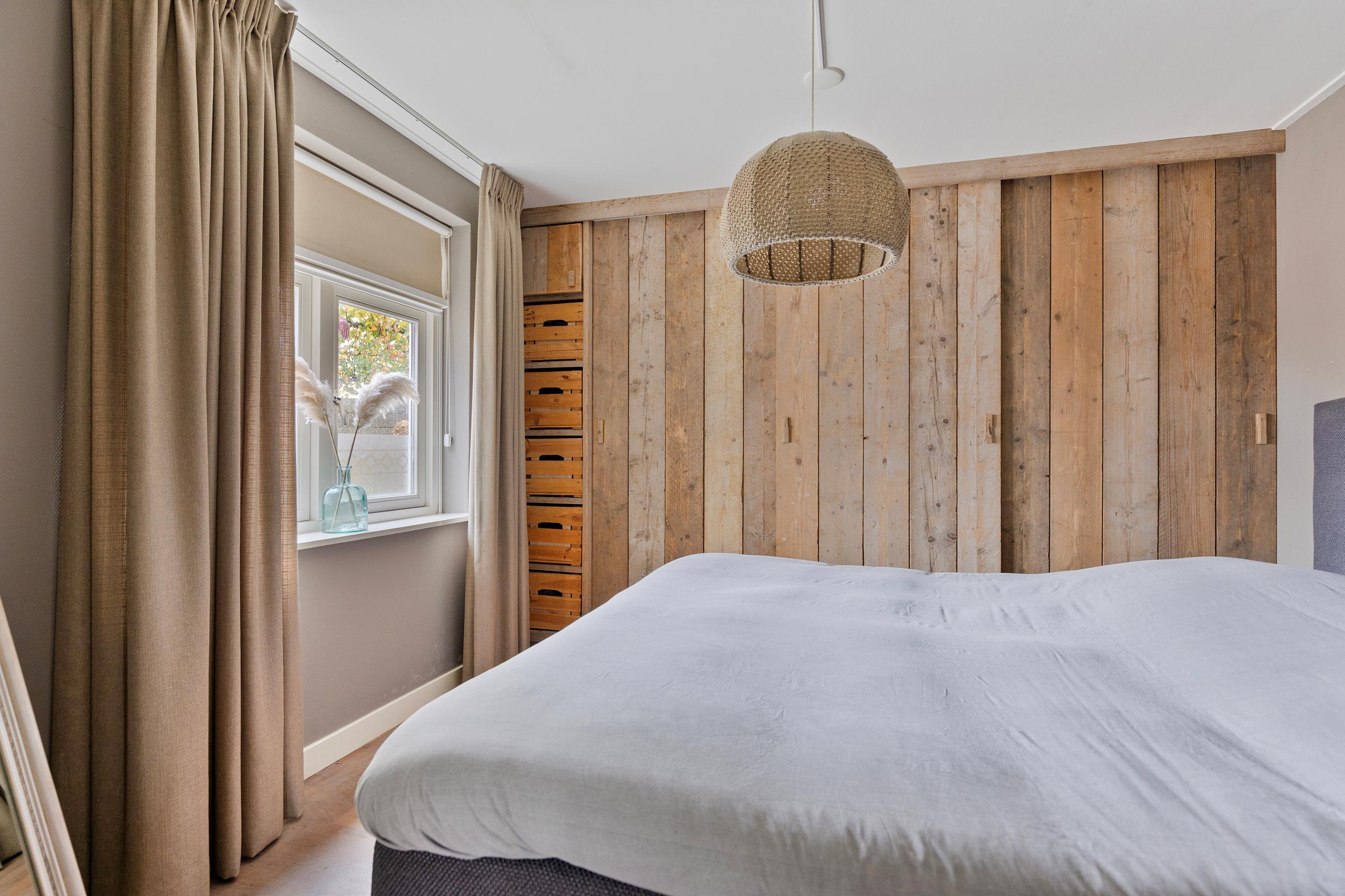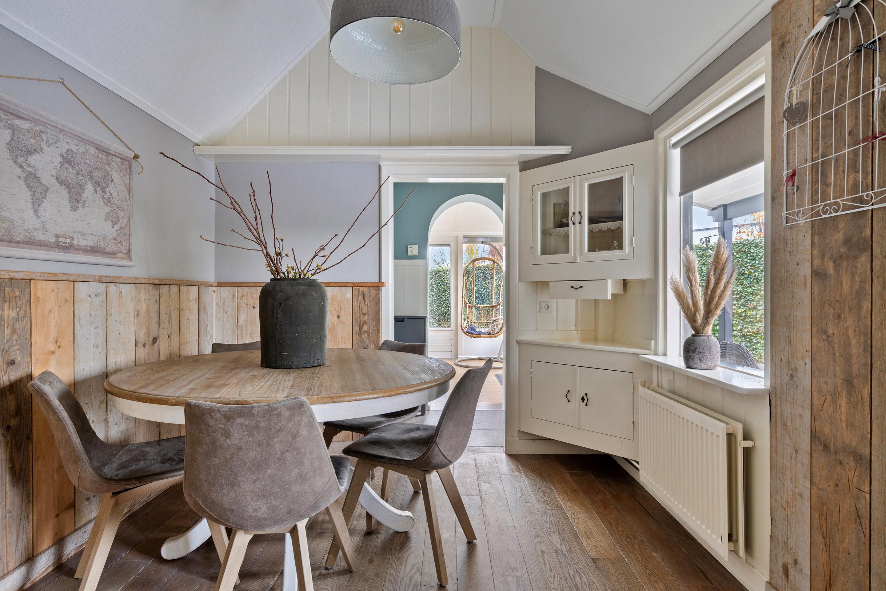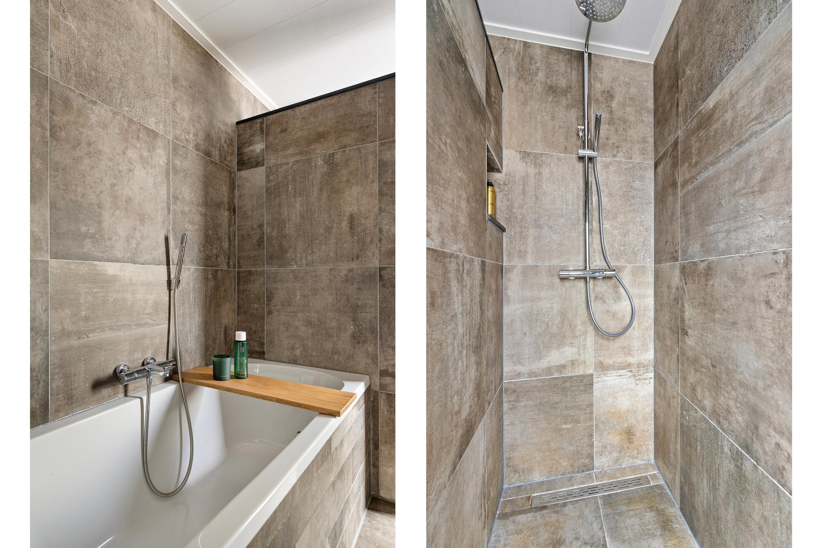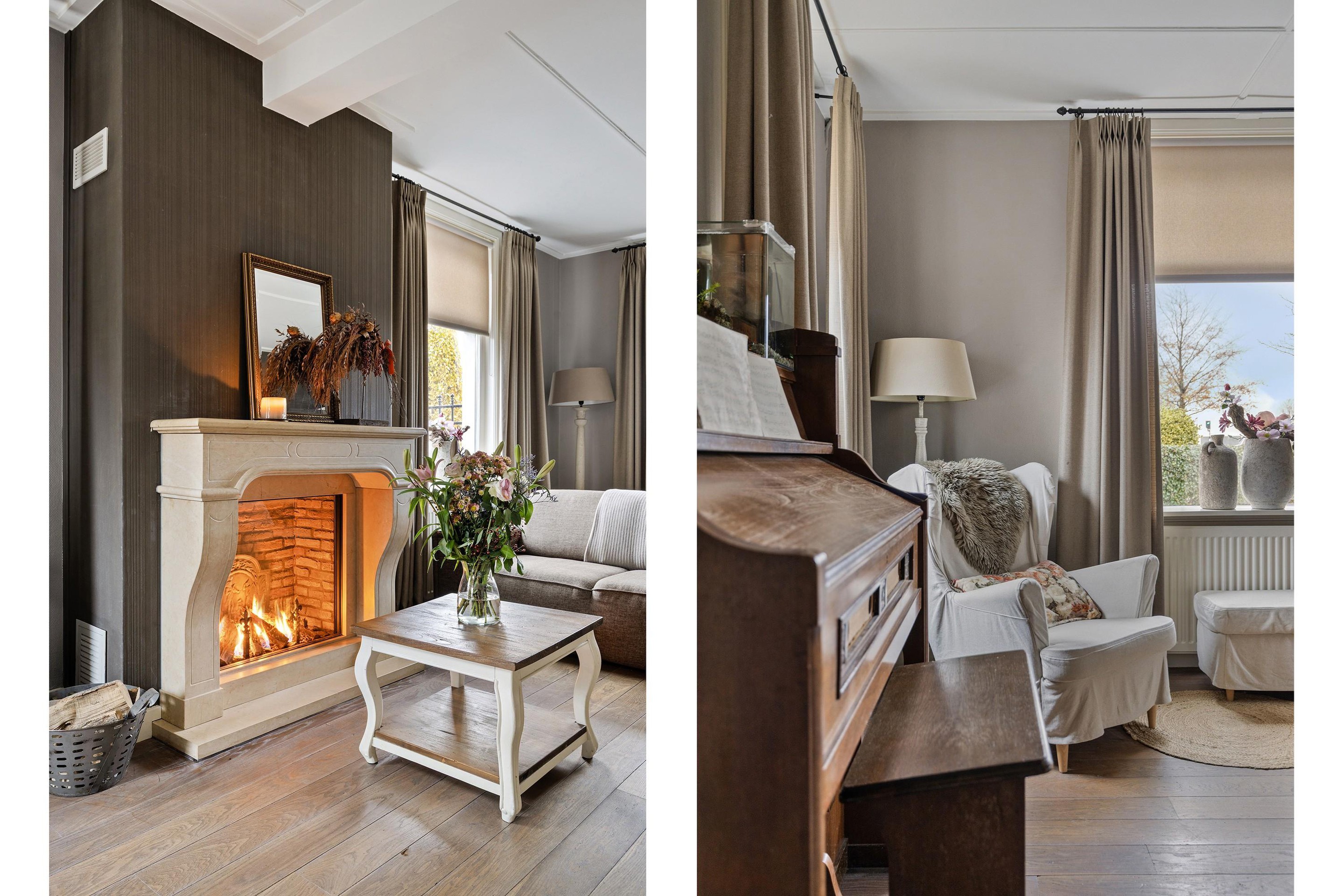 Begane grond De woonkamer is sfeervol ingericht met een gashaard en schouw als middelpunt. De massief eikenhouten vloer geeft de ruimte een fijne, natuurlijke uitstraling. Aangrenzend ligt een praktische speel- of werkkamer, perfect voor thuiswerken, hobby’s of juist een rustige plek voor kinderen. De keuken is ingericht met een hoekopstelling voorzien van inbouwapparatuur. Onder de trap bevindt zich een praktische provisiekast en vanuit de keuken neem je de trap naar de eerste verdieping. Grenzend aan de keuken ligt de eetkamer met een diepe inbouwkast én een deur naar het overdekte terras naast de woning. Het toilet is modern uitgevoerd als zwevend model met fonteintje. Dankzij de uitbouw vind je op de begane grond een ruime slaapkamer met kastenwand én een moderne badkamer. Deze badkamer is ingericht met een ligbad, inloopdouche, wastafelmeubel met twee waskommen en ingebouwde kranen. Ook de witgoedaansluitingen zitten hier praktisch verwerkt. Aan de achterzijde bevindt zich de lichte tuinkamer met veel ramen, openslaande deuren en prachtig zicht op de diepe tuin, een heerlijke plek om elk seizoen binnen met buiten te verbinden.