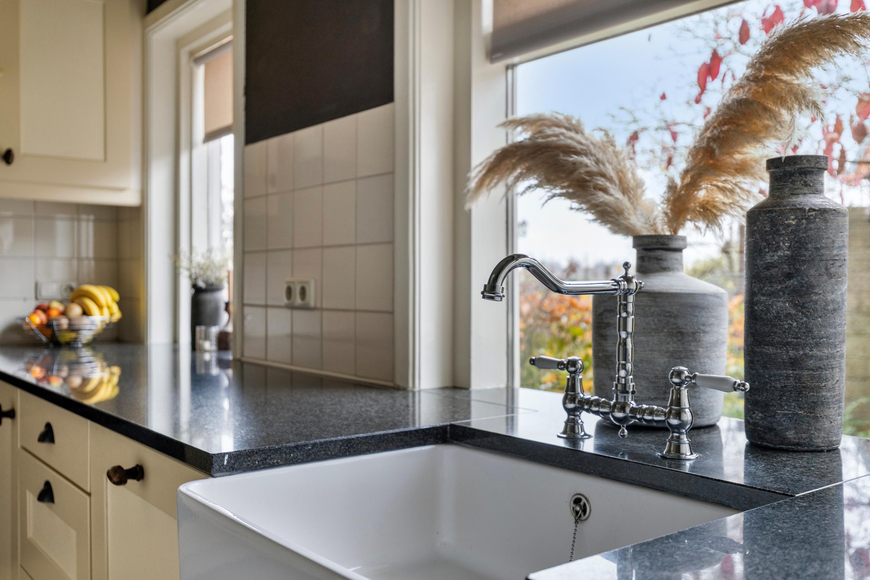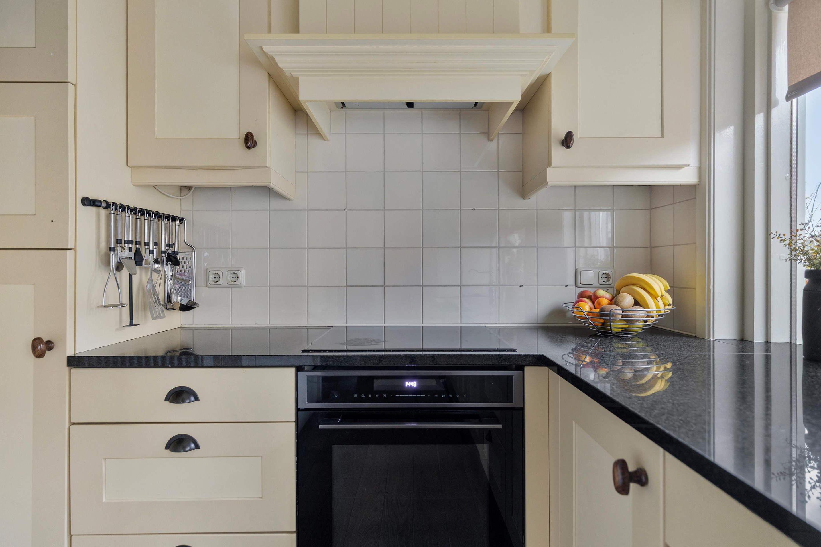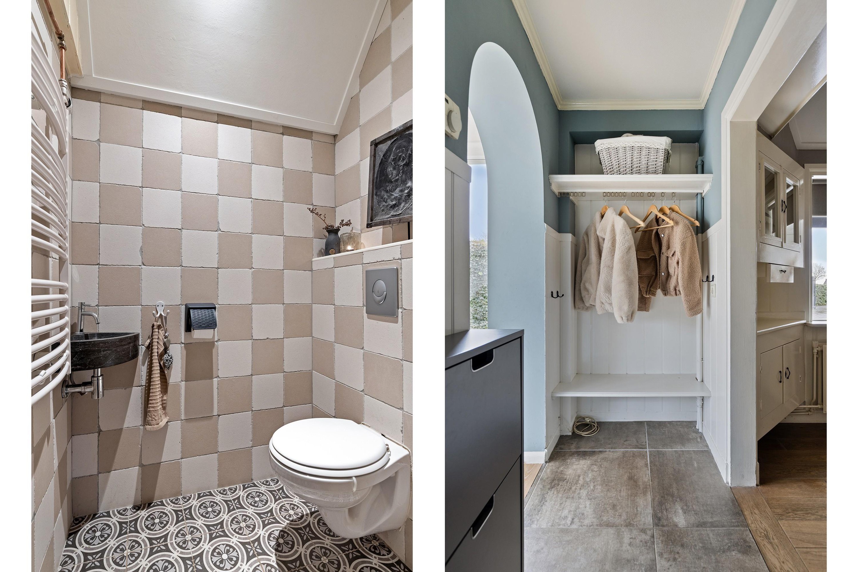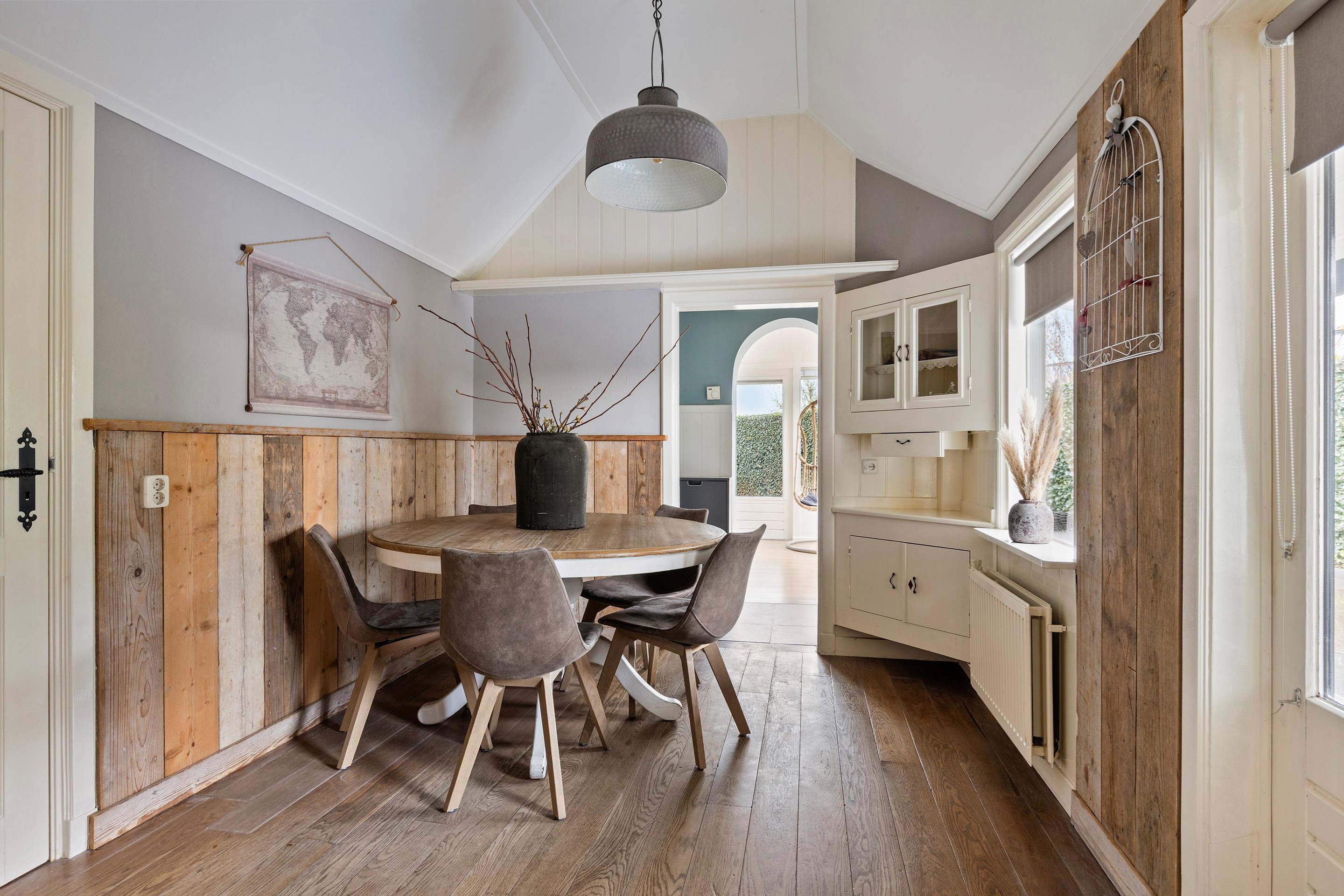Begane grond De woonkamer is sfeervol ingericht met een gashaard en schouw als middelpunt. De massief eikenhouten vloer geeft de ruimte een fijne, natuurlijke uitstraling. Aangrenzend ligt een praktische speel- of werkkamer, perfect voor thuiswerken, hobby’s of juist een rustige plek voor kinderen. De keuken is ingericht met een hoekopstelling voorzien van inbouwapparatuur. Onder de trap bevindt zich een praktische provisiekast en vanuit de keuken neem je de trap naar de eerste verdieping. Grenzend aan de keuken ligt de eetkamer met een diepe inbouwkast én een deur naar het overdekte terras naast de woning. Het toilet is modern uitgevoerd als zwevend model met fonteintje. Dankzij de uitbouw vind je op de begane grond een ruime slaapkamer met kastenwand én een moderne badkamer. Deze badkamer is ingericht met een ligbad, inloopdouche, wastafelmeubel met twee waskommen en ingebouwde kranen. Ook de witgoedaansluitingen zitten hier praktisch verwerkt. Aan de achterzijde bevindt zich de lichte tuinkamer met veel ramen, openslaande deuren en prachtig zicht op de diepe tuin, een heerlijke plek om elk seizoen binnen met buiten te verbinden.