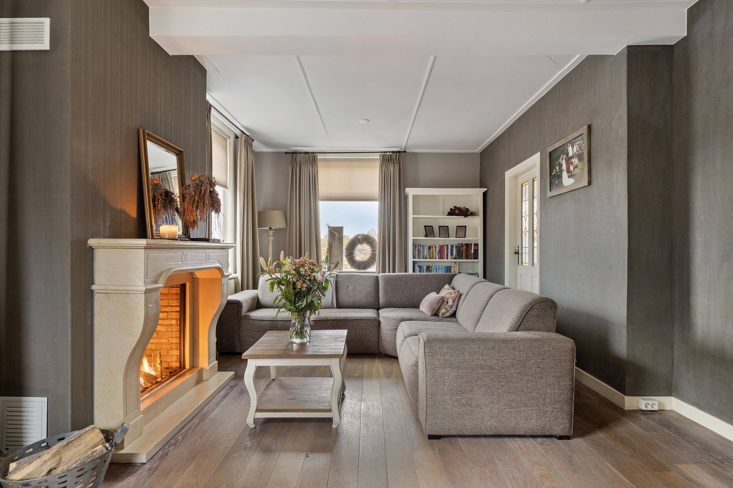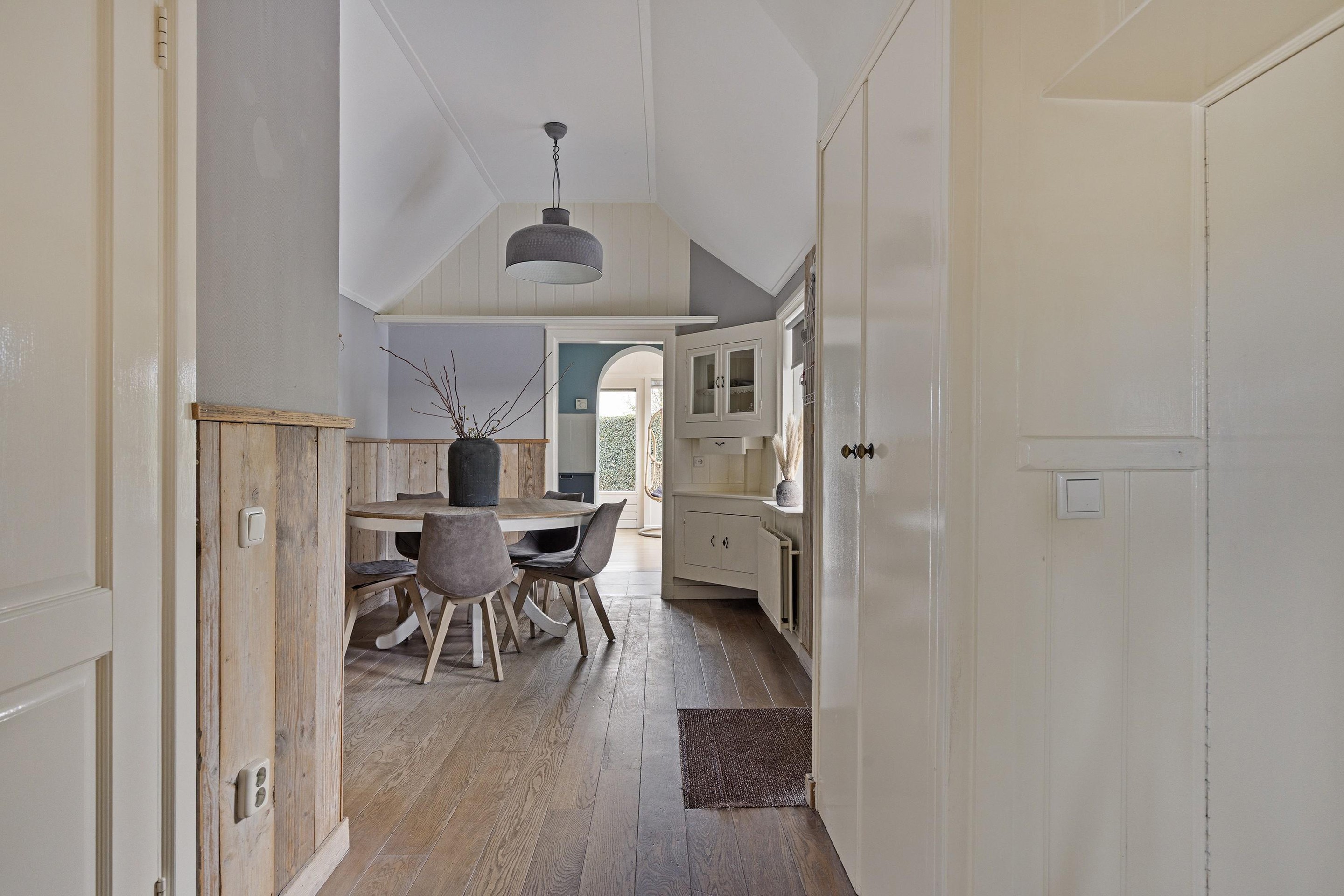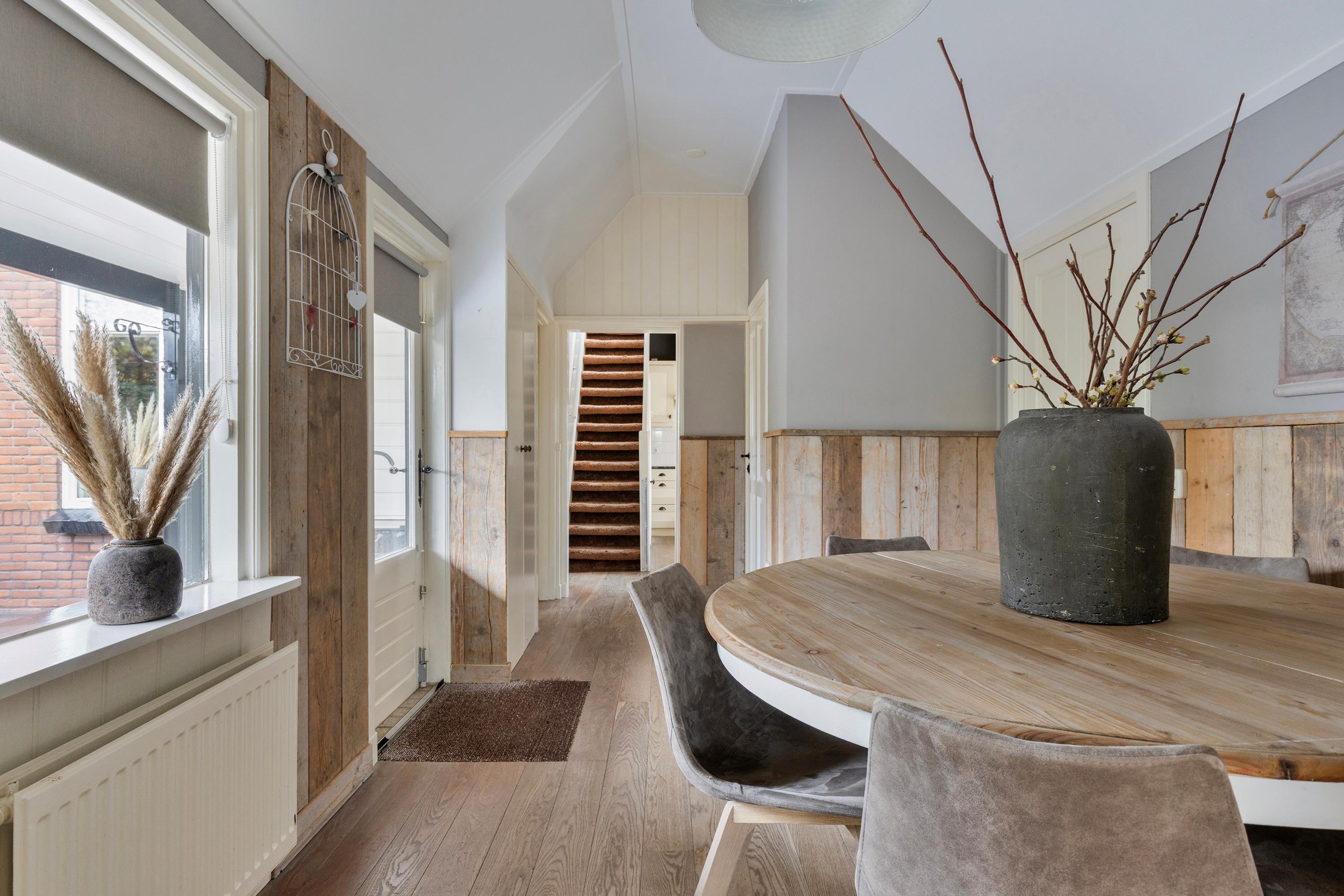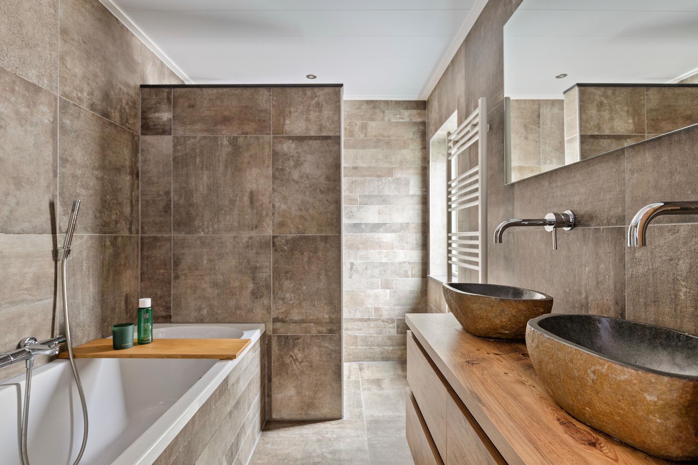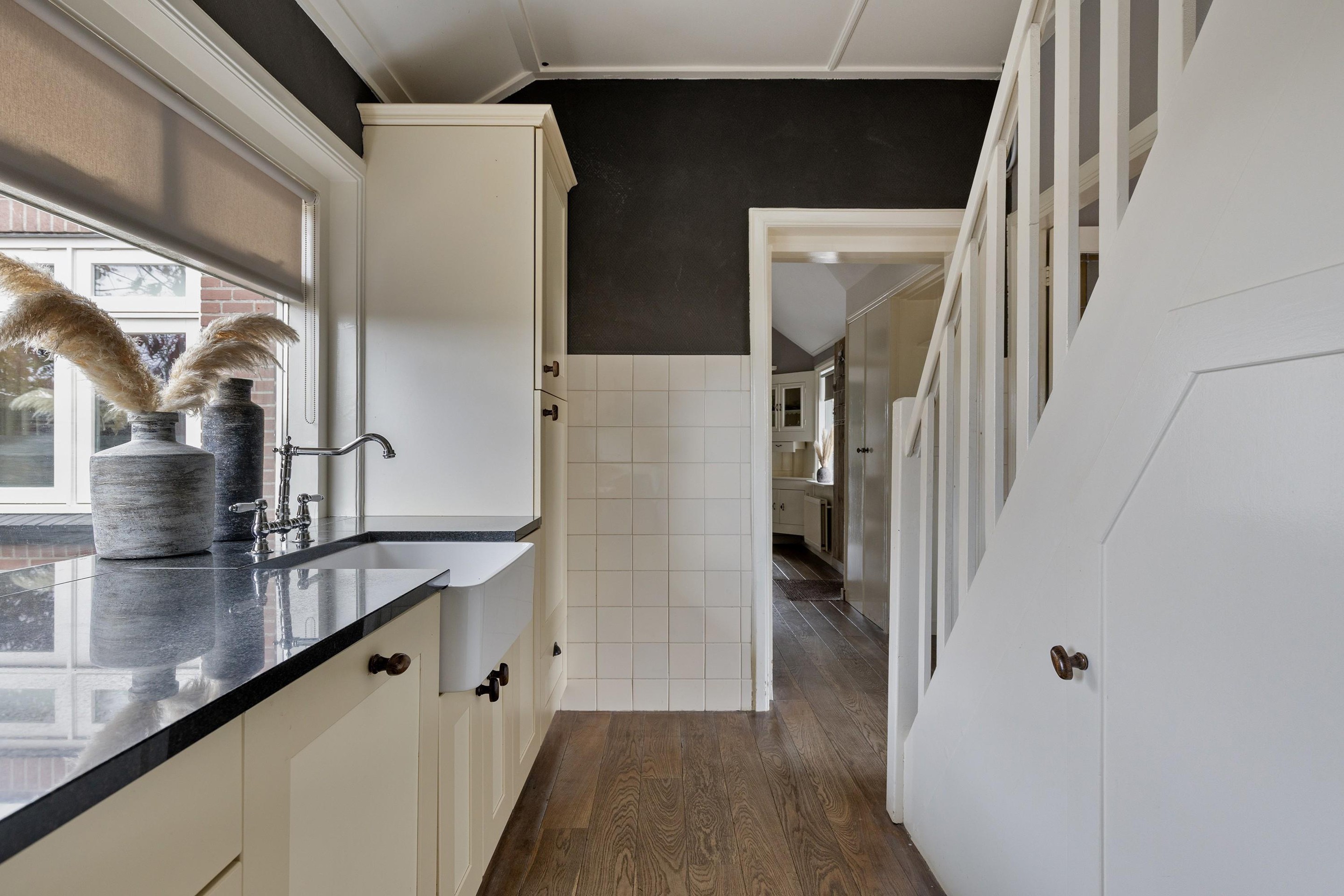 Begane grond De woonkamer is sfeervol ingericht met een gashaard en schouw als middelpunt. De massief eikenhouten vloer geeft de ruimte een fijne, natuurlijke uitstraling. Aangrenzend ligt een praktische speel- of werkkamer, perfect voor thuiswerken, hobby’s of juist een rustige plek voor kinderen. De keuken is ingericht met een hoekopstelling voorzien van inbouwapparatuur. Onder de trap bevindt zich een praktische provisiekast en vanuit de keuken neem je de trap naar de eerste verdieping. Grenzend aan de keuken ligt de eetkamer met een diepe inbouwkast én een deur naar het overdekte terras naast de woning. Het toilet is modern uitgevoerd als zwevend model met fonteintje. Dankzij de uitbouw vind je op de begane grond een ruime slaapkamer met kastenwand én een moderne badkamer. Deze badkamer is ingericht met een ligbad, inloopdouche, wastafelmeubel met twee waskommen en ingebouwde kranen. Ook de witgoedaansluitingen zitten hier praktisch verwerkt. Aan de achterzijde bevindt zich de lichte tuinkamer met veel ramen, openslaande deuren en prachtig zicht op de diepe tuin, een heerlijke plek om elk seizoen binnen met buiten te verbinden.