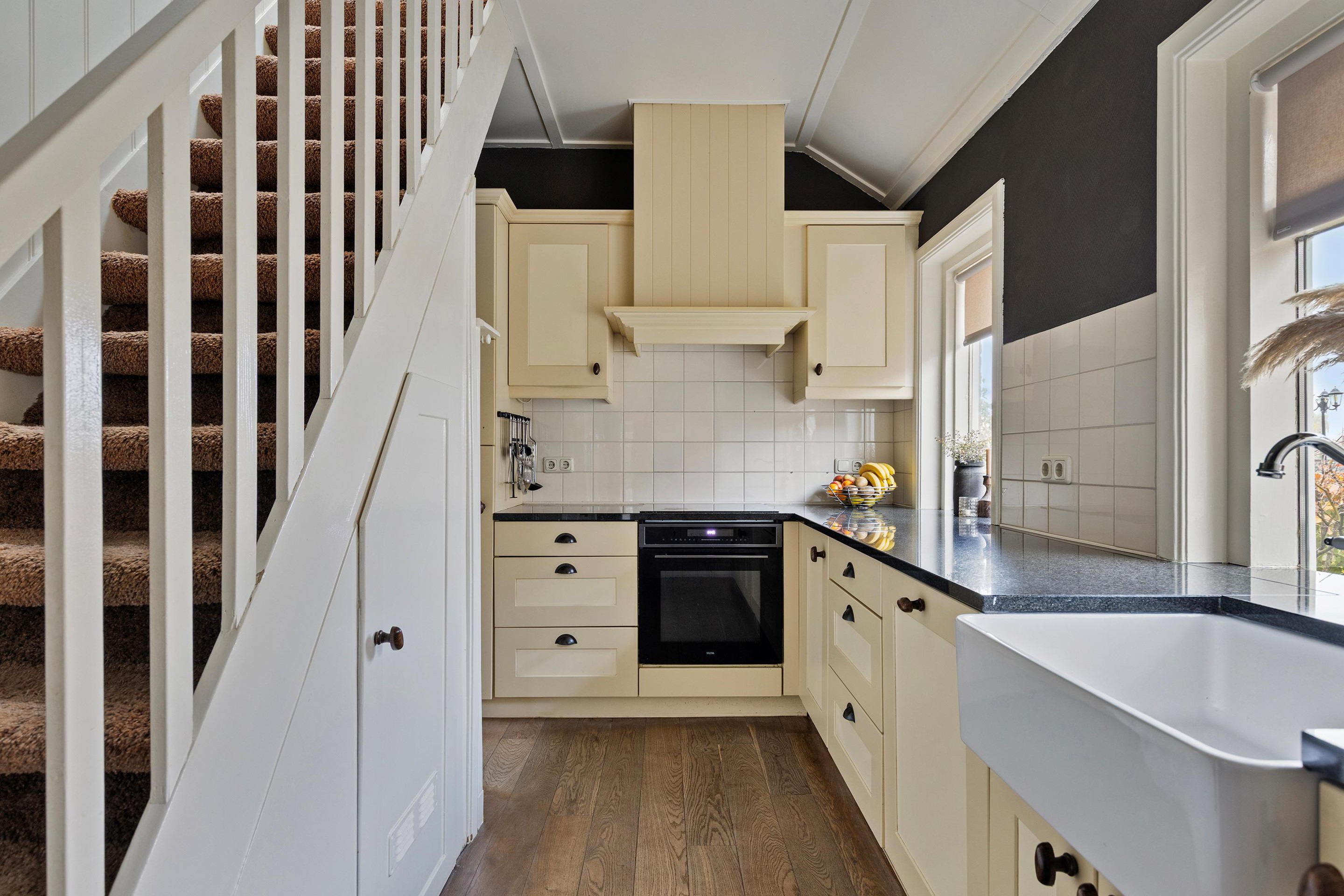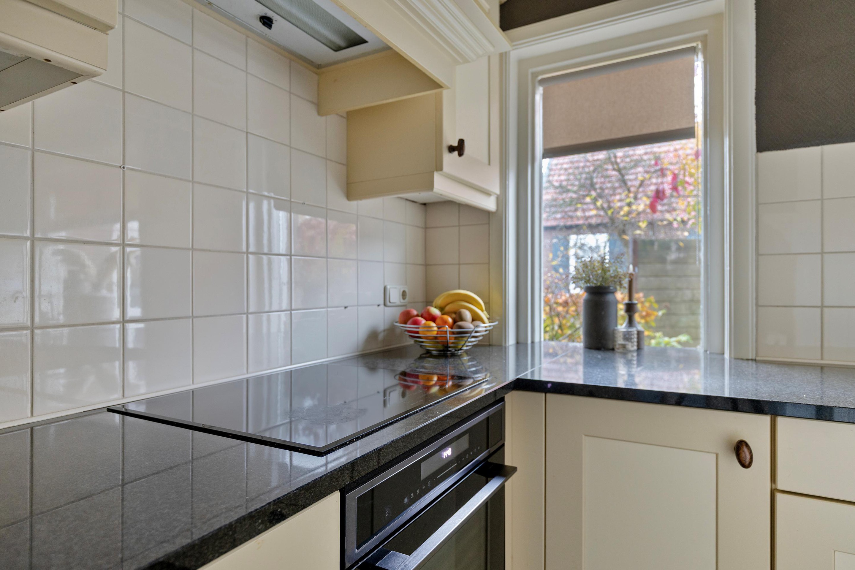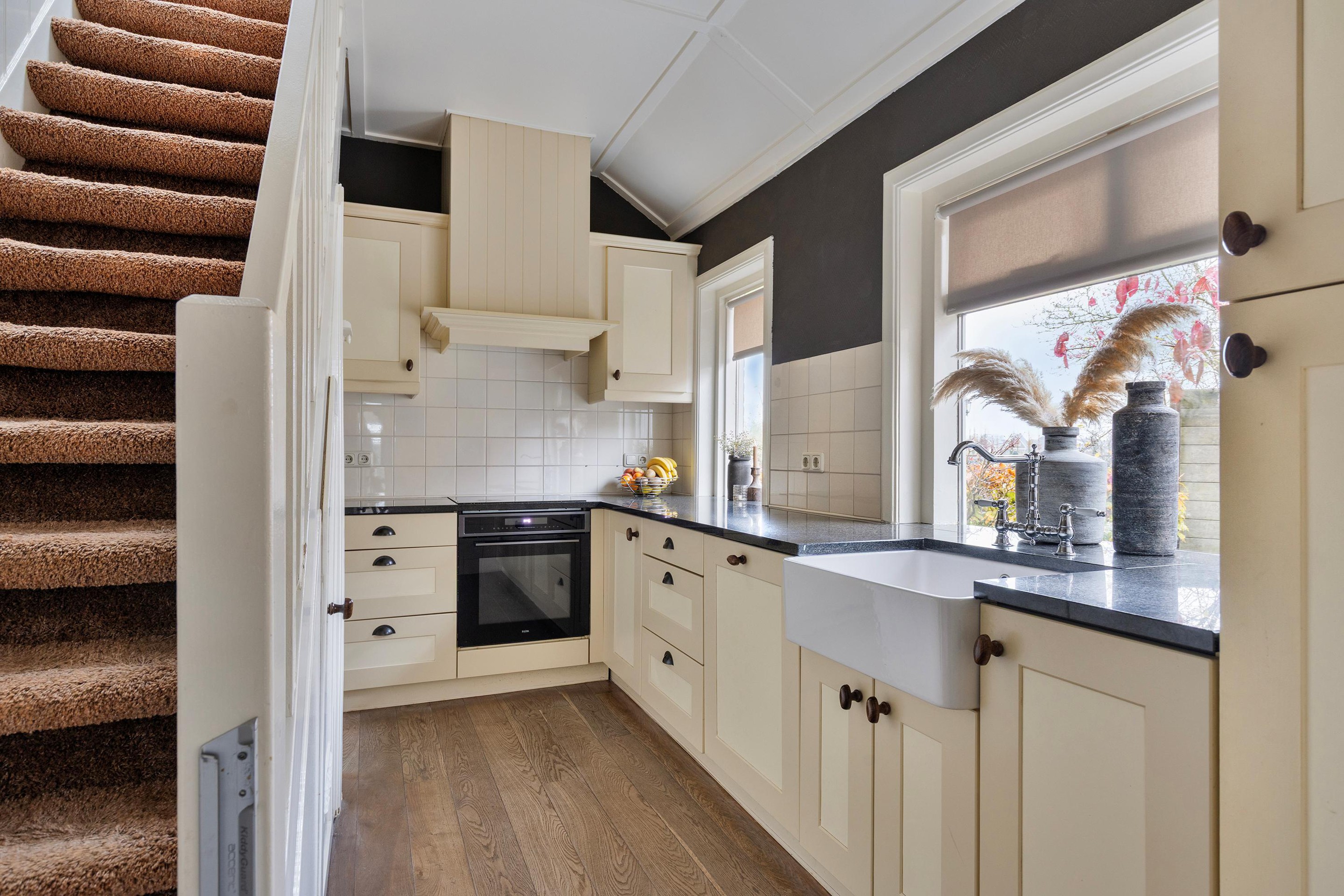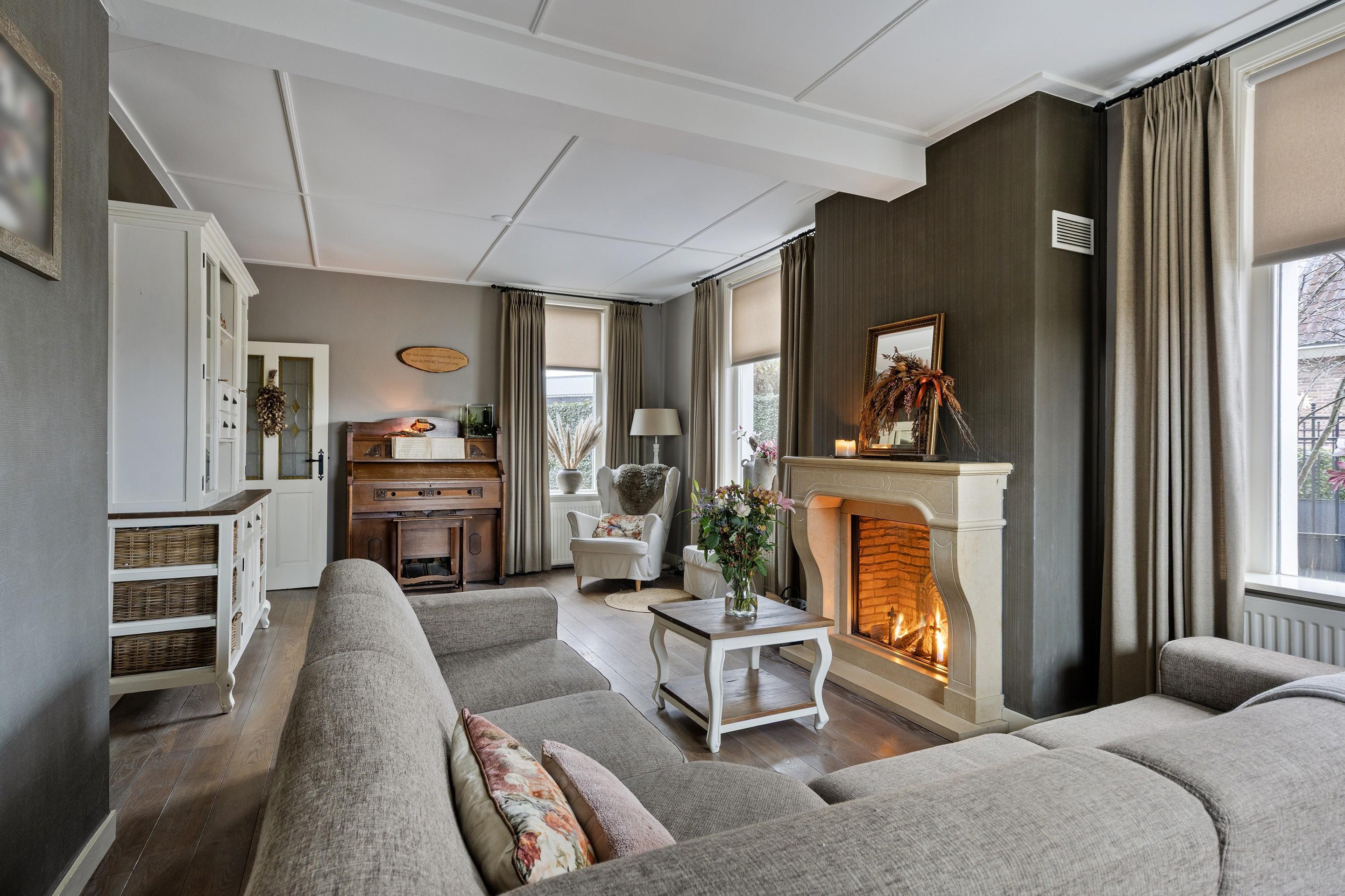 Begane grond De woonkamer is sfeervol ingericht met een gashaard en schouw als middelpunt. De massief eikenhouten vloer geeft de ruimte een fijne, natuurlijke uitstraling. Aangrenzend ligt een praktische speel- of werkkamer, perfect voor thuiswerken, hobby’s of juist een rustige plek voor kinderen. De keuken is ingericht met een hoekopstelling voorzien van inbouwapparatuur. Onder de trap bevindt zich een praktische provisiekast en vanuit de keuken neem je de trap naar de eerste verdieping. Grenzend aan de keuken ligt de eetkamer met een diepe inbouwkast én een deur naar het overdekte terras naast de woning. Het toilet is modern uitgevoerd als zwevend model met fonteintje. Dankzij de uitbouw vind je op de begane grond een ruime slaapkamer met kastenwand én een moderne badkamer. Deze badkamer is ingericht met een ligbad, inloopdouche, wastafelmeubel met twee waskommen en ingebouwde kranen. Ook de witgoedaansluitingen zitten hier praktisch verwerkt. Aan de achterzijde bevindt zich de lichte tuinkamer met veel ramen, openslaande deuren en prachtig zicht op de diepe tuin, een heerlijke plek om elk seizoen binnen met buiten te verbinden.