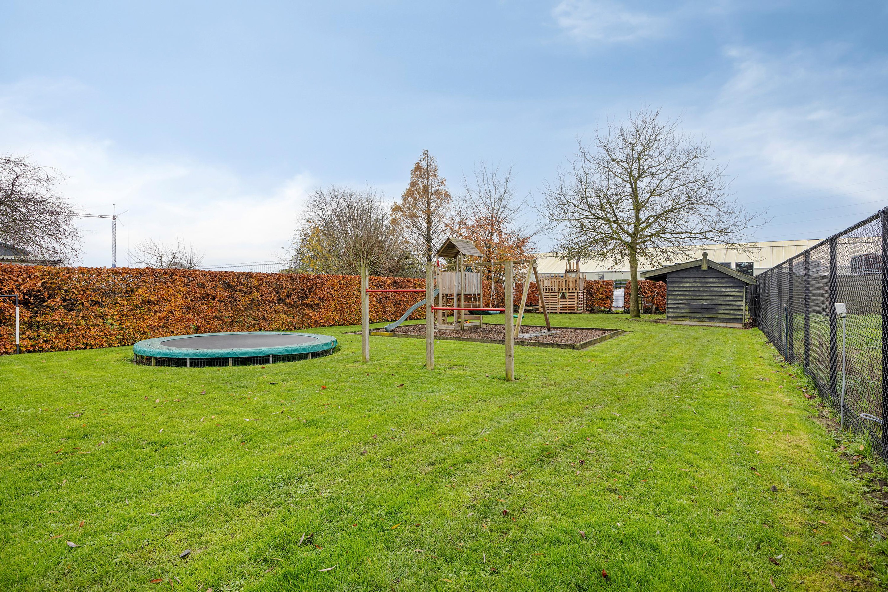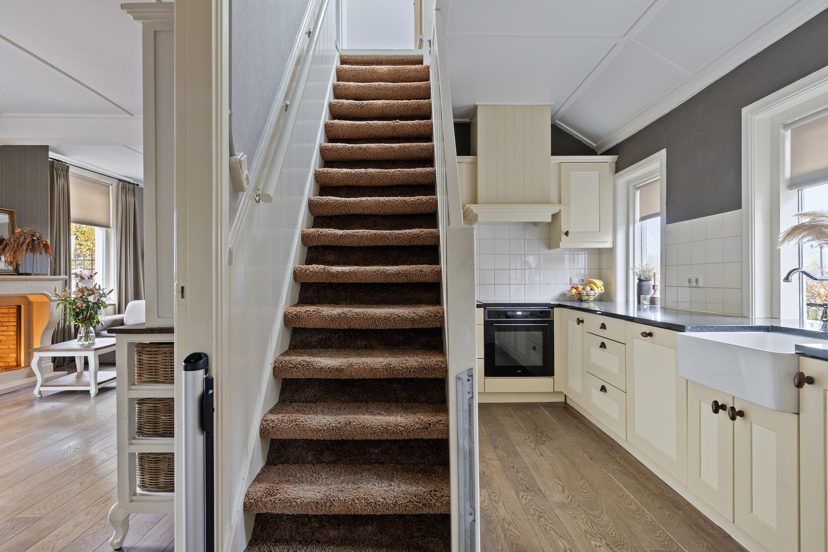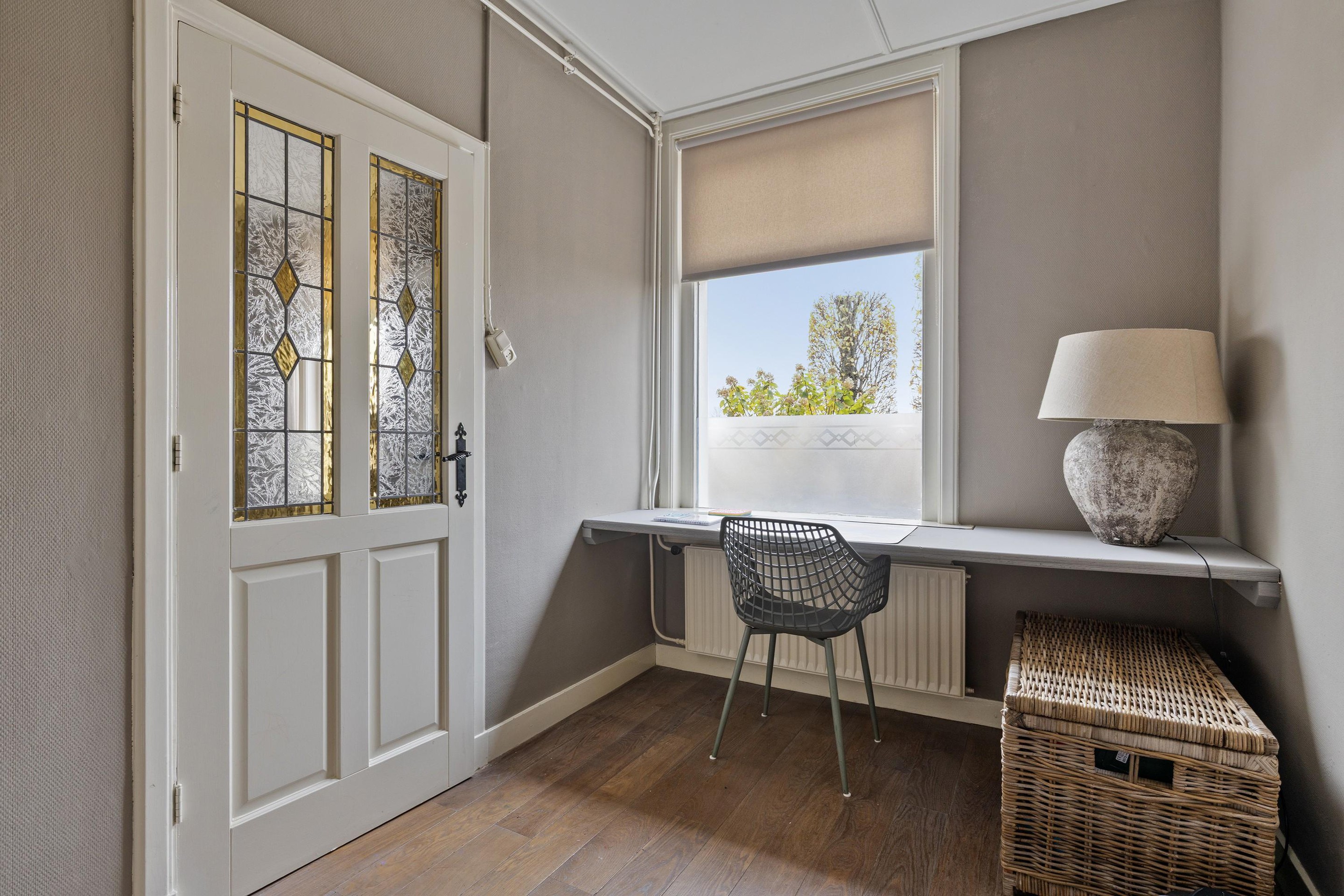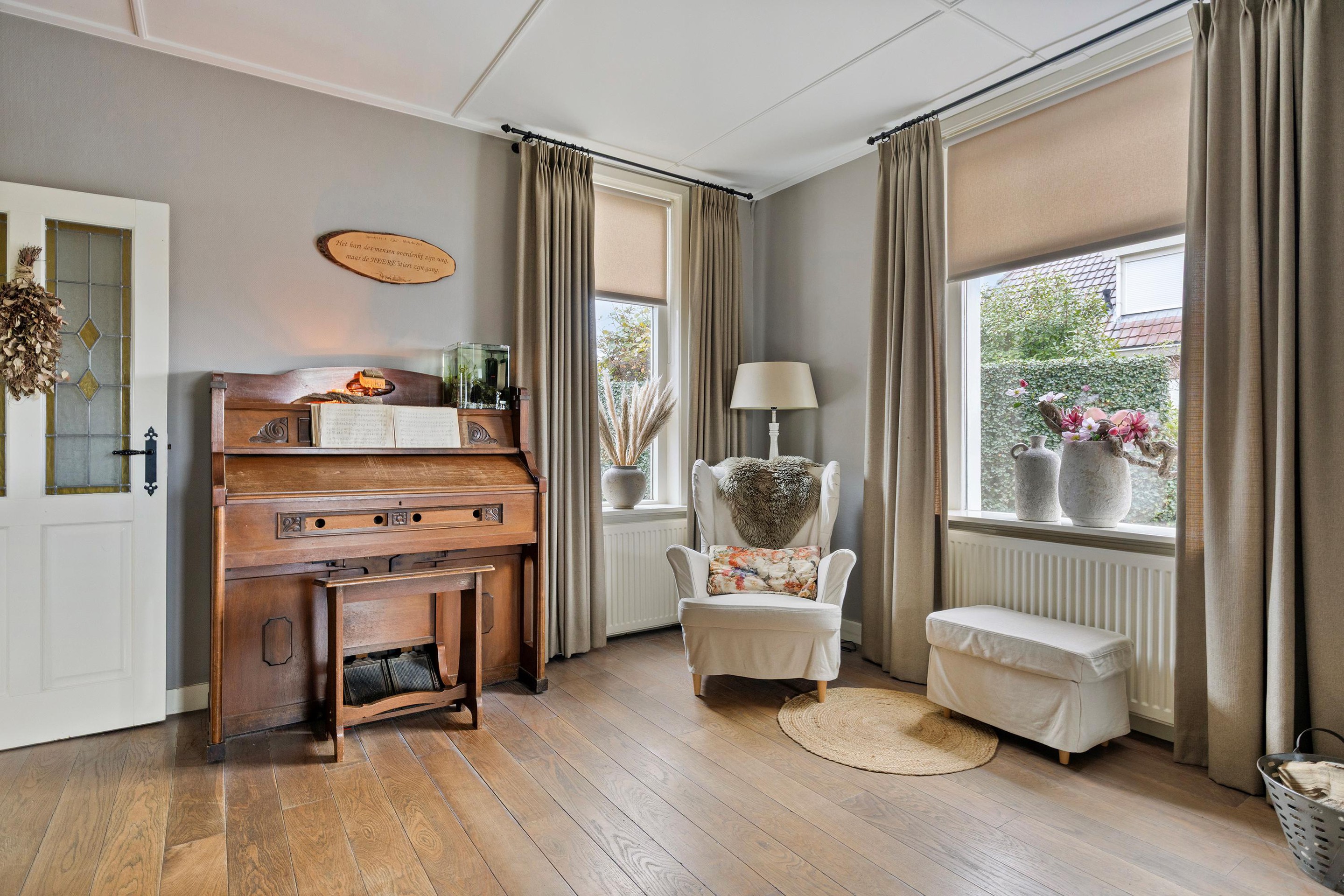 Begane grond De woonkamer is sfeervol ingericht met een gashaard en schouw als middelpunt. De massief eikenhouten vloer geeft de ruimte een fijne, natuurlijke uitstraling. Aangrenzend ligt een praktische speel- of werkkamer, perfect voor thuiswerken, hobby’s of juist een rustige plek voor kinderen. De keuken is ingericht met een hoekopstelling voorzien van inbouwapparatuur. Onder de trap bevindt zich een praktische provisiekast en vanuit de keuken neem je de trap naar de eerste verdieping. Grenzend aan de keuken ligt de eetkamer met een diepe inbouwkast én een deur naar het overdekte terras naast de woning. Het toilet is modern uitgevoerd als zwevend model met fonteintje. Dankzij de uitbouw vind je op de begane grond een ruime slaapkamer met kastenwand én een moderne badkamer. Deze badkamer is ingericht met een ligbad, inloopdouche, wastafelmeubel met twee waskommen en ingebouwde kranen. Ook de witgoedaansluitingen zitten hier praktisch verwerkt. Aan de achterzijde bevindt zich de lichte tuinkamer met veel ramen, openslaande deuren en prachtig zicht op de diepe tuin, een heerlijke plek om elk seizoen binnen met buiten te verbinden.