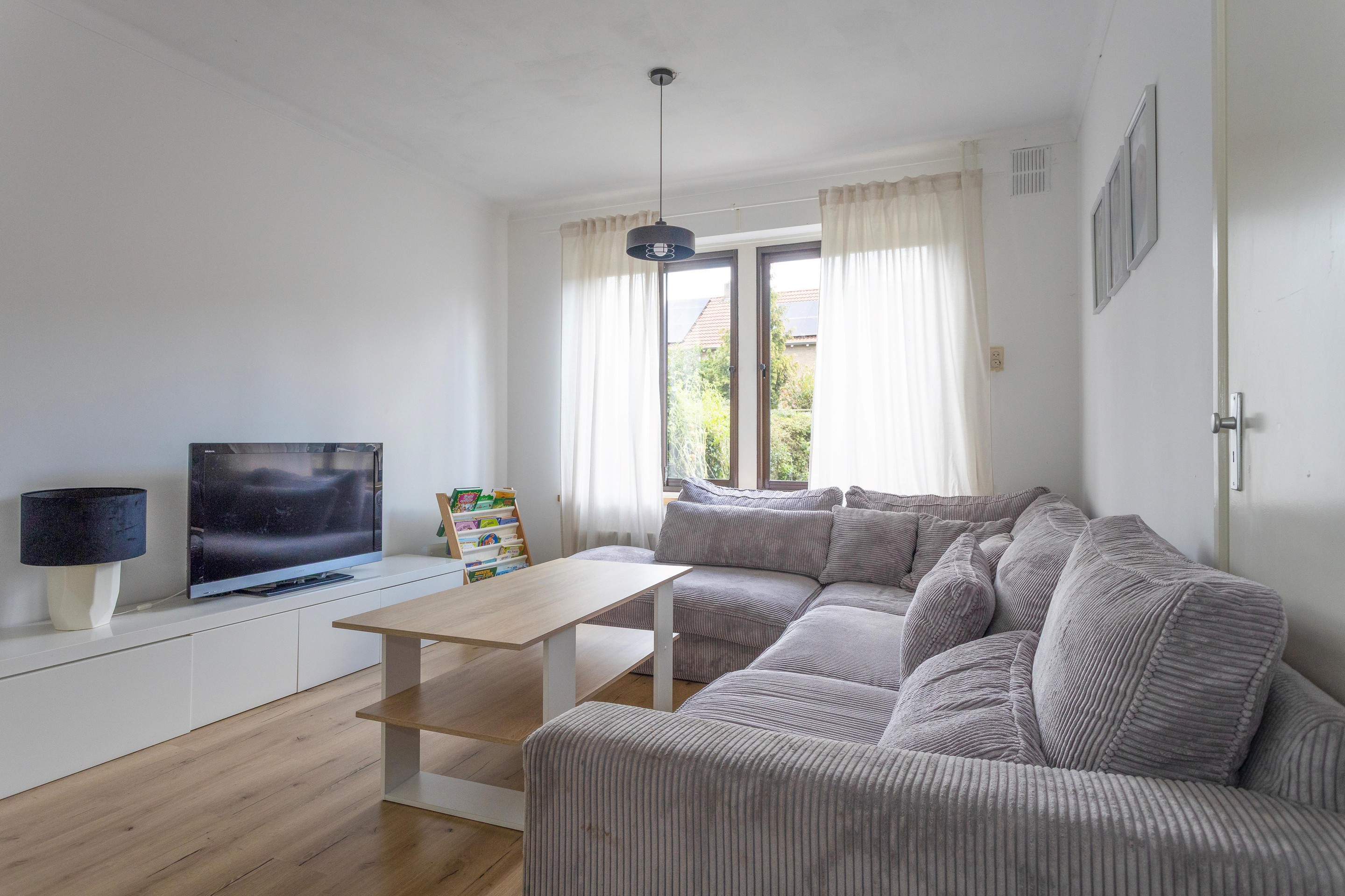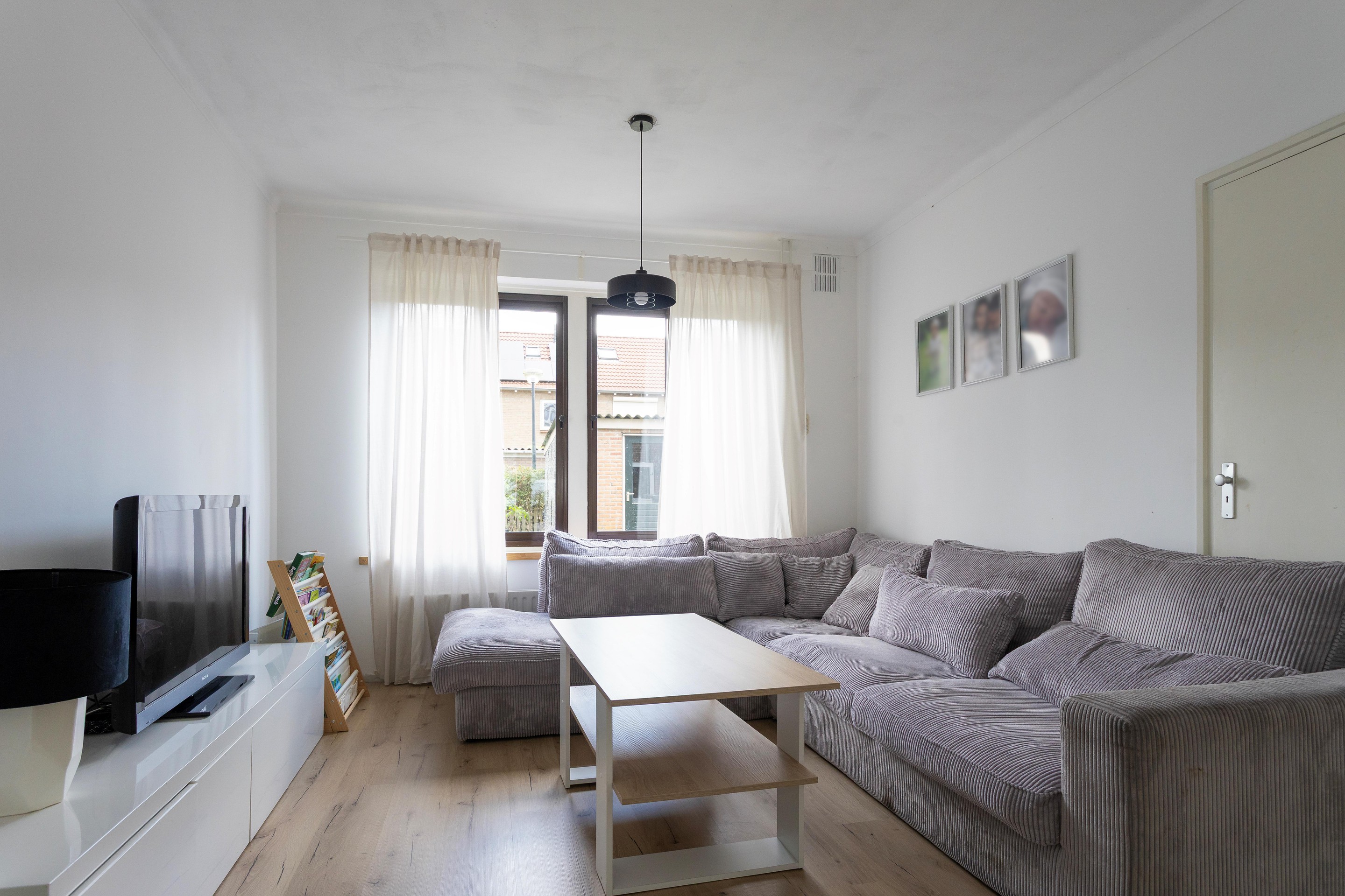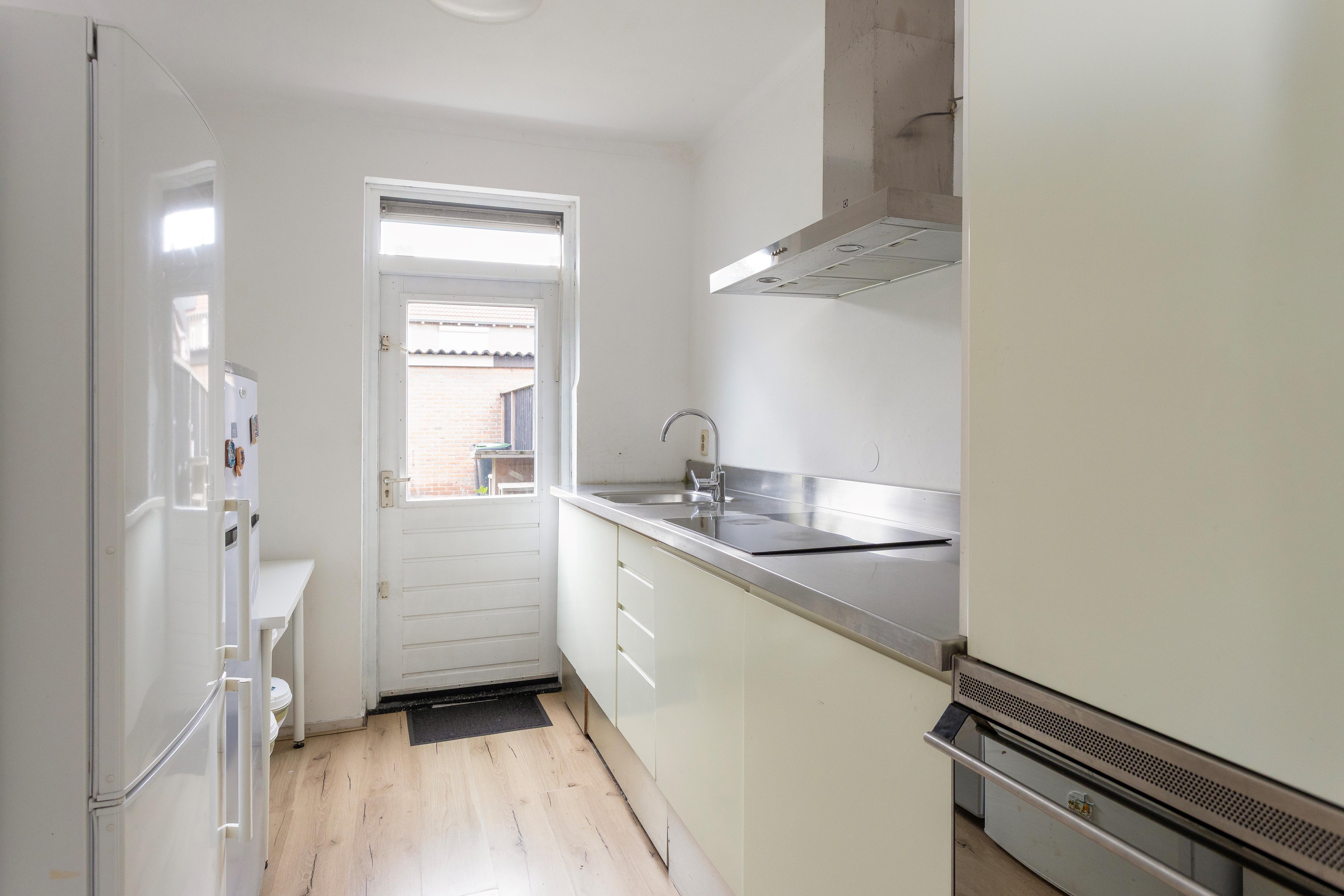 De entree biedt toegang tot de hal van de woning. In de hal vindt u de meterkast (7 groepen, kookgroep en 2 aardlekschakelaars), een kelderkast, de trapopgang naar de eerste verdieping en de toiletruimte. Via de hal komt u in de woonkamer en de keuken. In de doorzonwoonkamer is voldoende ruimte voor het plaatsen van zowel een zit- als een eethoek. Door de grote ramen in de woonkamer is er veel lichtinval. De keuken is ingericht met een modern keukenmeubel in een witte kleur met een rvs werkblad, v.v. een inductiekookplaat, afzuigkap, magnetron en vaatwasser. Er is voldoende ruimte voor plaatsen koelkast en vriezer, ook is de keuken v.v. een vaste inbouwkast. Alle plafonds en wanden op de begane grond zijn voorzien van stucwerk, op de vloeren ligt laminaat (2023 nieuw) met een houtprint.