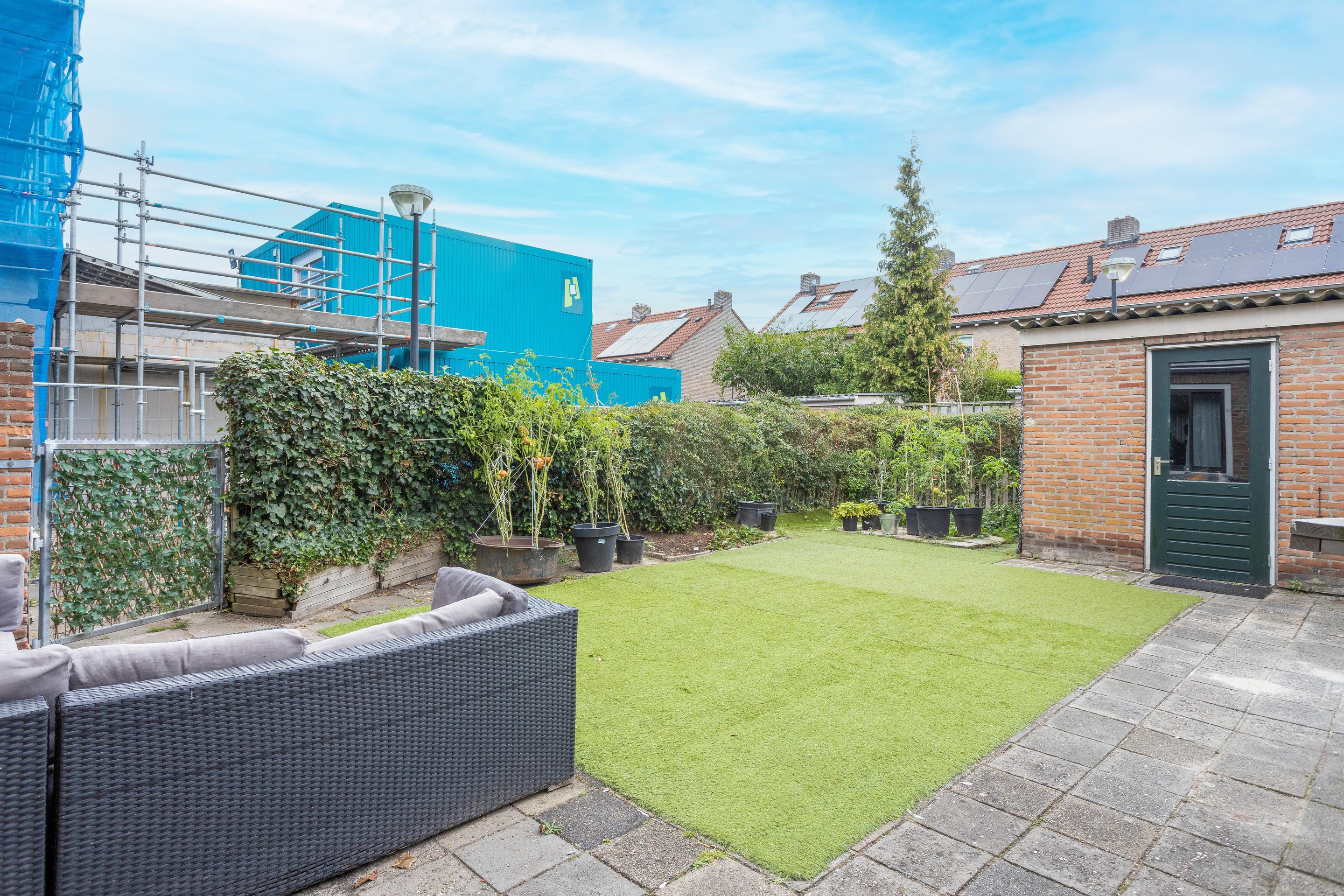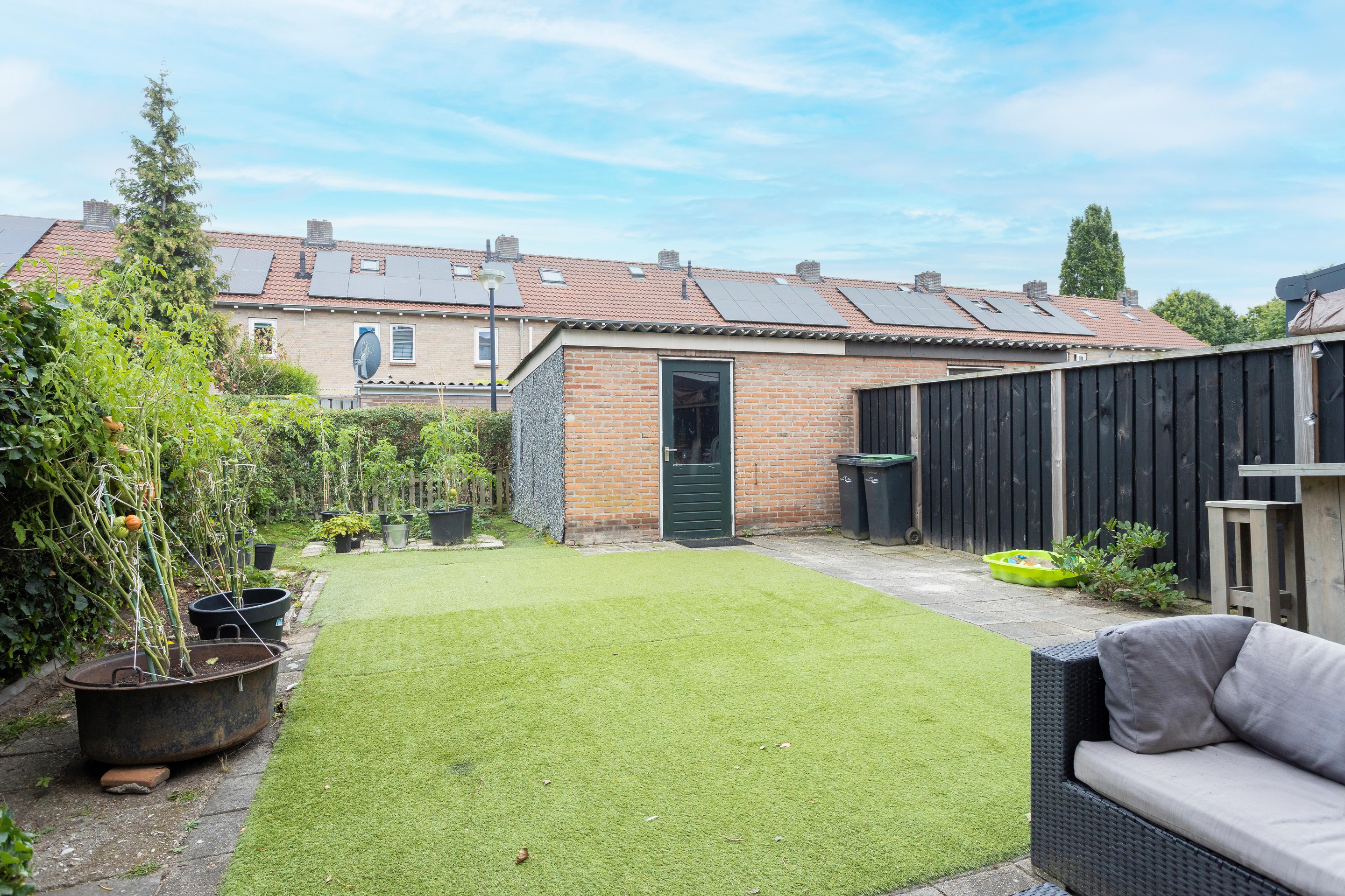 De op het zuiden/zuid-oosten gelegen achtertuin is keurig aangelegd met sierbestrating, gras en perken en is te bereiken via een eigen achterom en v.v. een stenen berging, een fijne plek om van de zon en rust te genieten.