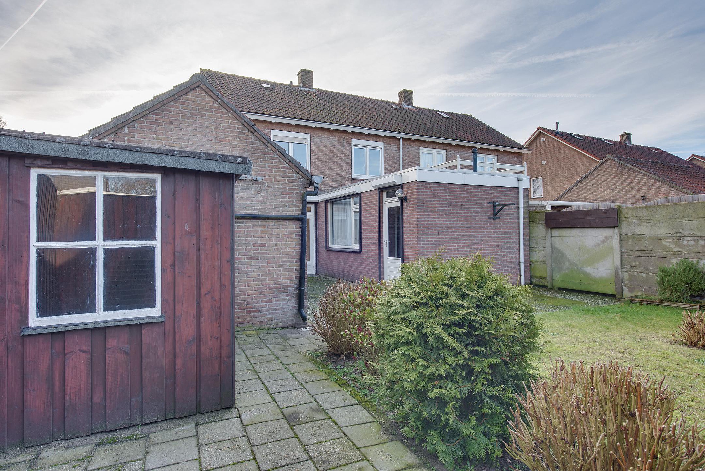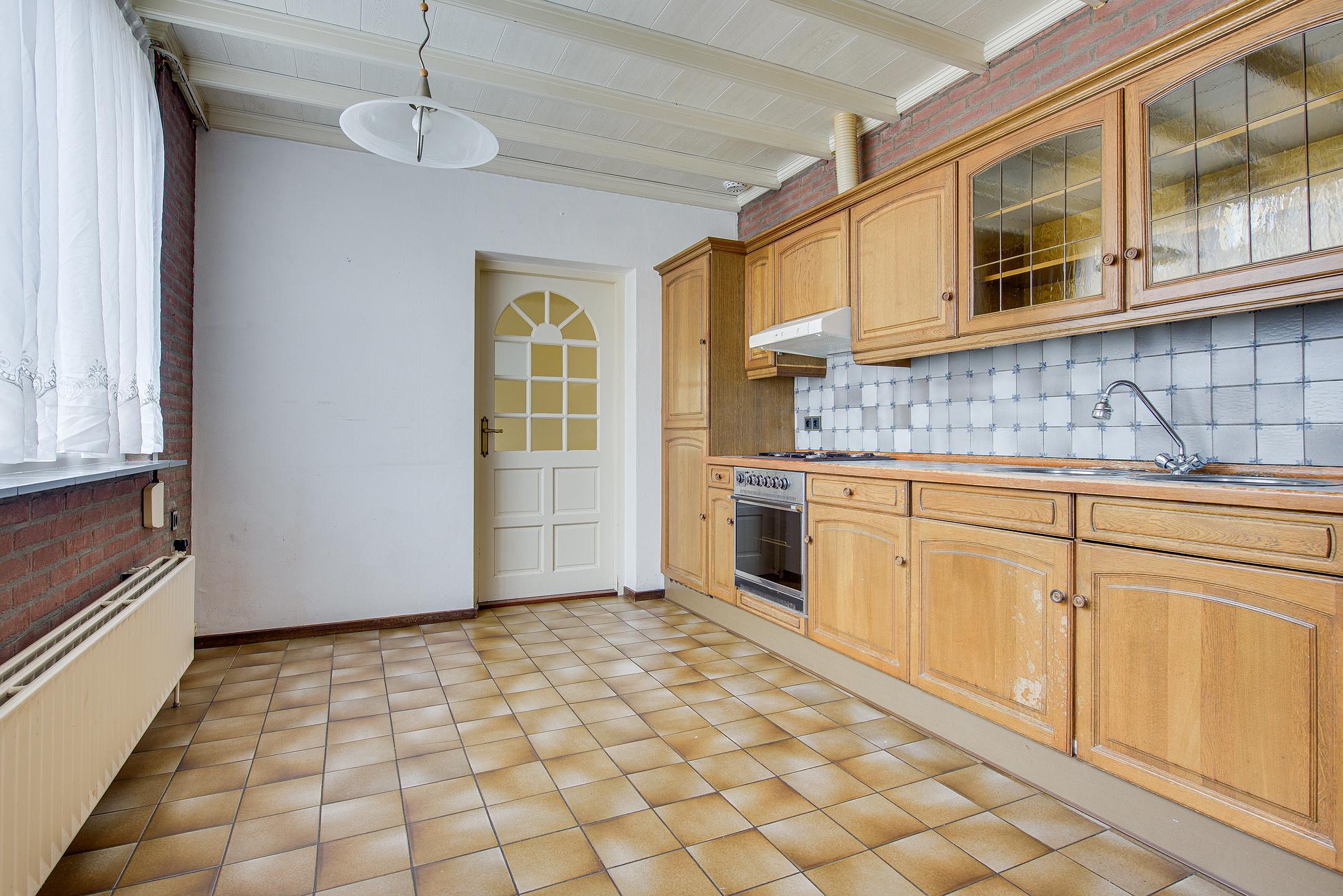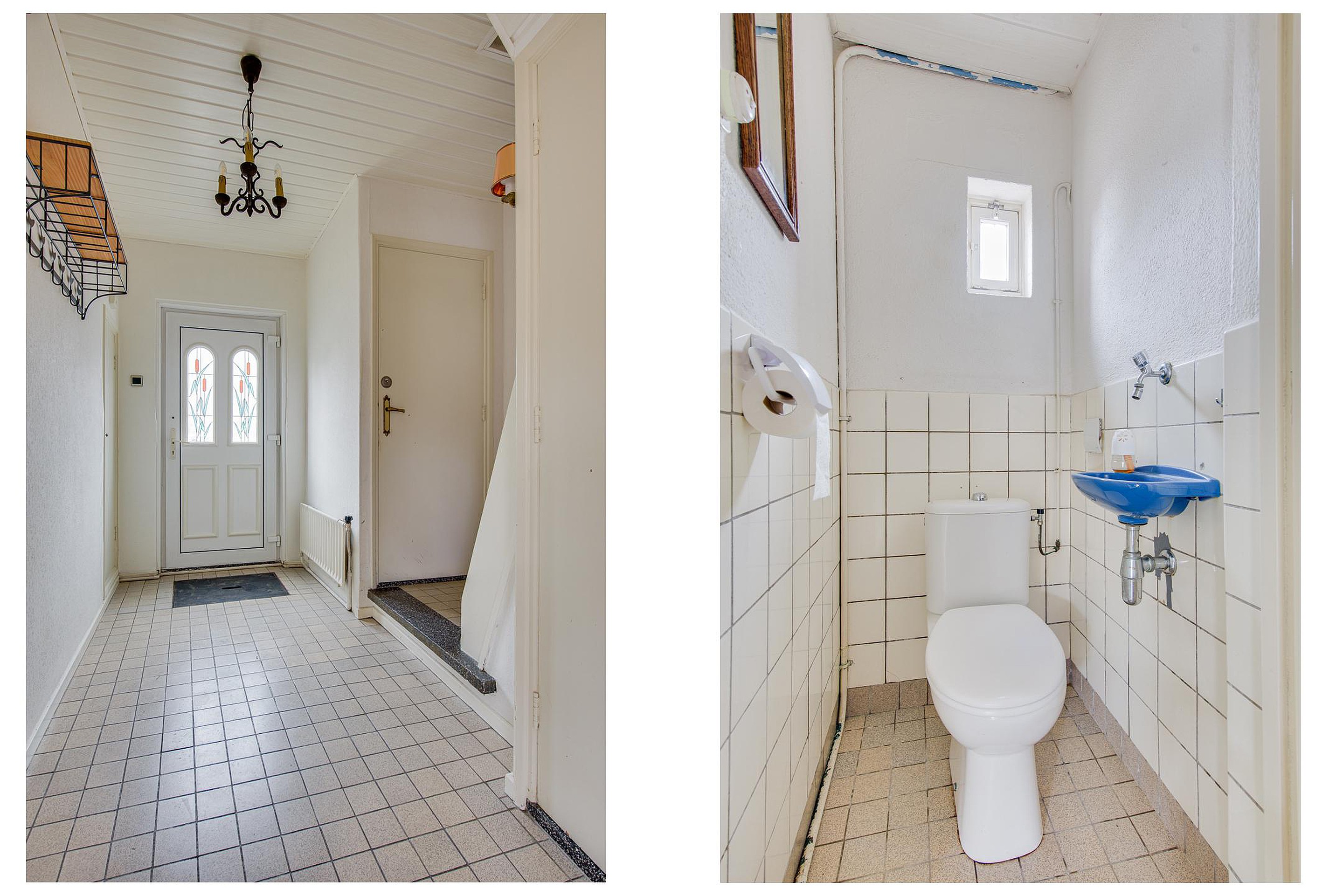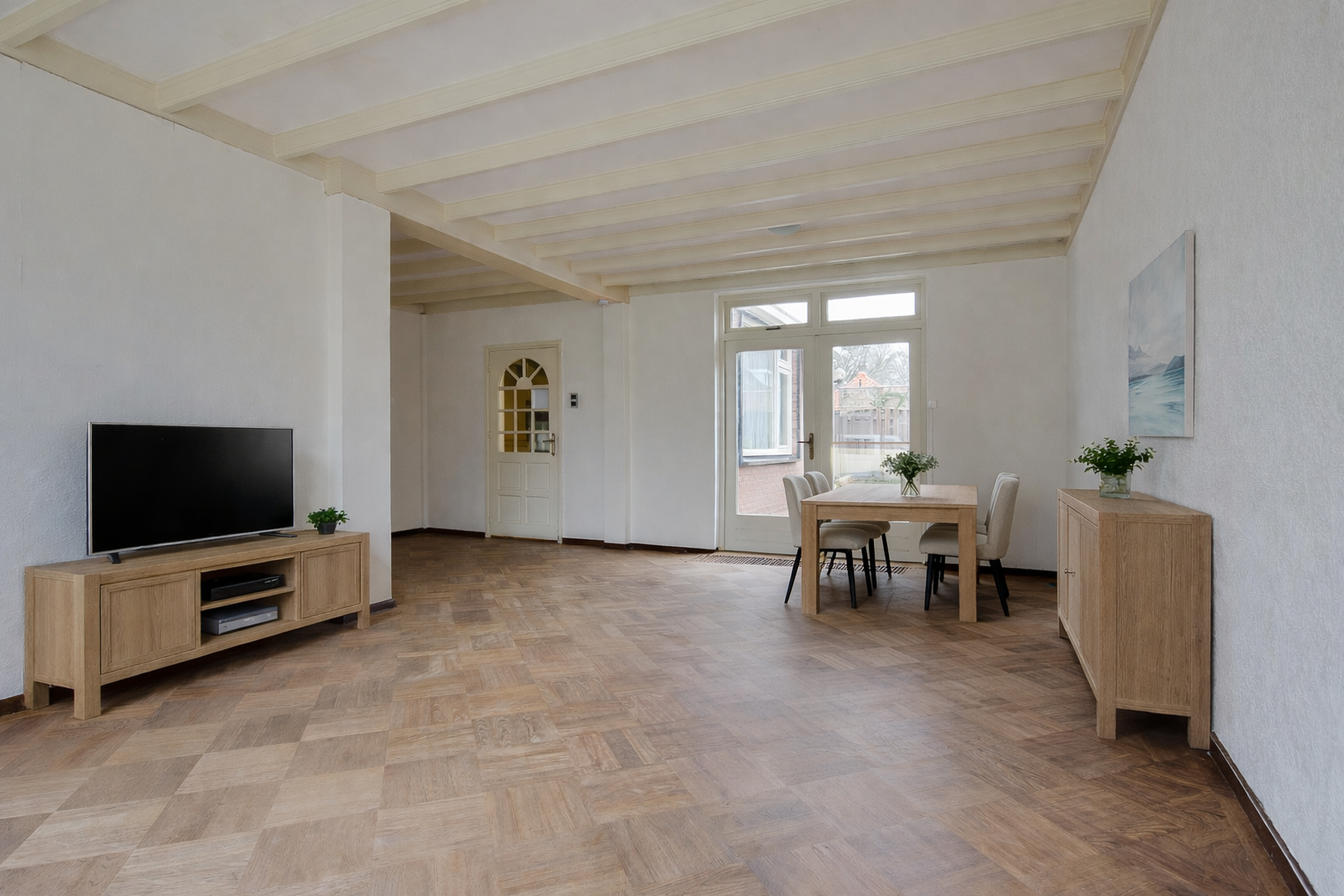 Begane grond De woning wordt via een verhard pad in de keurig aangelegde voortuin betreden via de hal, waar zich de meterkast, de toiletruimte (met staand toilet en fonteintje), de trapkast en trapopgang bevinden. De hal is afgewerkt met een nostalgische tegelvloer, granol wanden en kunststof schrootjesplafond. Vanuit de hal komt men in de van oorsprong doorzon woonkamer, die nu echter een L-vorm heeft. Dit komt doordat de keuken in het verleden naar de uitbouw is verplaatst en de locatie waar oorspronkelijk de keuken stond bij de woonkamer getrokken is. De woonkamer is afgewerkt met een fraaie parketvloer, granol wanden en licht balkenplafond. De oppervlakte bedraagt zo’n 32m2 en is nog vrij indeelbaar, want het zit- en eetgedeelte kan zowel aan de straat- als tuinzijde gesitueerd worden. Aansluitend aan de woonkamer treffen we de gesloten keuken, die met een oppervlakte van circa 11,5m2 lekker ruim van opzet is en waar gemakkelijk een eettafel geplaatst kan worden. Het aanwezige authentieke, degelijke keukenblok is voorzien van enkele keukenapparatuur zoals een gaskookplaat, afzuigkap, oven, dubbele spoelbak, koelkast en vriezer. De keuken is afgewerkt met een tegelvloer, schoon metstelwerk/betegelde wanden en licht balkenplafond. De bijkeuken sluit weer aan op de keuken, waar de geiser, de witgoedaansluitingen en uitstort opgesteld staan. Via een loopdeur is vanuit de bijkeuken de achtertuin bereikbaar.