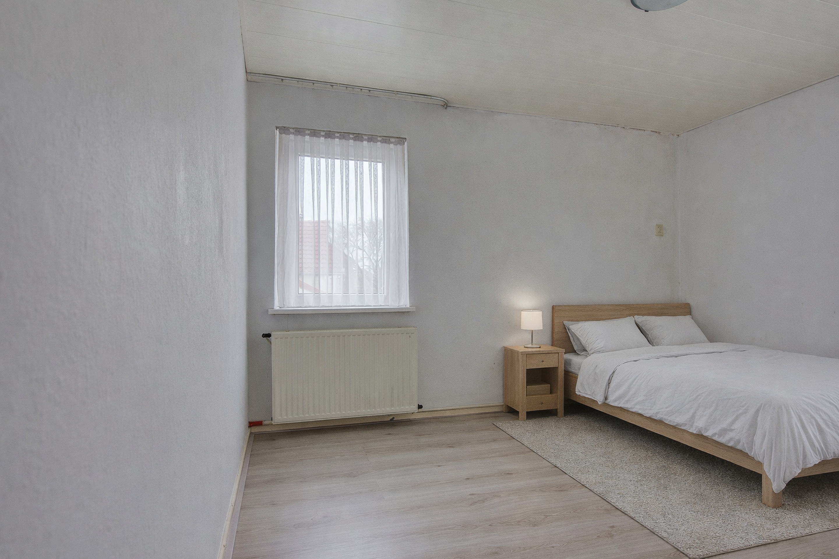 Eerste verdieping Op de 1e verdieping bevinden zich naast de overloop maar liefst vier slaapkamers en een badkamer/doucheruimte. De slaapkamers hebben een oppervlakte van respectievelijk circa 12m2, 10m2, 7,5m2 en 6m2 en zijn afgewerkt met een laminaatvloer of vloerbedekking, behangen wanden en kunststof schrootjesplafond. De eenvoudige, deels betegelde badkamer/doucheruimte is ingericht met een inloopdouche en vaste wastafel. Een raamkozijn zorgt er voor daglichttoetreding.