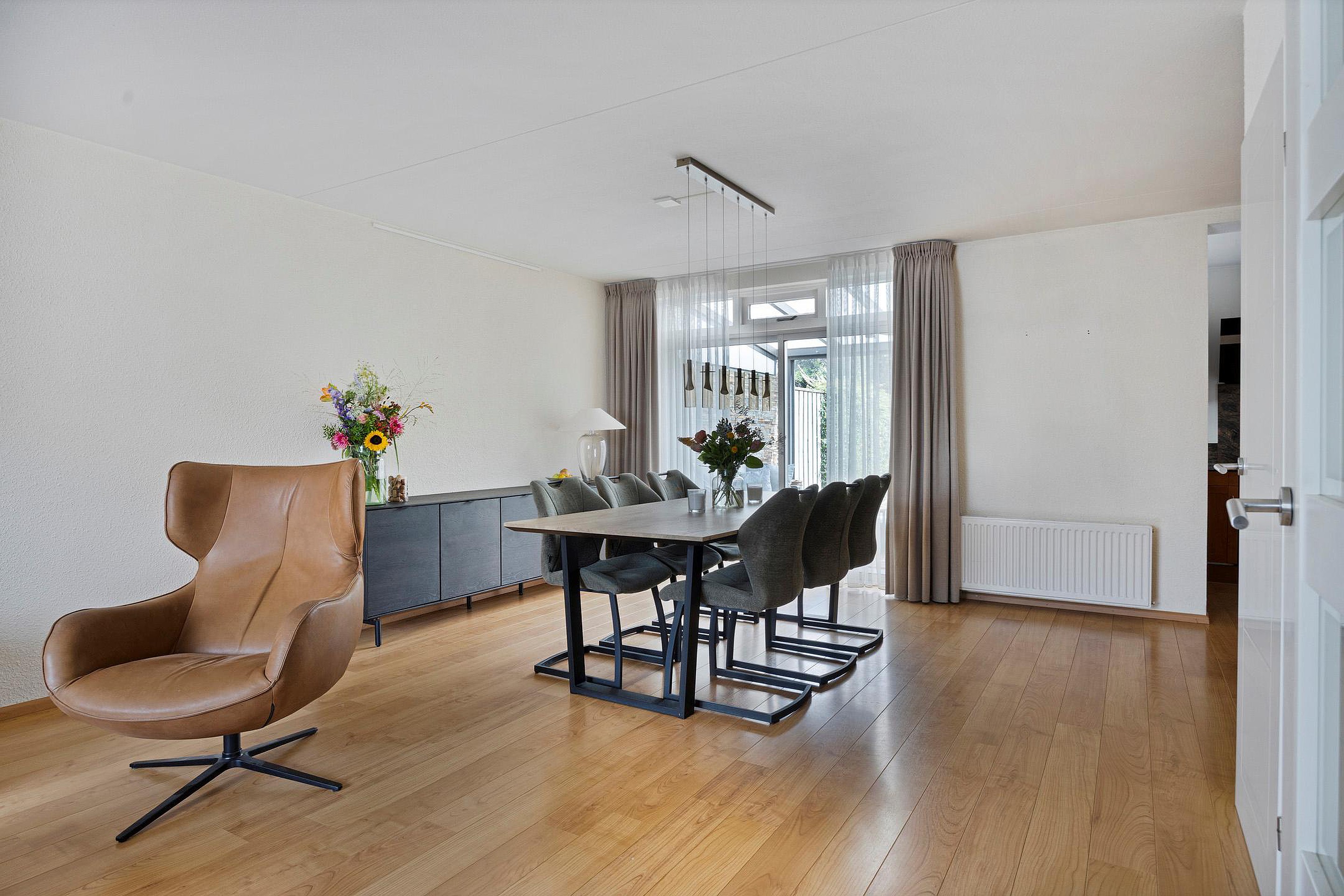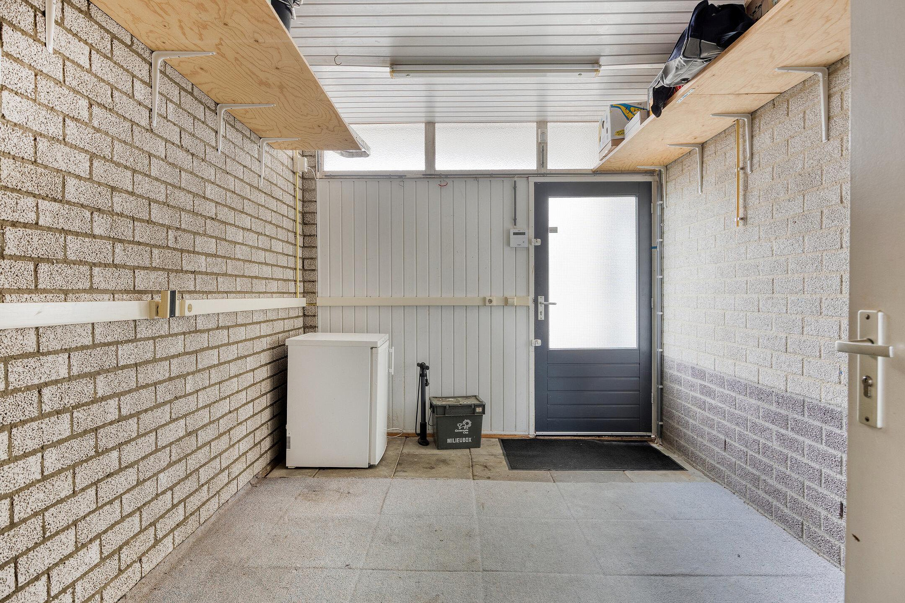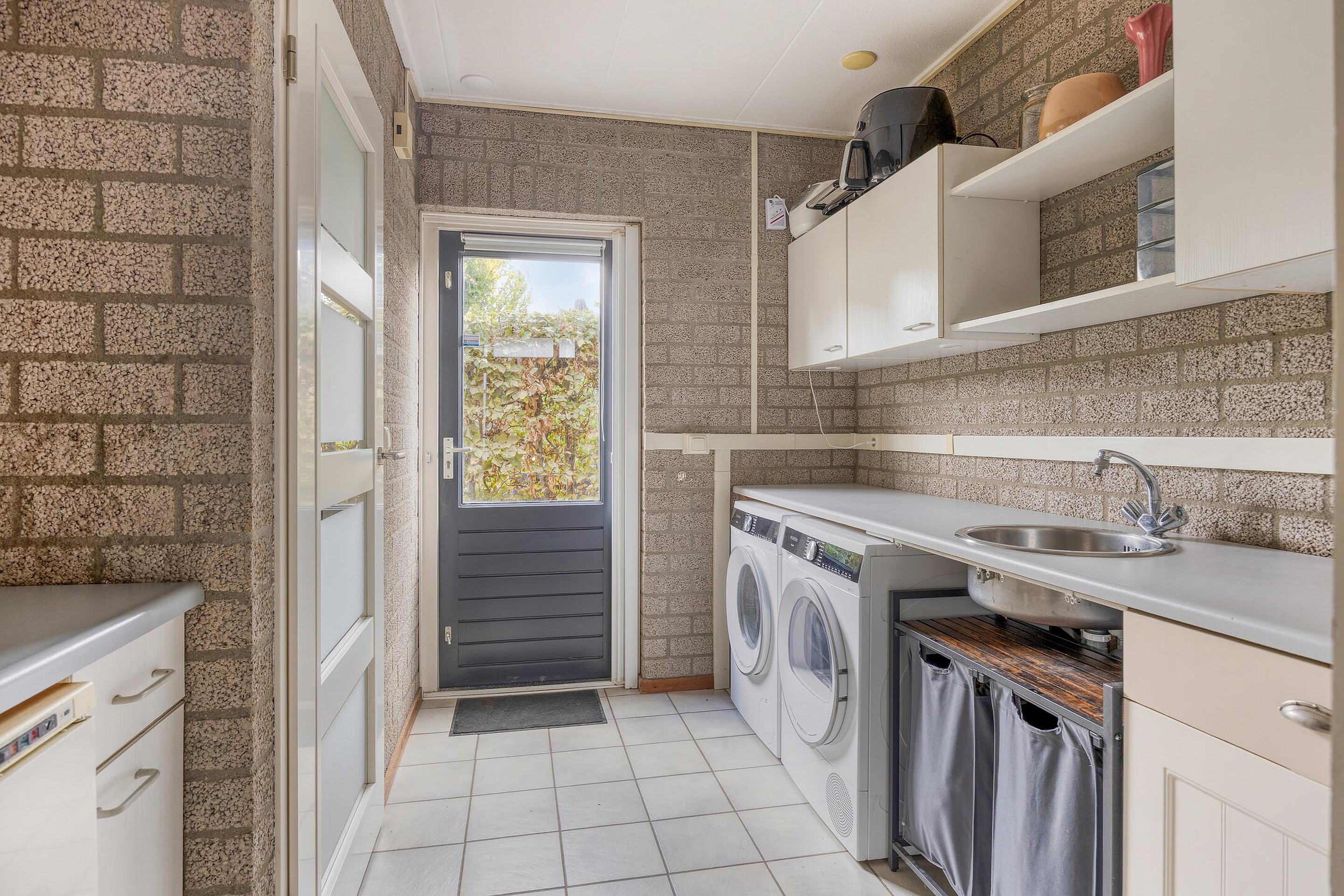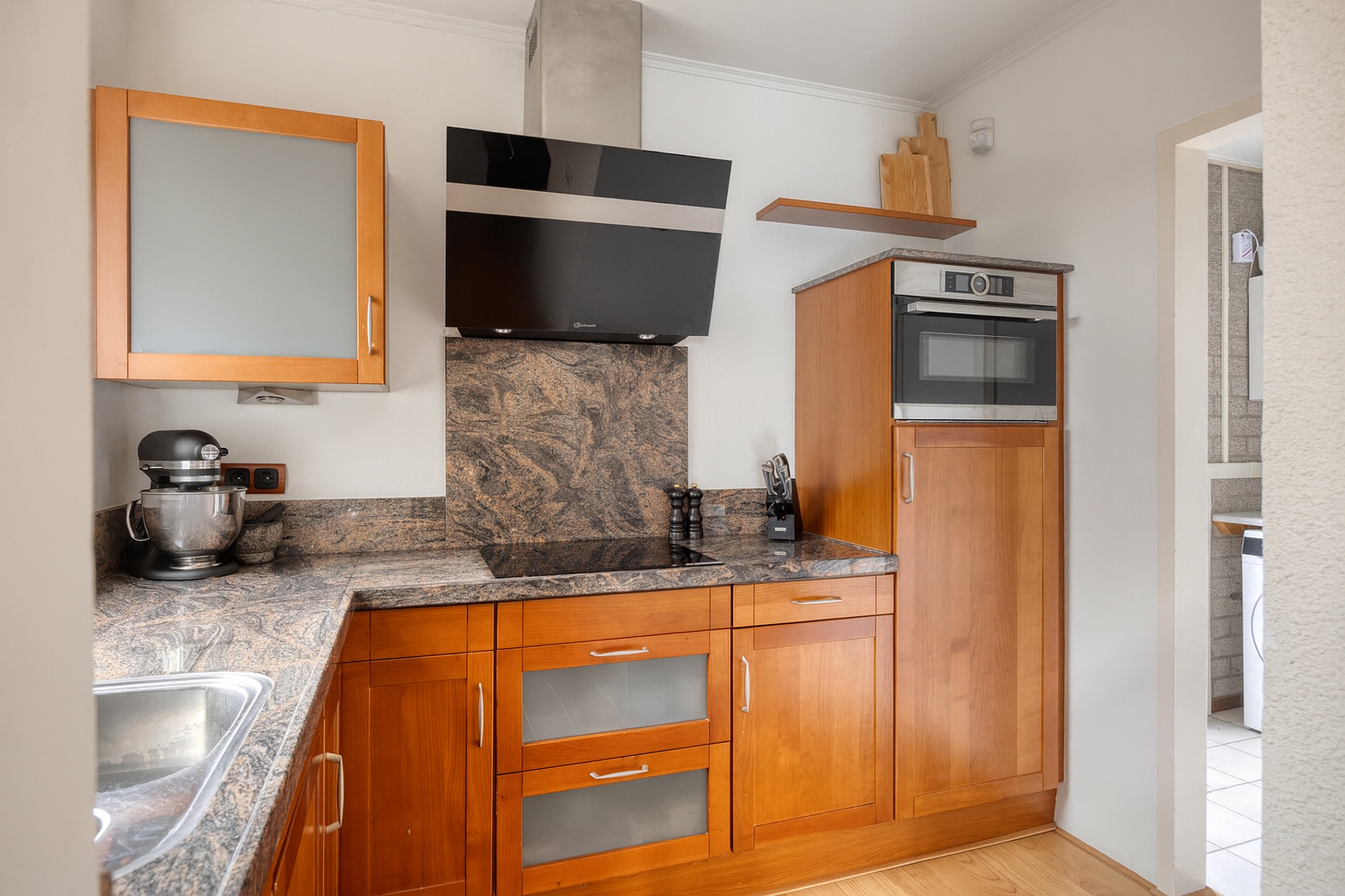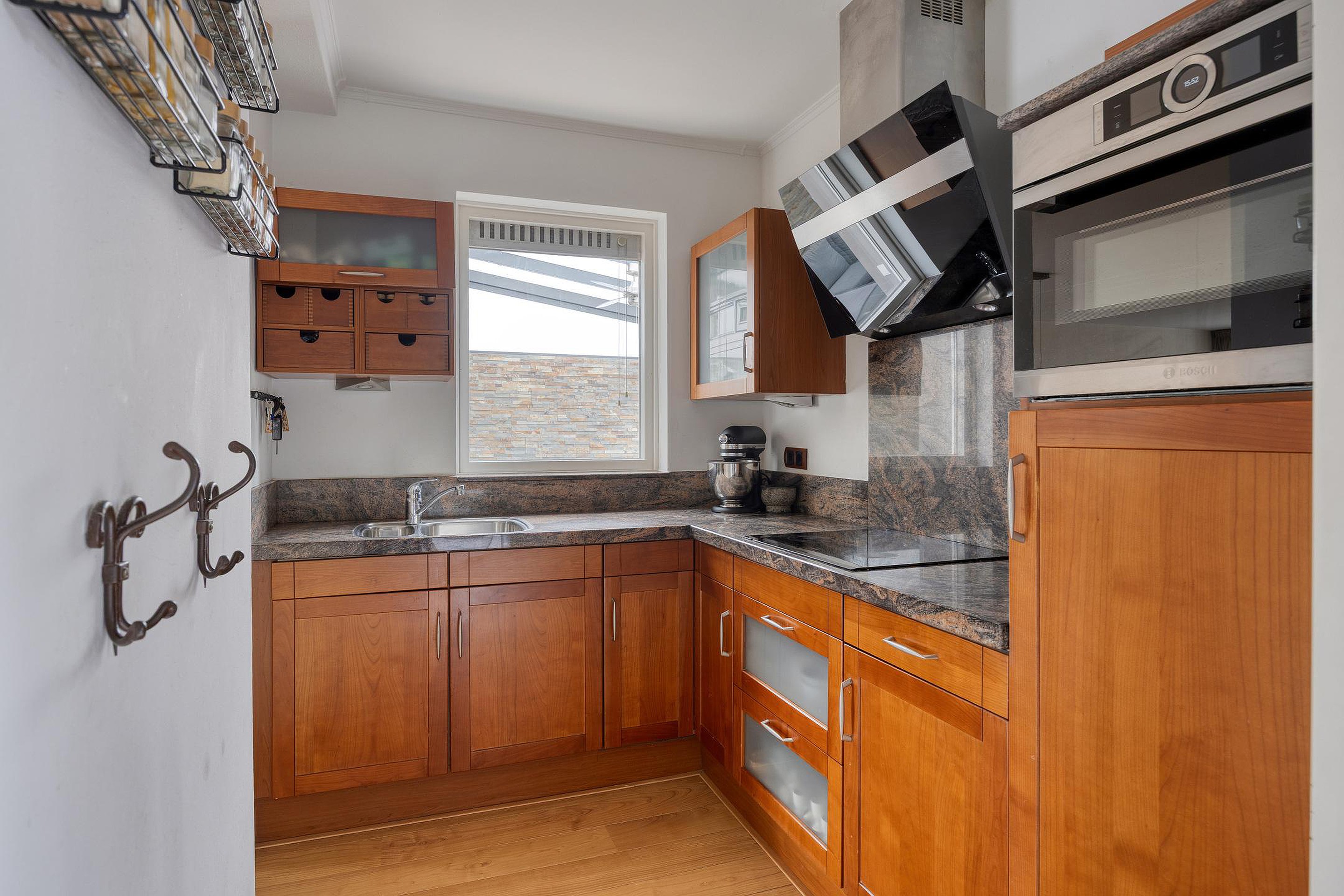 De halfopen keuken ligt aan de tuinzijde en is ingericht met een modern L-vormig keukenmeubel, afgewerkt met een stijlvol granieten werkblad. U beschikt hier over volop kastruimte én diverse inbouwapparatuur, waaronder een koelkast, inductiekookplaat, afzuigkap en combimagnetron. Aansluitend bevindt zich de praktische bijkeuken; volledig betegeld met ruimte voor wasmachine, droger en de cv-installatie met hybride warmtepomp. Vanuit hier bereikt u ook de inpandige berging, ideaal voor het stallen van fietsen en/of het opbergen van extra spullen.