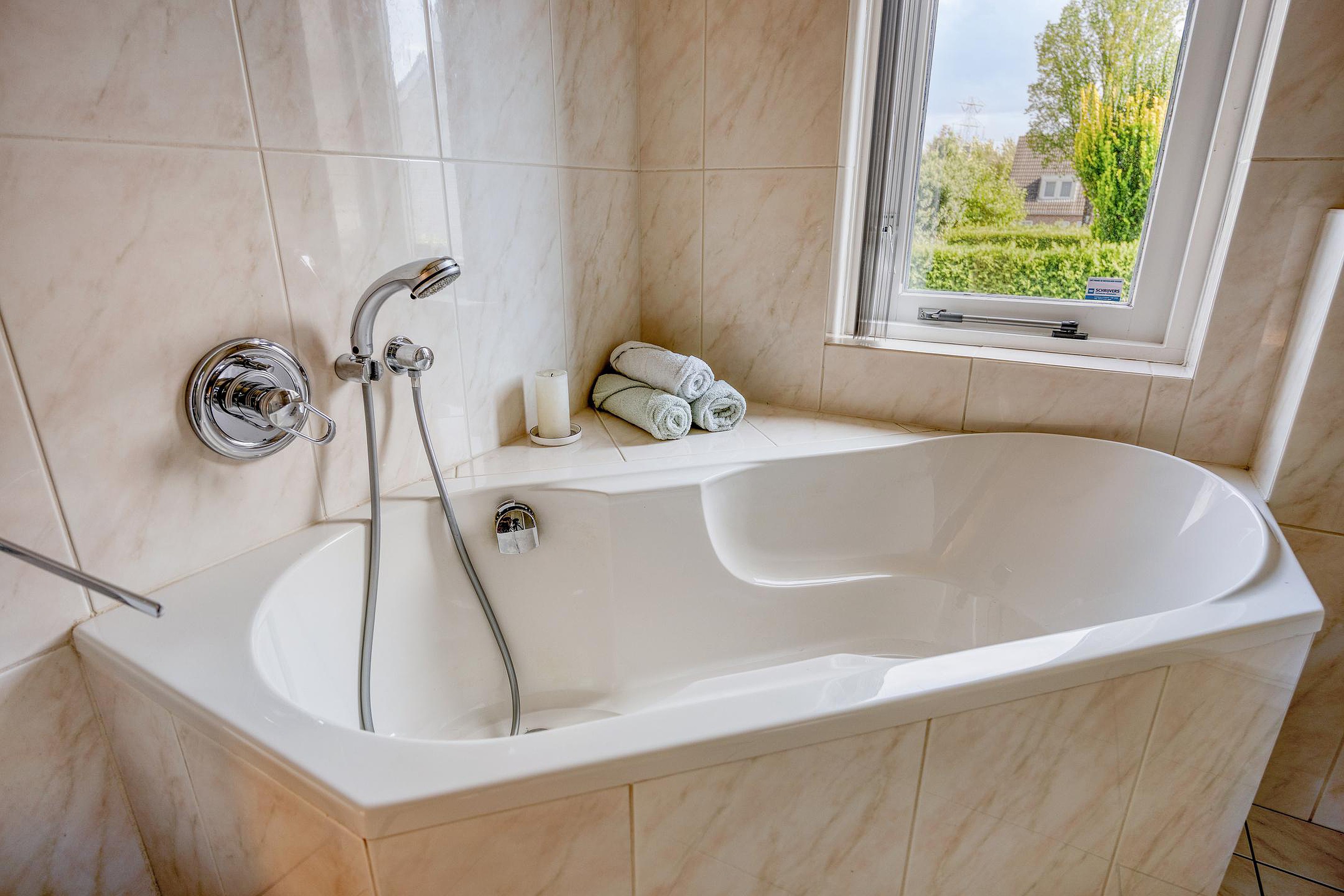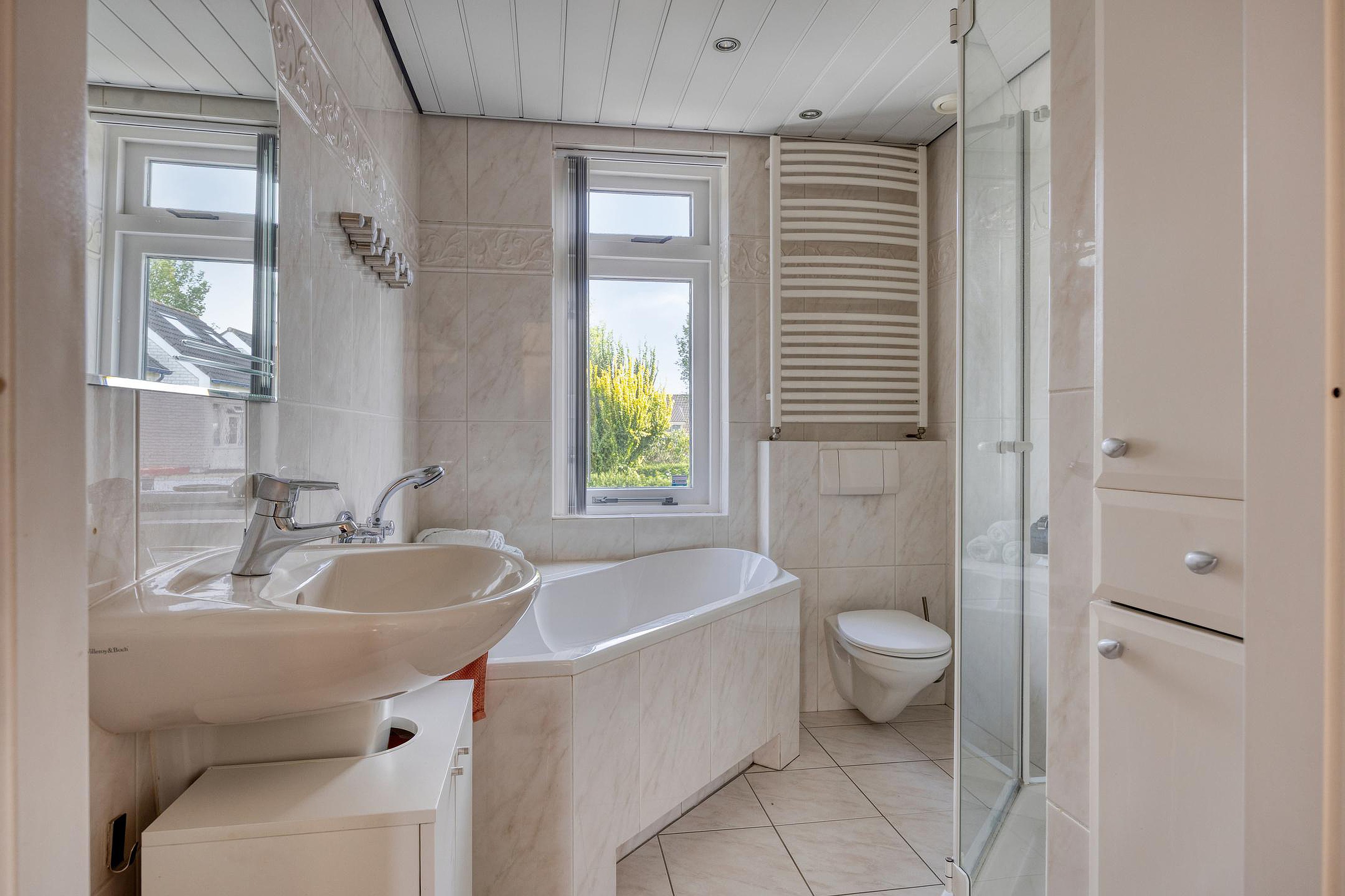Eerste verdieping Op de eerste verdieping vindt u drie goed bemeten slaapkamers van circa 13m2, 11m2 en 6m2. Alle kamers zijn voorzien van een mooie laminaatvloer en nette wand- en plafondafwerking. Op de overloop is een airconditioning geplaatst, ideaal voor warme zomerdagen. De royale badkamer is uitgevoerd in een lichte kleurstelling en uitgerust met een hoekbad, aparte douchecabine, wastafelmeubel, designradiator en tweede toilet.