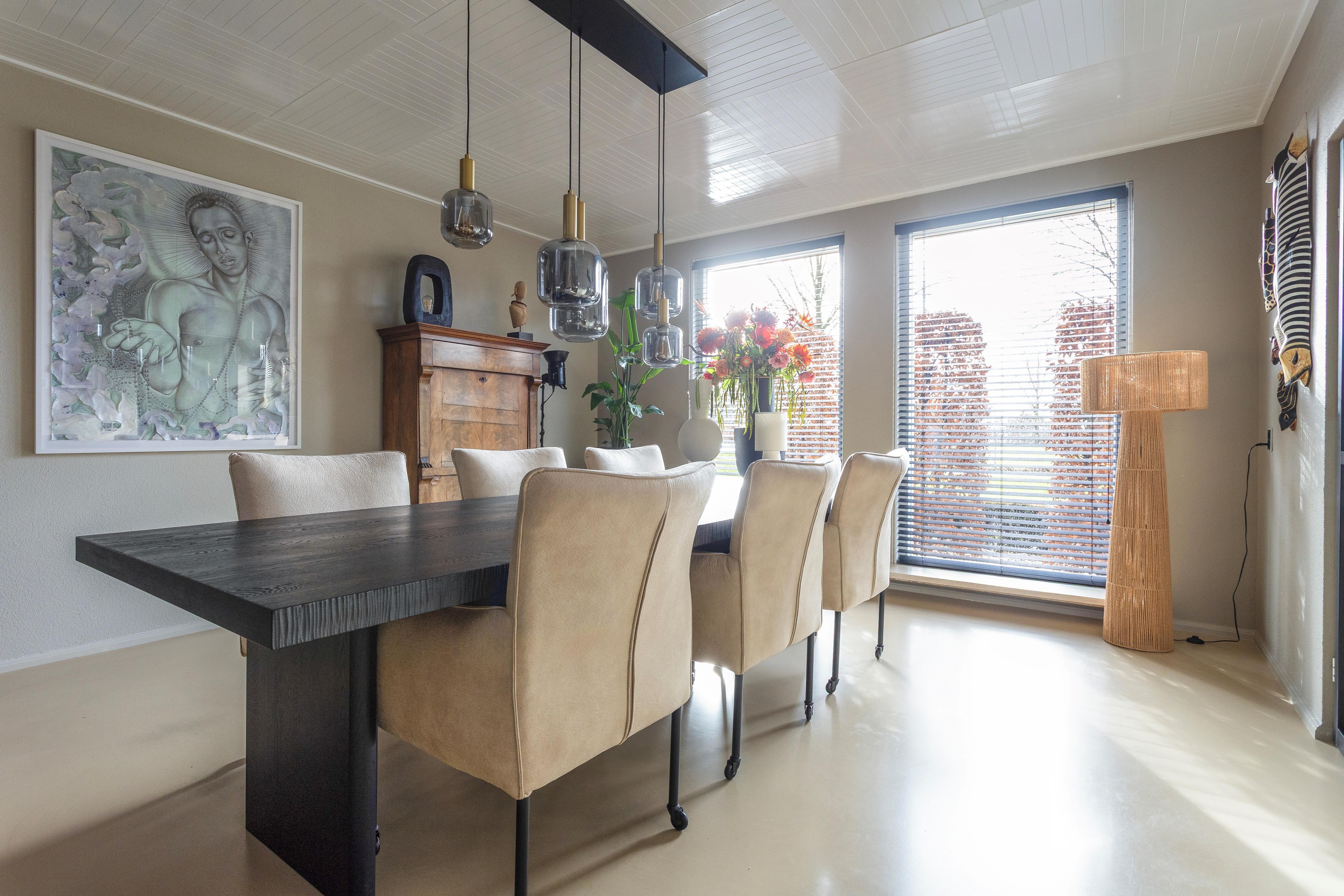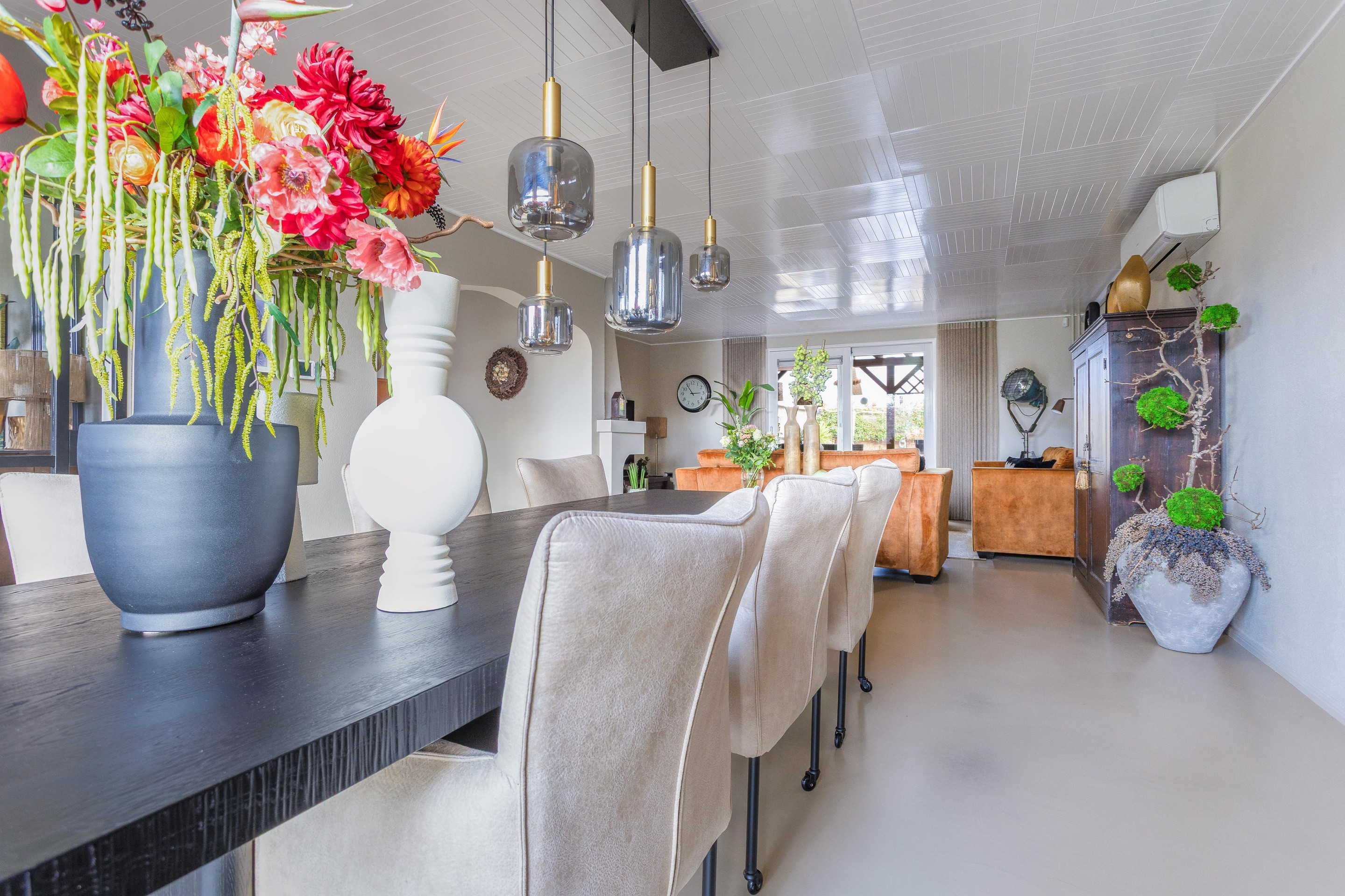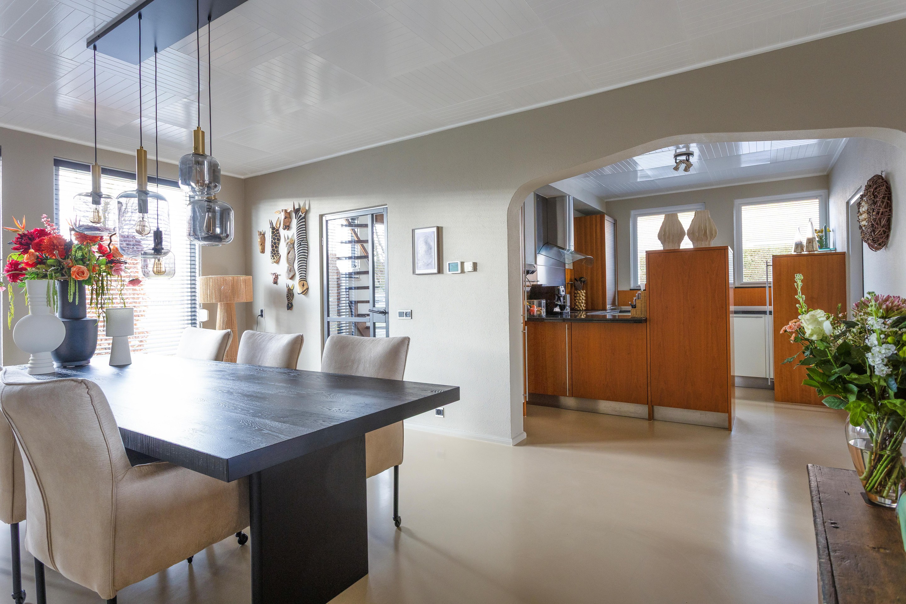 - De gehele begane grond afgewerkt met een lichtgekleurde gietvloer en vloerverwarming. De wanden zijn afgewerkt met lichte spachtelputz en plafonds met lichte