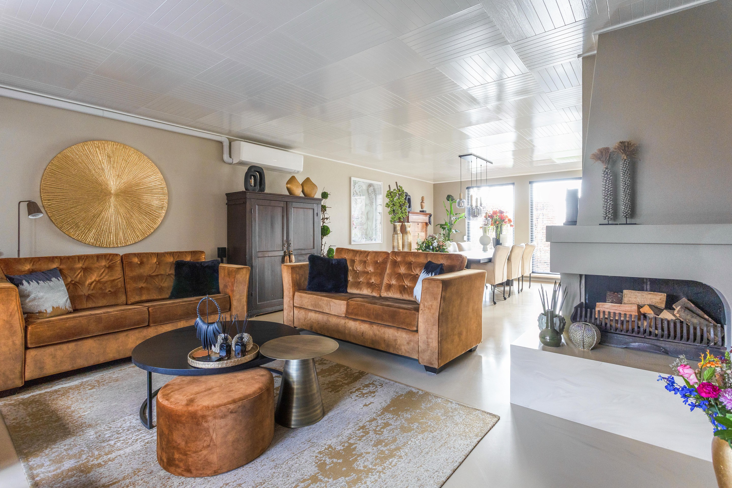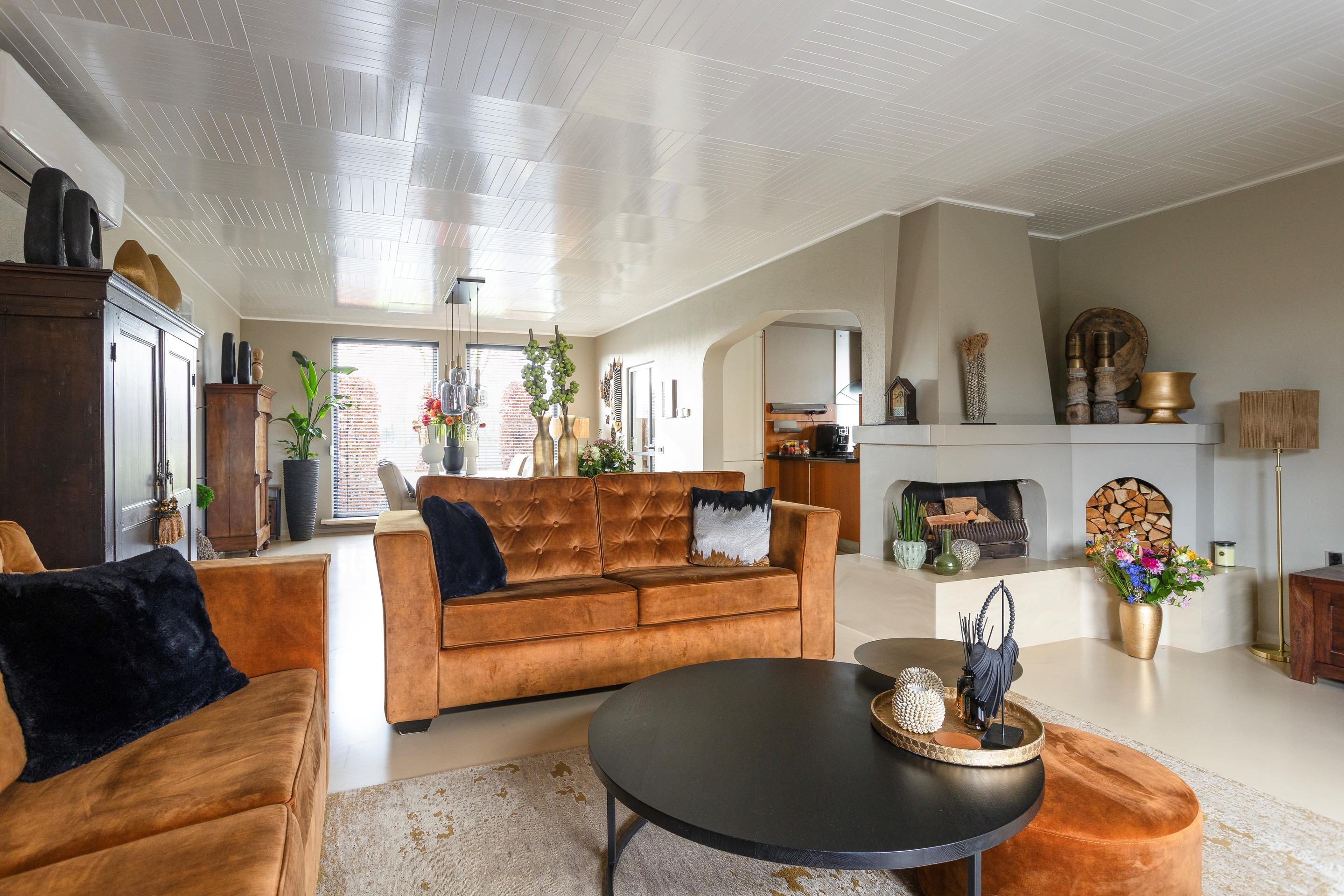 - Ruime L vormige woon- en eetkamer met open haard, een airco welke voor verwarming en koeling kan zorgen