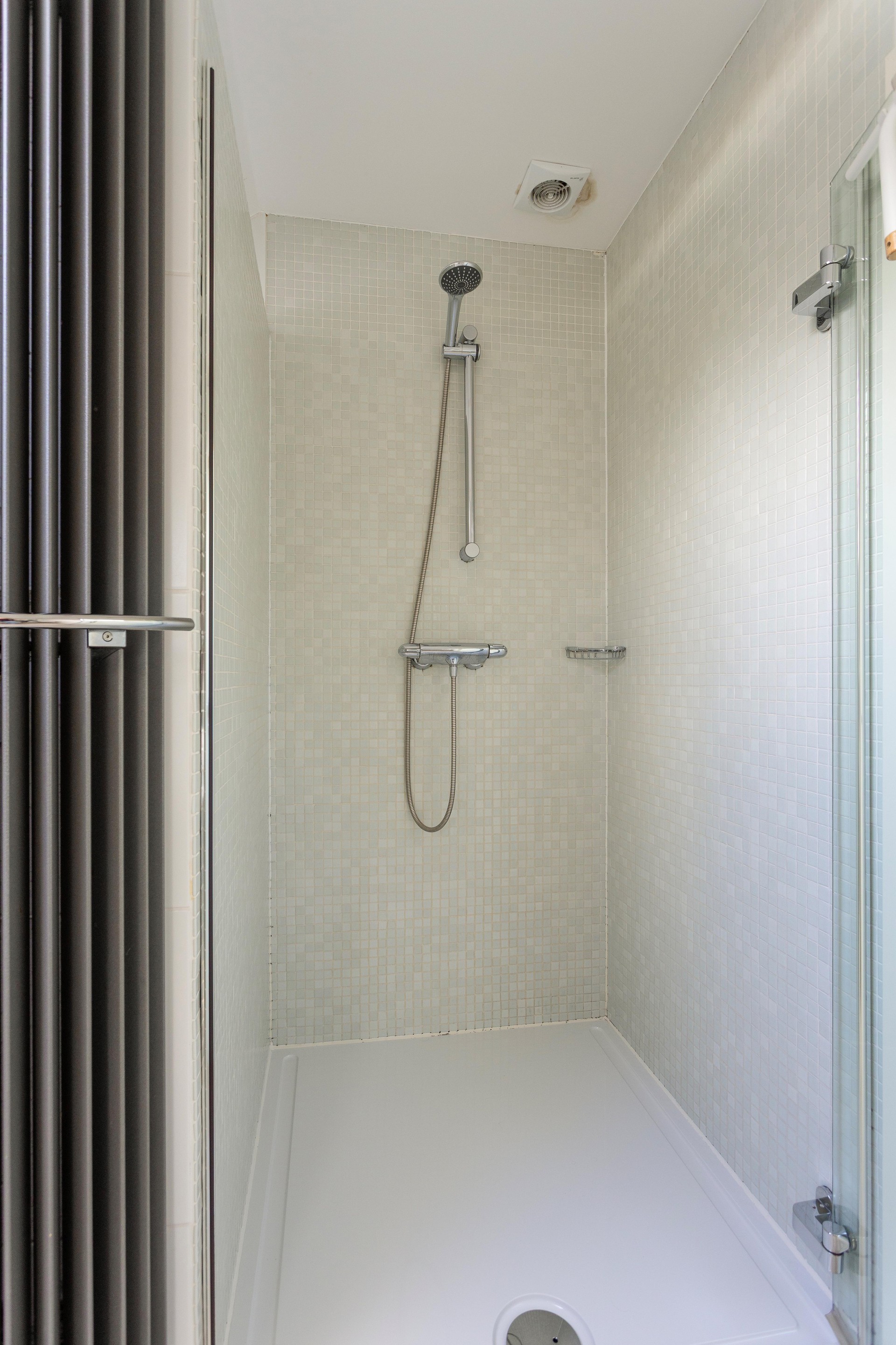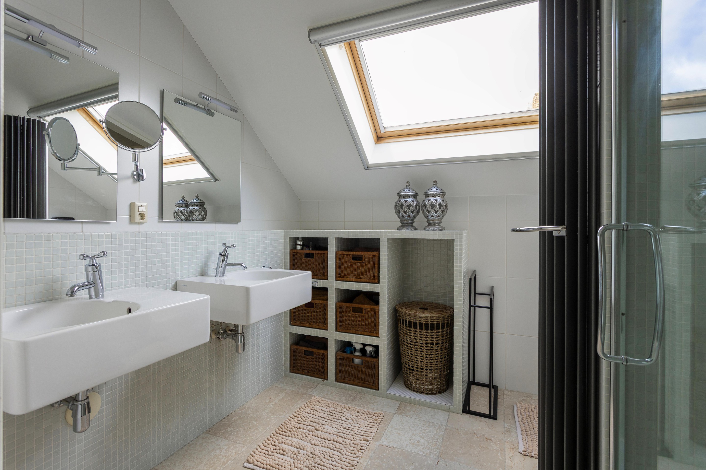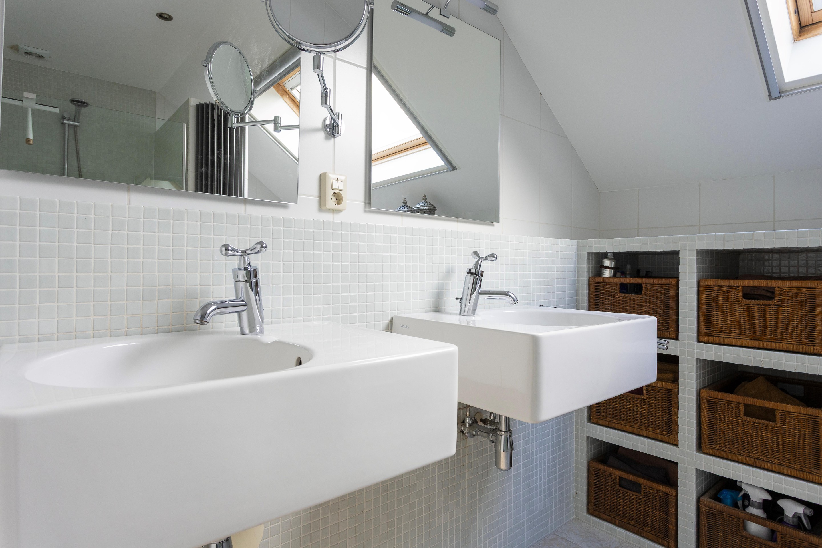 - Badkamer volledig betegeld in wit en uitgerust met een royale inloopdouche, een dubbele wastafel met meubel, een vrijhangend toilet en een urinoir