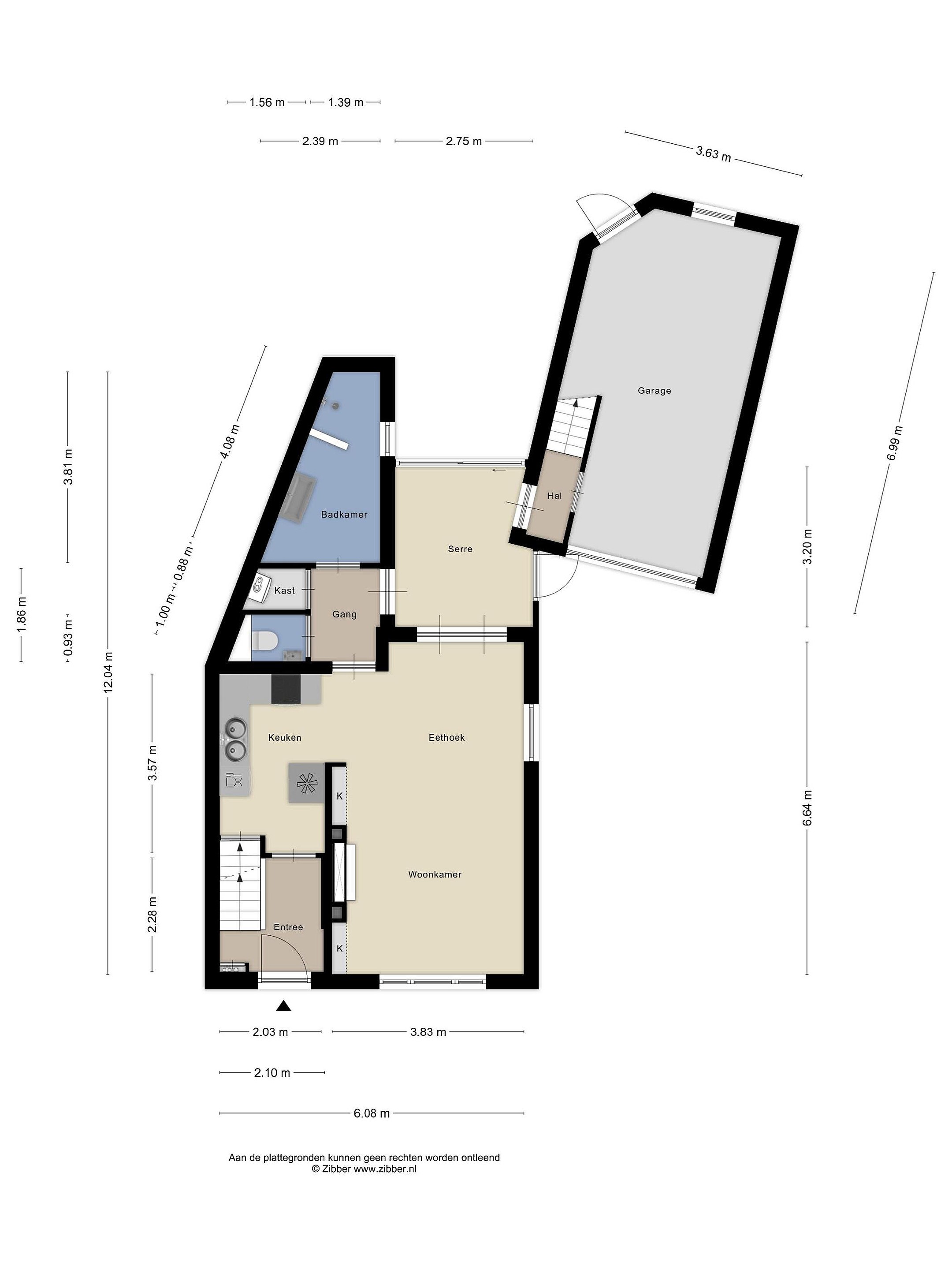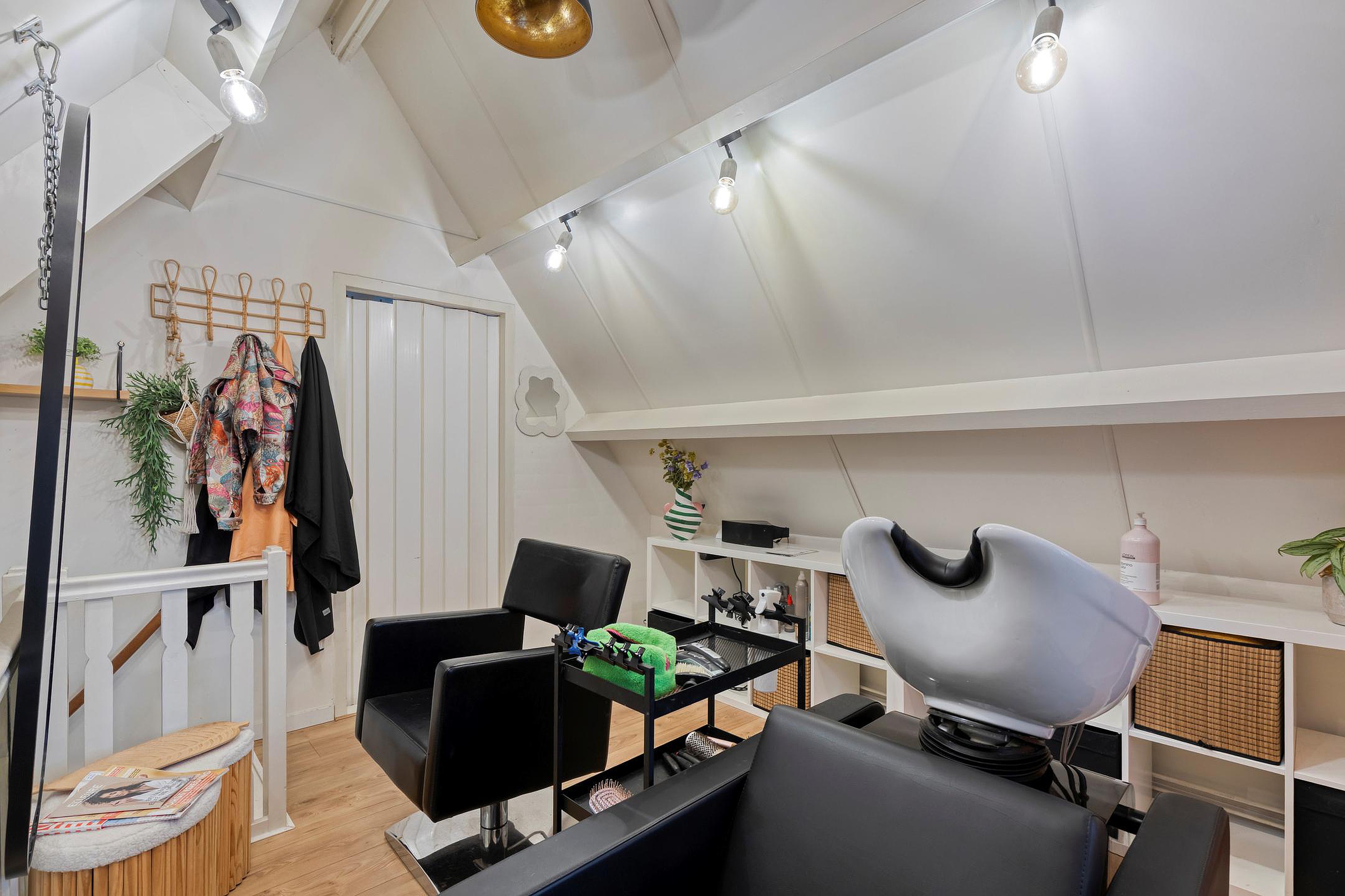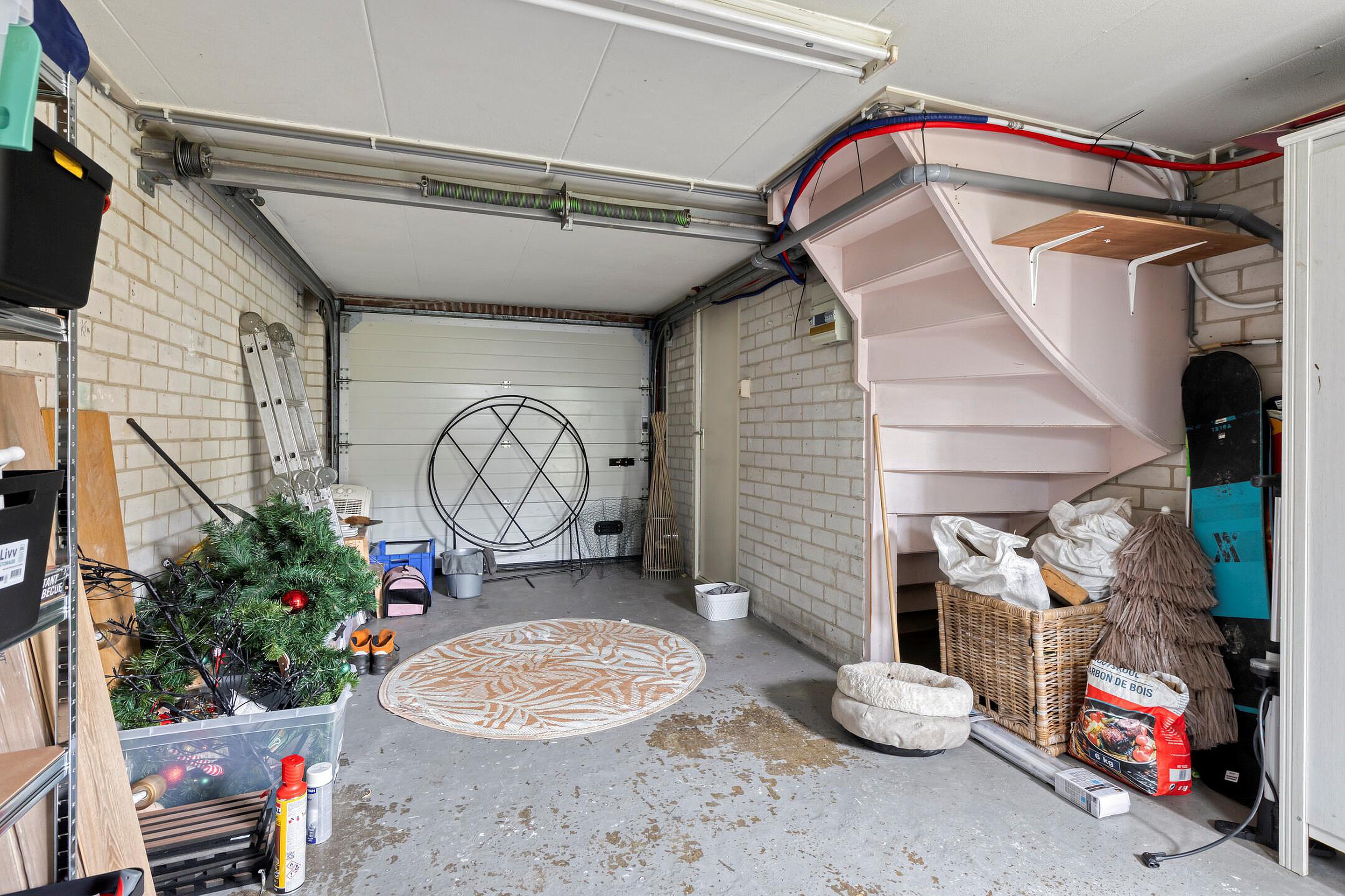 De garage is bereikbaar vanuit de serre en beschikt over een elektrische roldeur, eigen groepenkast, witgoedaansluitingen en een vaste trap.