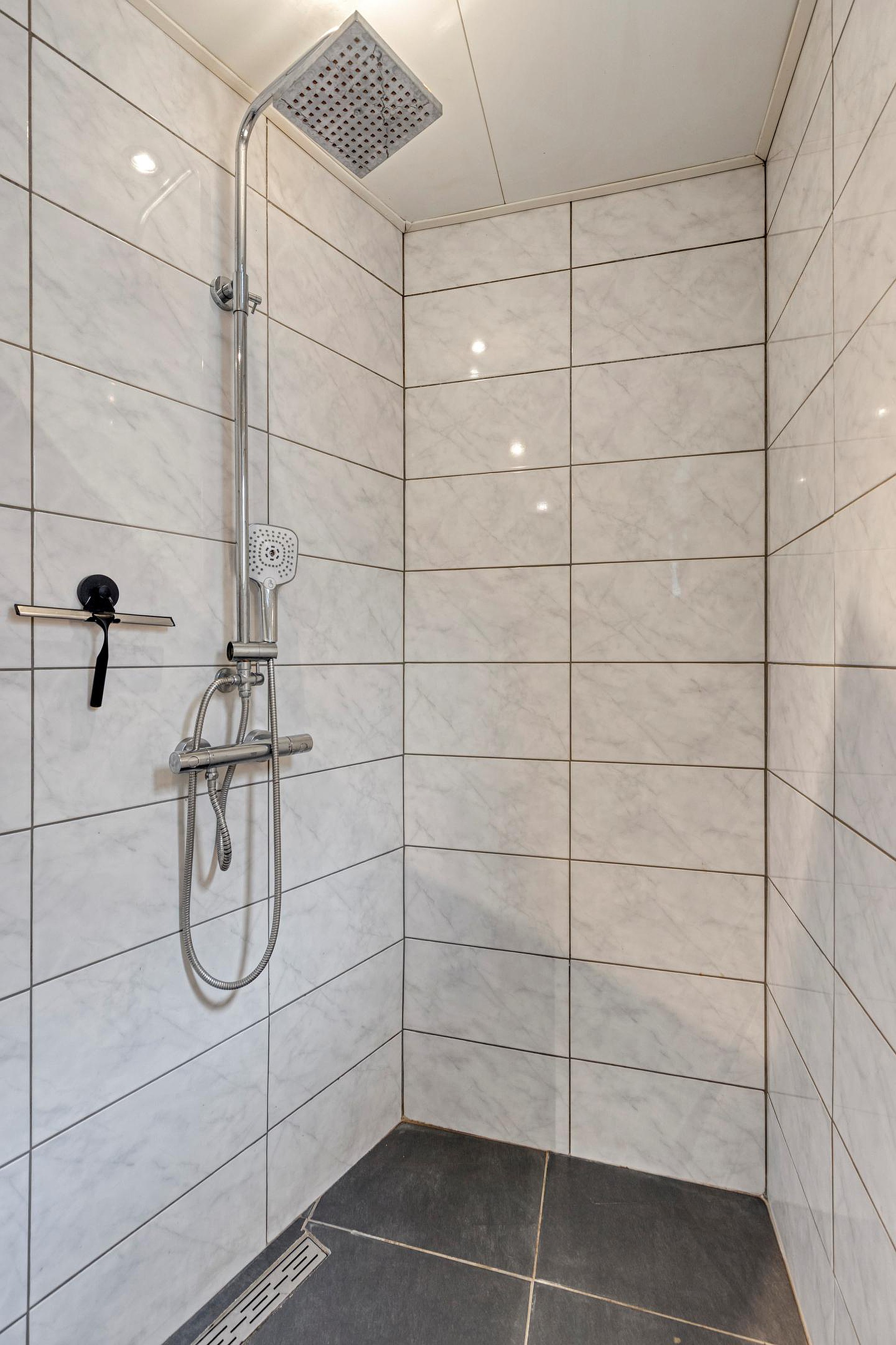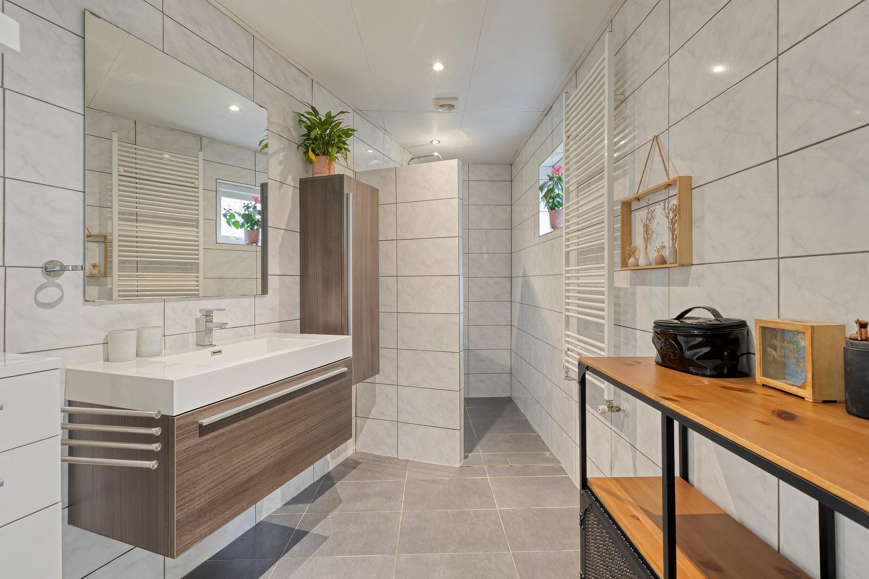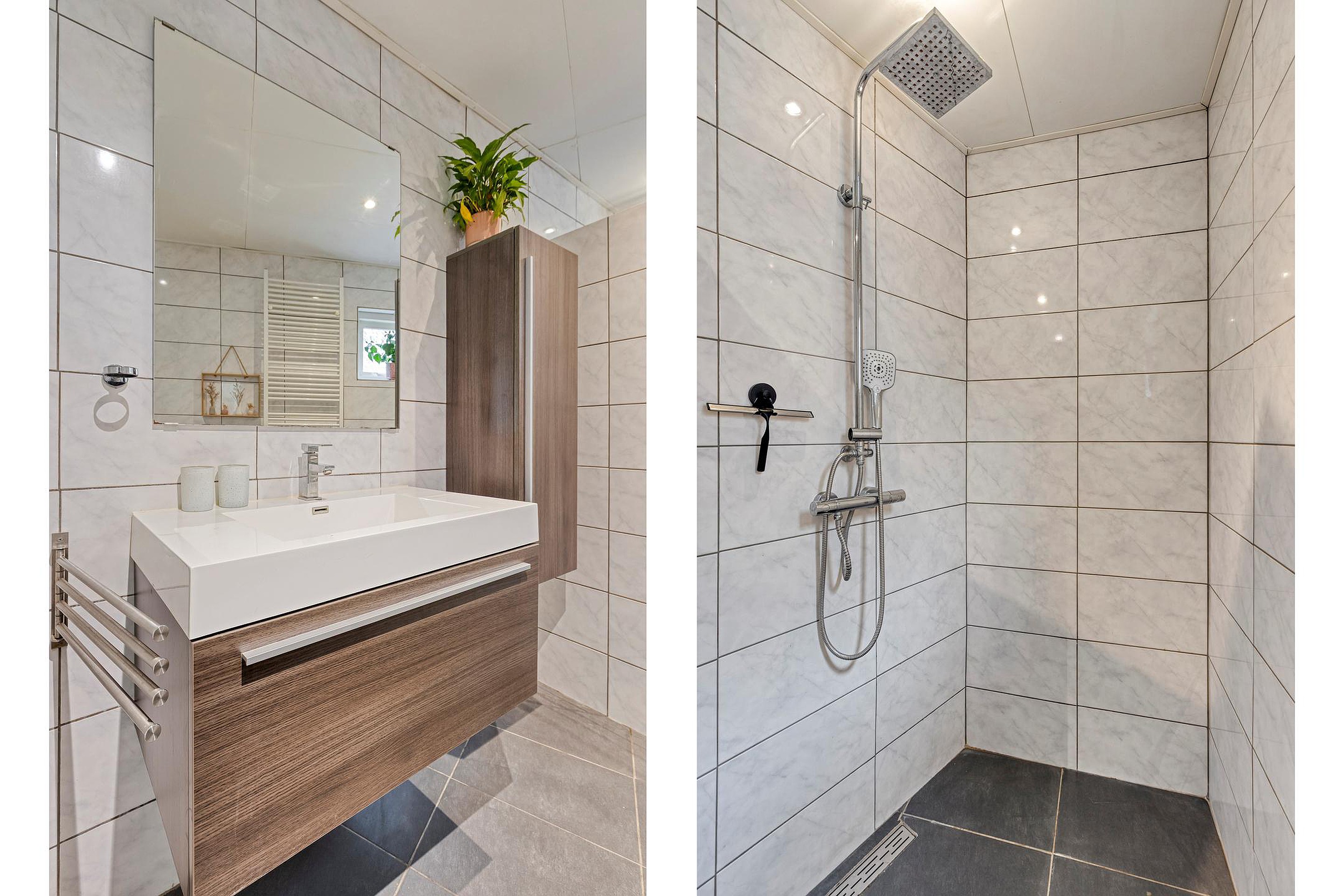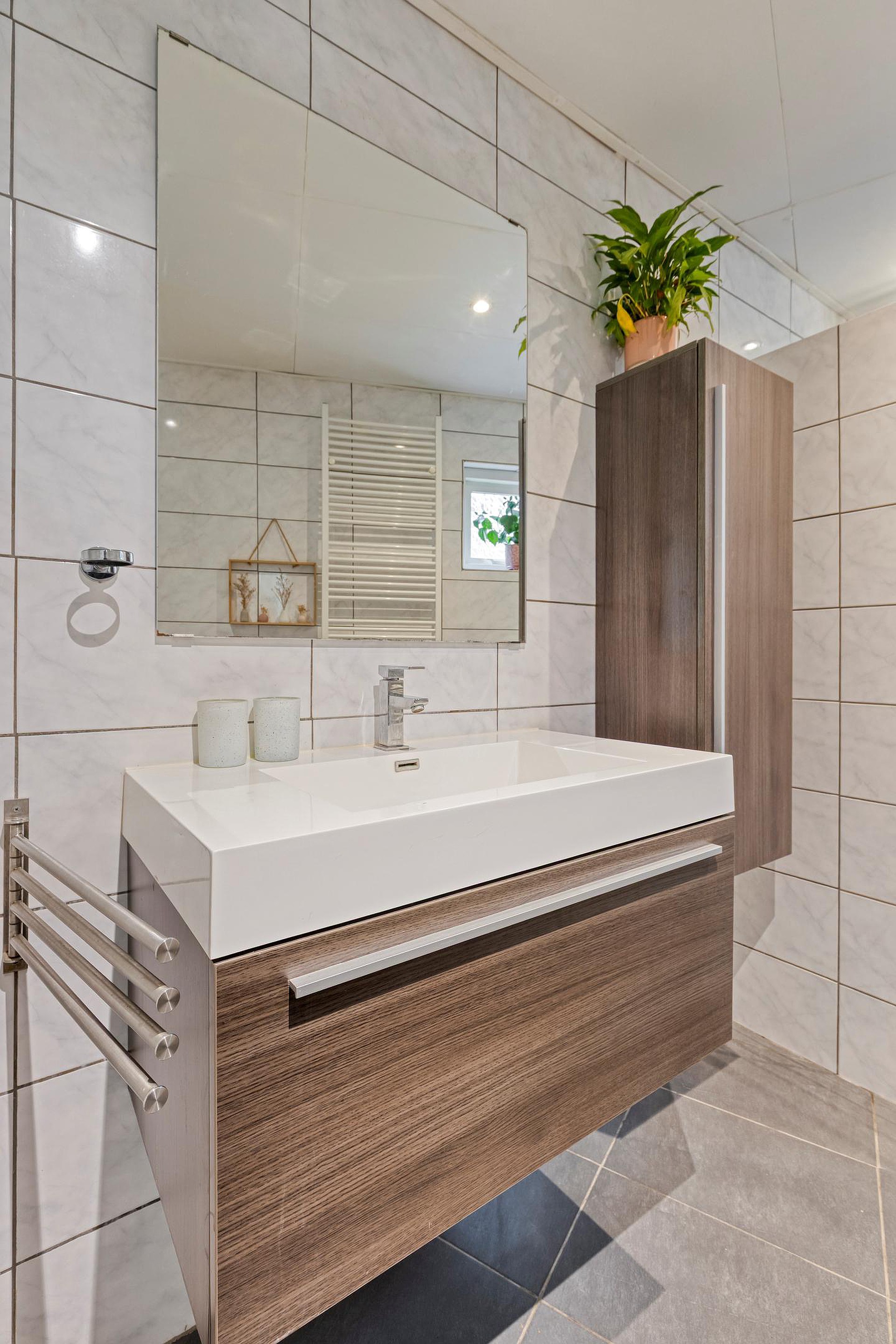 De badkamer is modern ingericht en voorzien van een badkamermeubel, inloopdouche, designradiator en afzuiging.