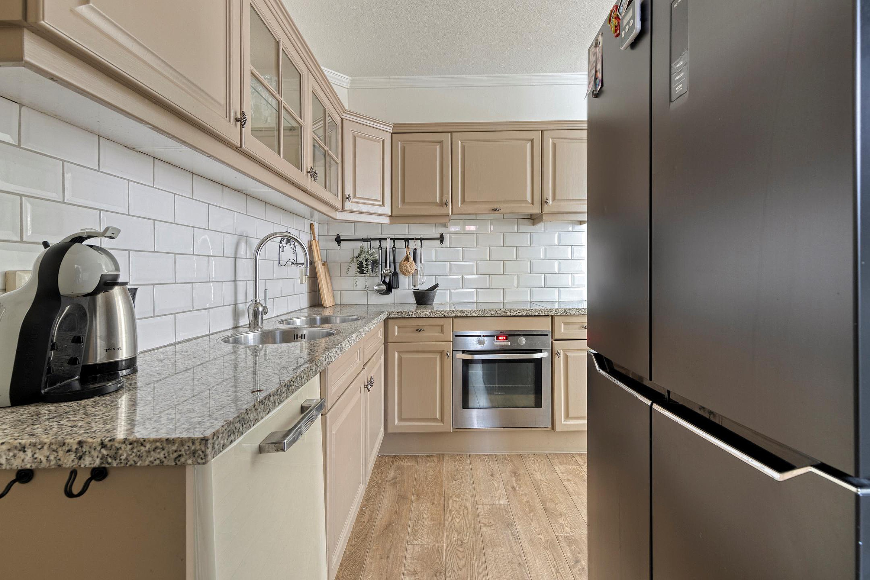 De moderne halfopen keuken is voorzien van een granieten werkblad, dubbele spoelbak en diverse inbouwapparaten, waaronder een inductiekookplaat met afzuigkap, oven en een Smeg vaatwasser. Vanuit de keuken bereikt u de kelder.