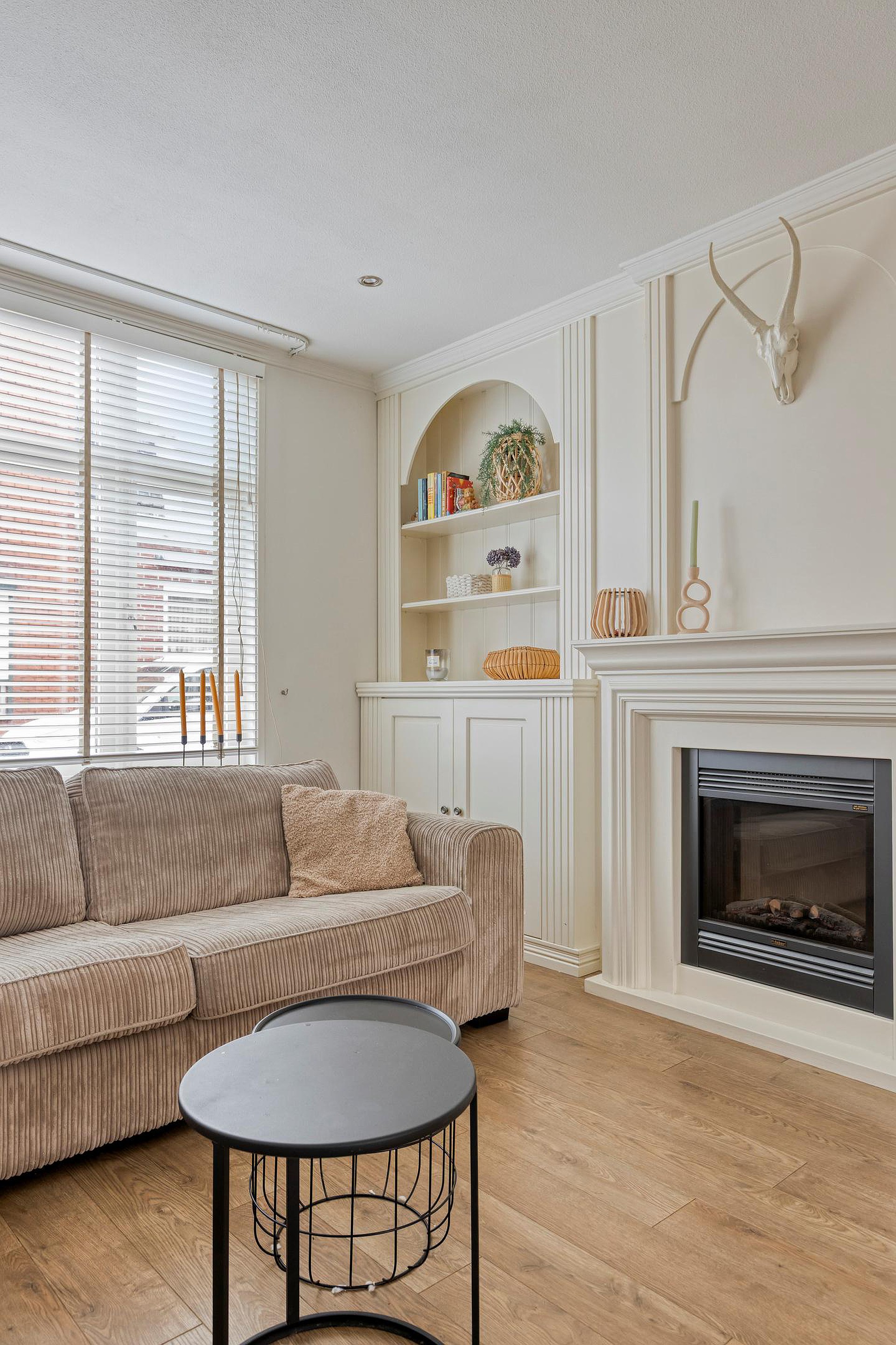 De ruime en lichte woonkamer is verdeeld in een zit- en eetgedeelte en sfeervol afgewerkt met een laminaatvloer, sierlijsten, inbouwspots, een schouw met moderne elektrische haard, convectorput, vaste kast en openslaande deuren naar de serre.