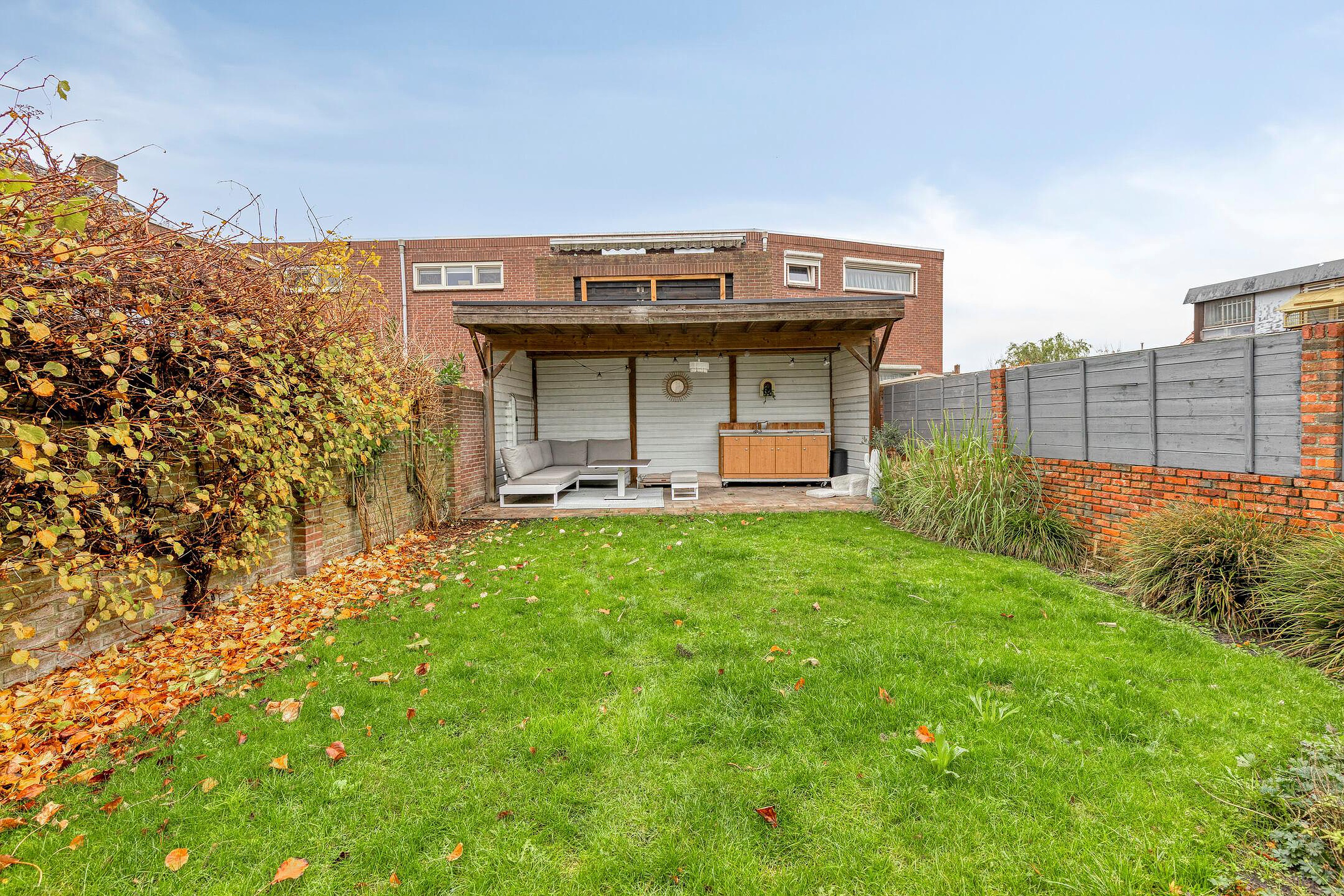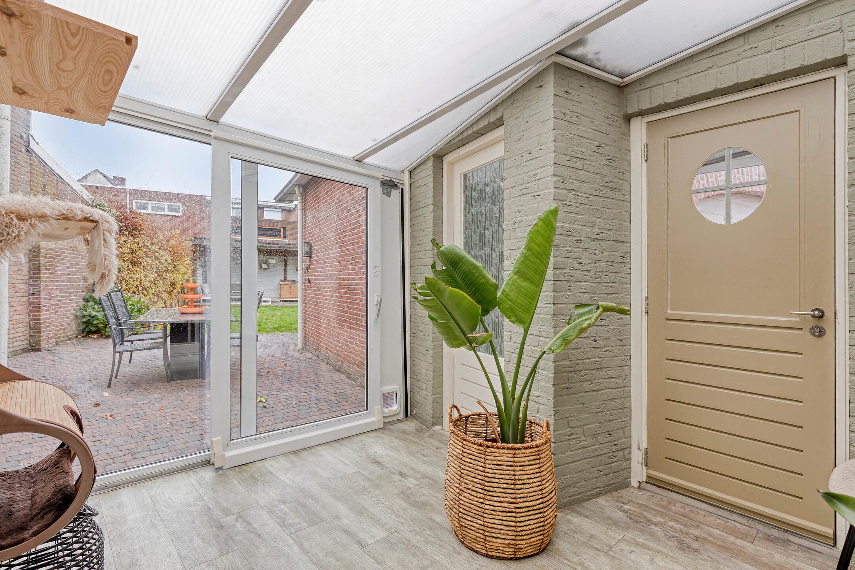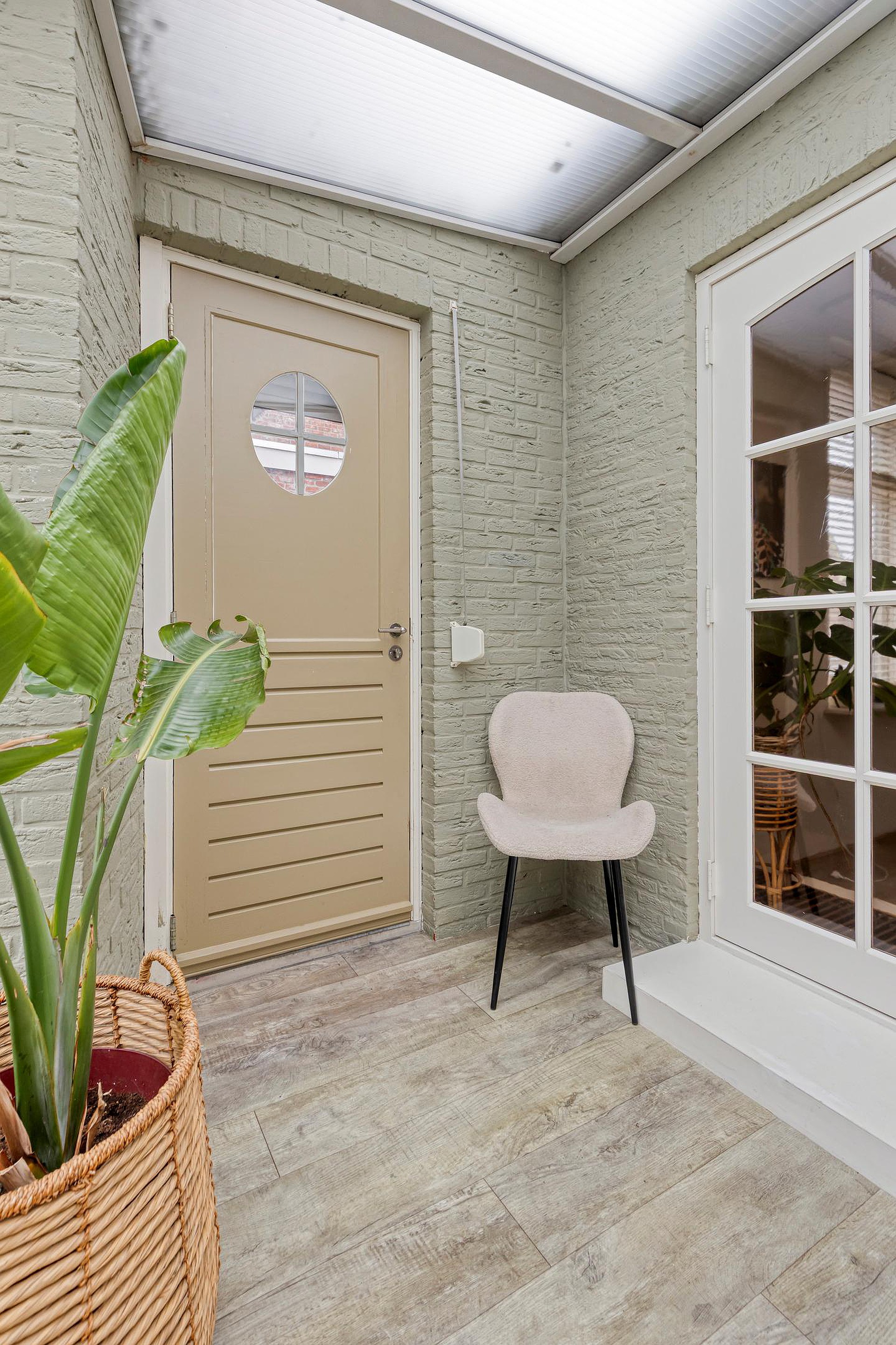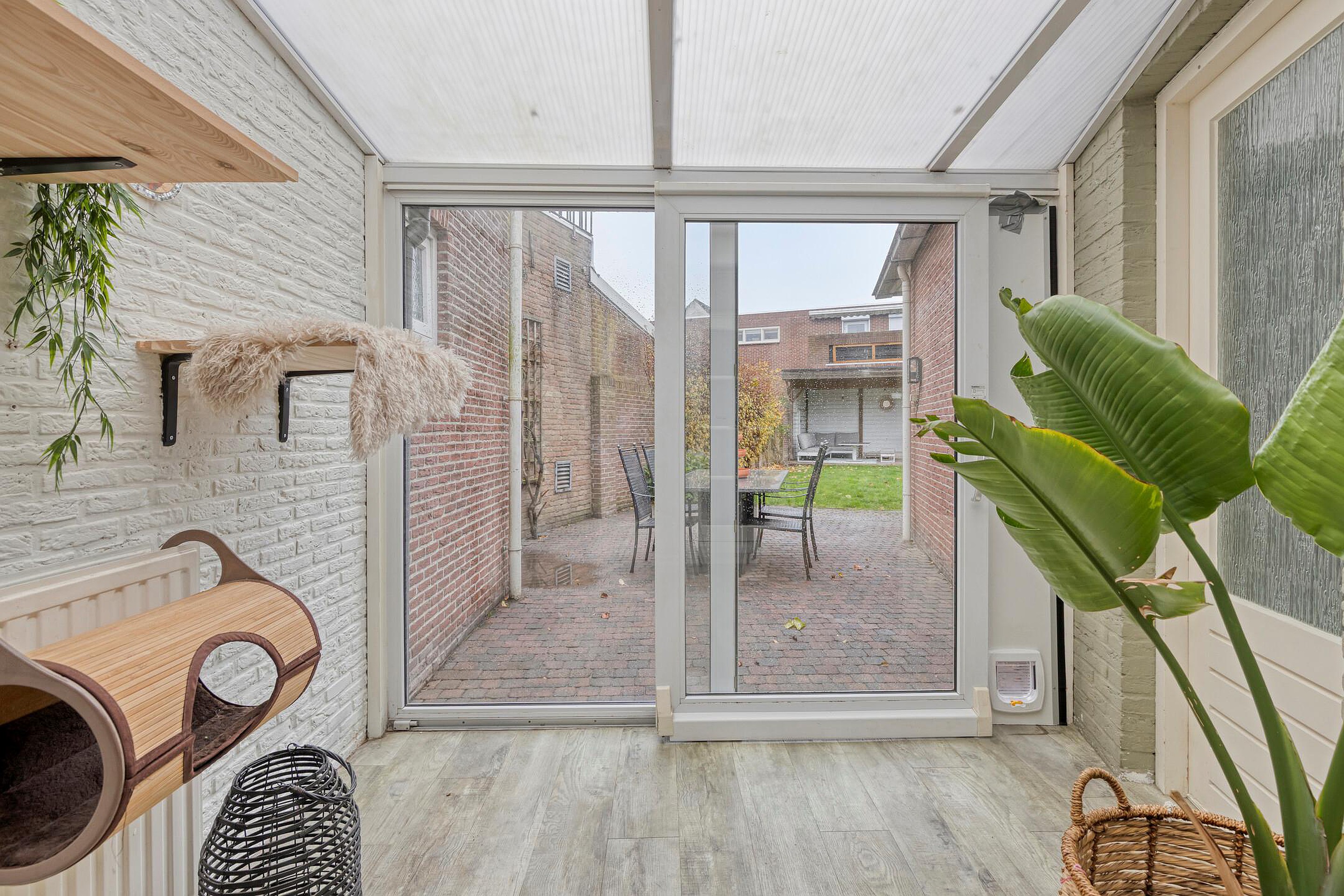 De serre biedt een leuk zicht op de achtertuin en is uitgerust met een grote schuifpui. Vanuit hier bereikt u het portaal met toegang tot het toilet, de volledig betegelde badkamer én de CV-ruimte (Vaillant combiketel 2020).