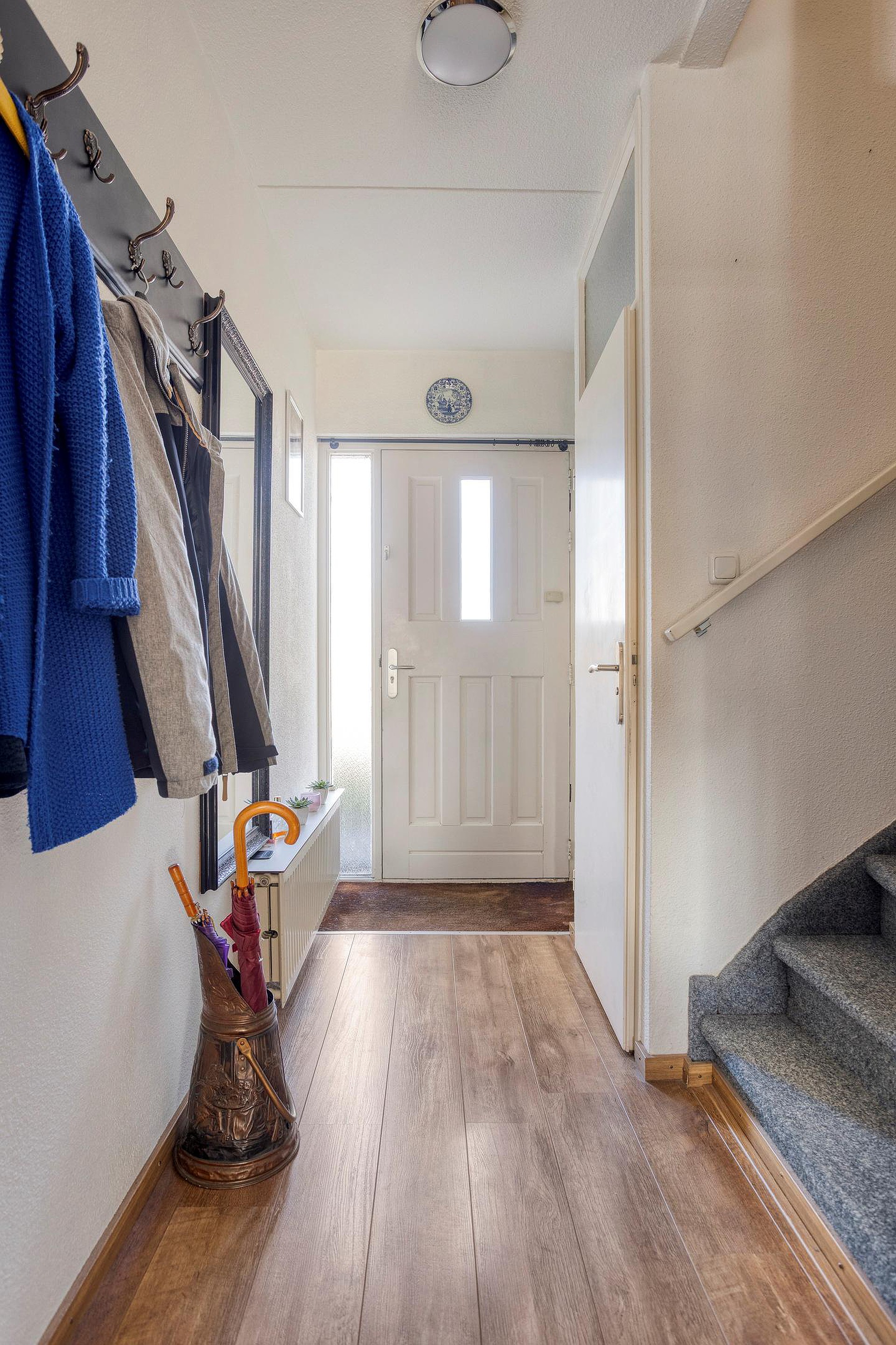 Begane grond Entree/ hal met meterkast, trapopgang en het toilet. De woonkamer beschikt over veel lichtinval en een doorgang naar de keuken met een keukenblok voorzien diverse inbouwapparatuur, o.a. een koelkast, oven, gaskookplaat, afzuigkap en een vaatwasmachine. Via de bijkeuken bereikt u de achtertuin.