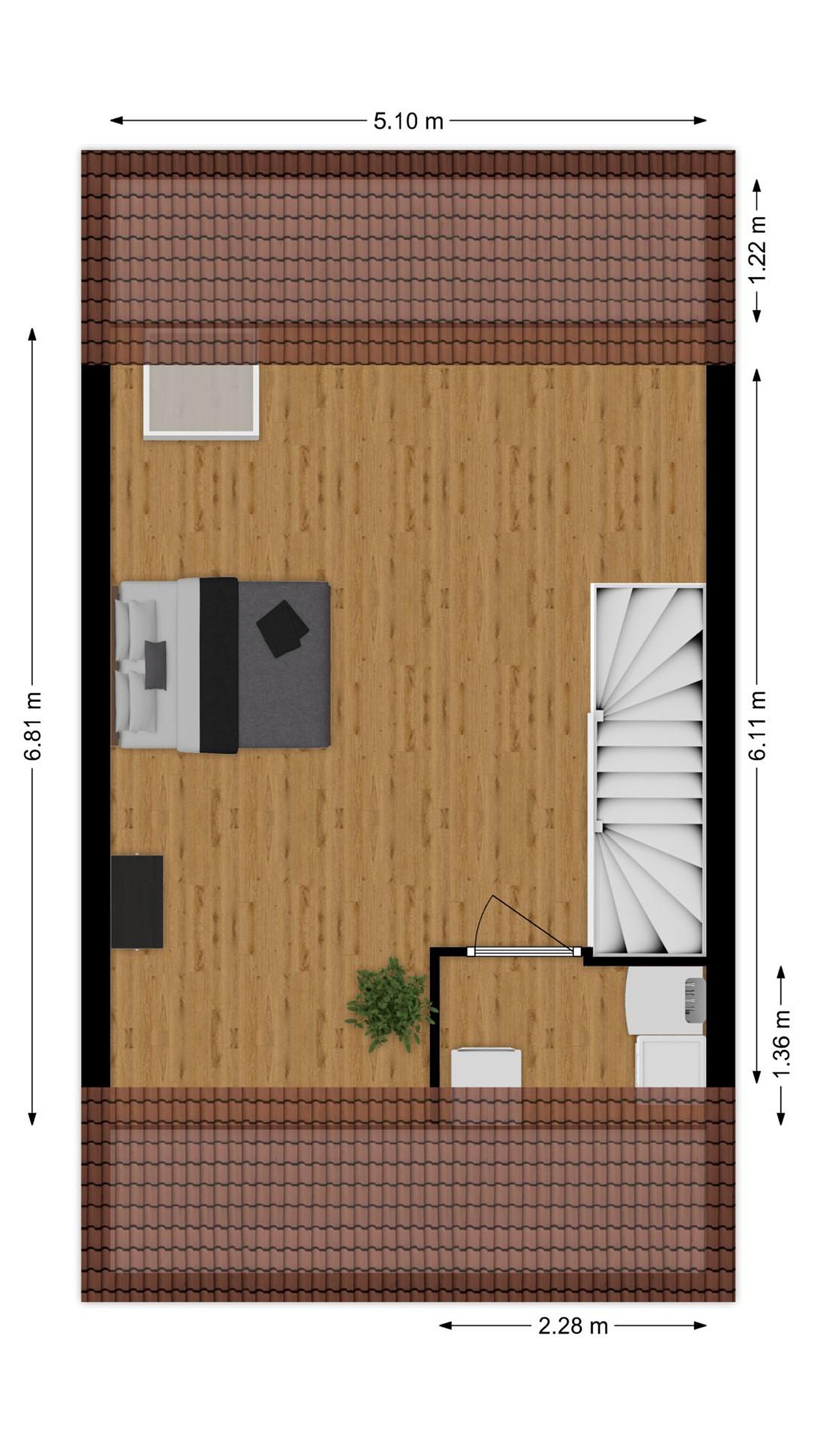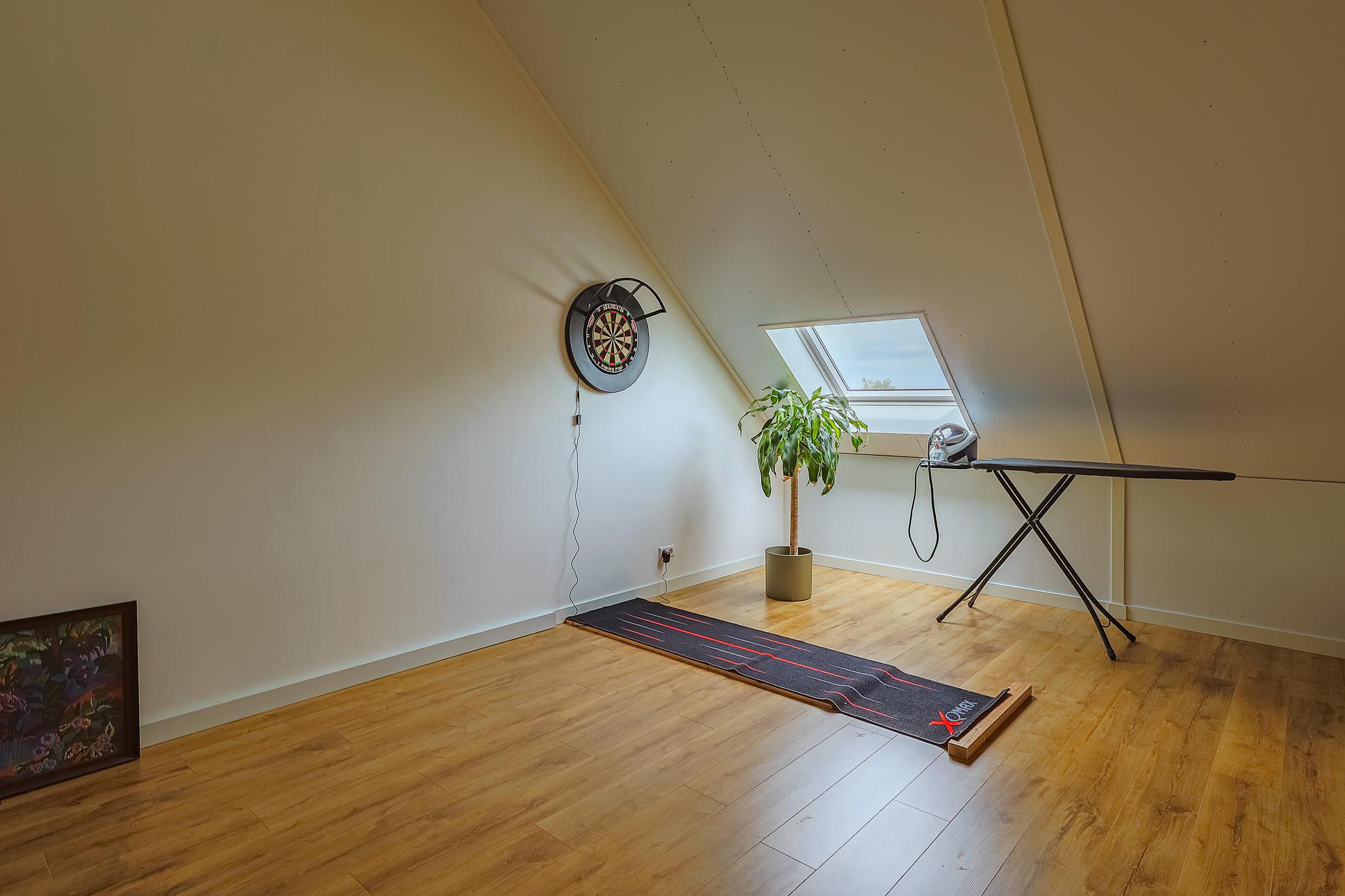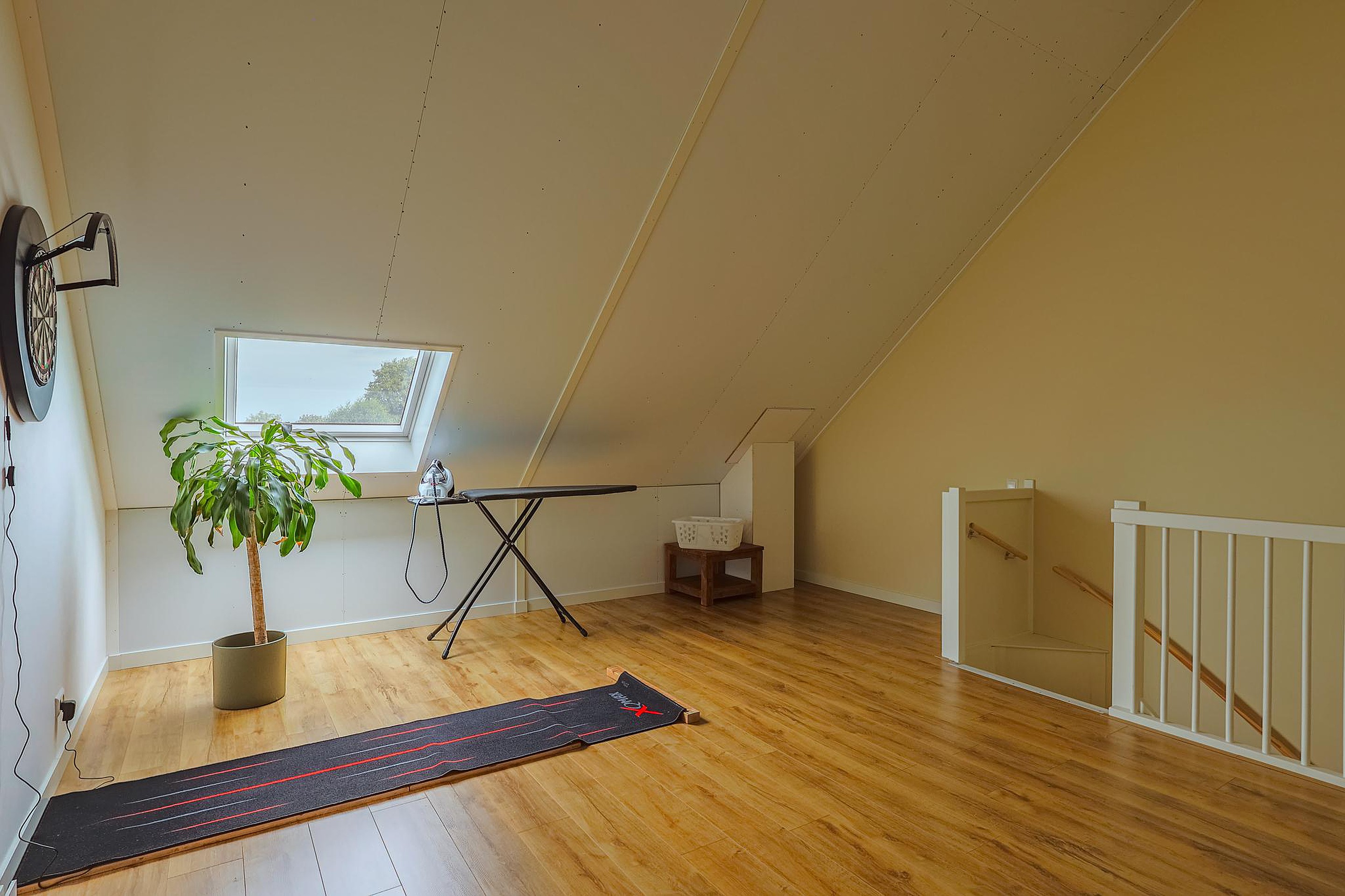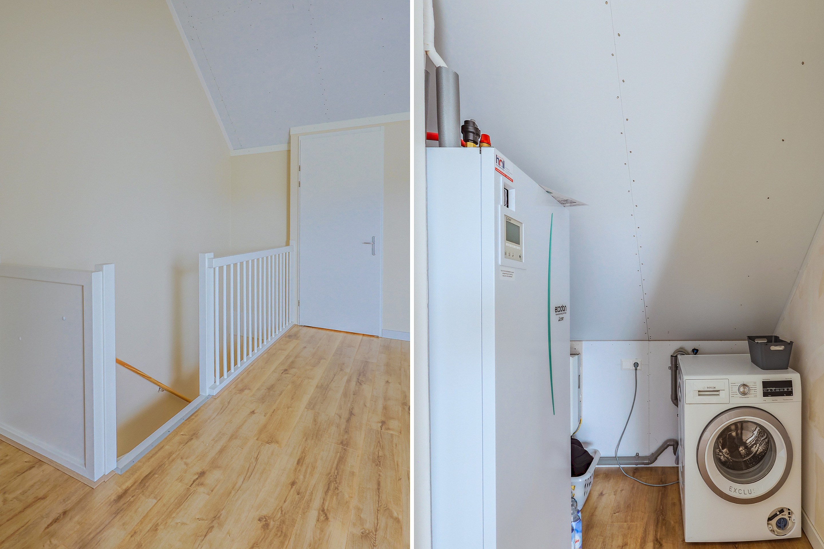 Tweede verdieping De ruime zolderetage met groot dakraam is multifunctioneel inzetbaar en beschikt over een afgesloten technische ruimte met de wasmachineaansluiting, de warmtepomp en de omvormer voor de zonnepanelen. Er bestaat hier de mogelijkheid meerdere slaapkamers te creëren.
