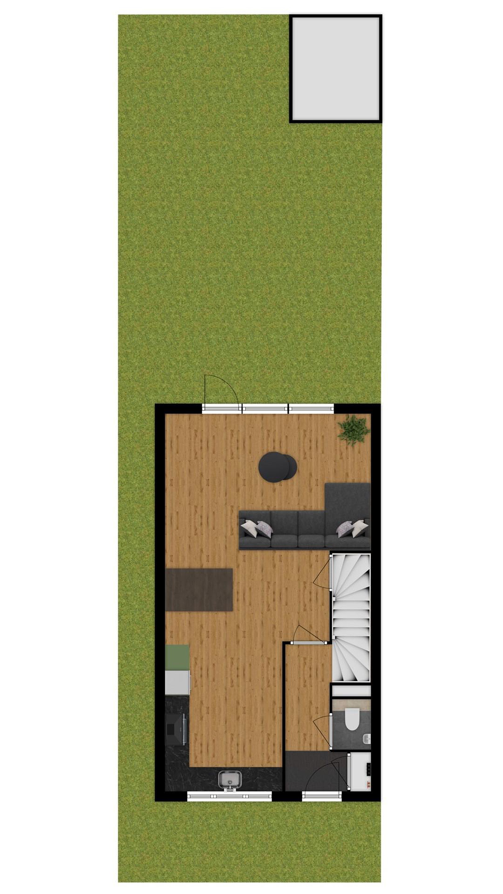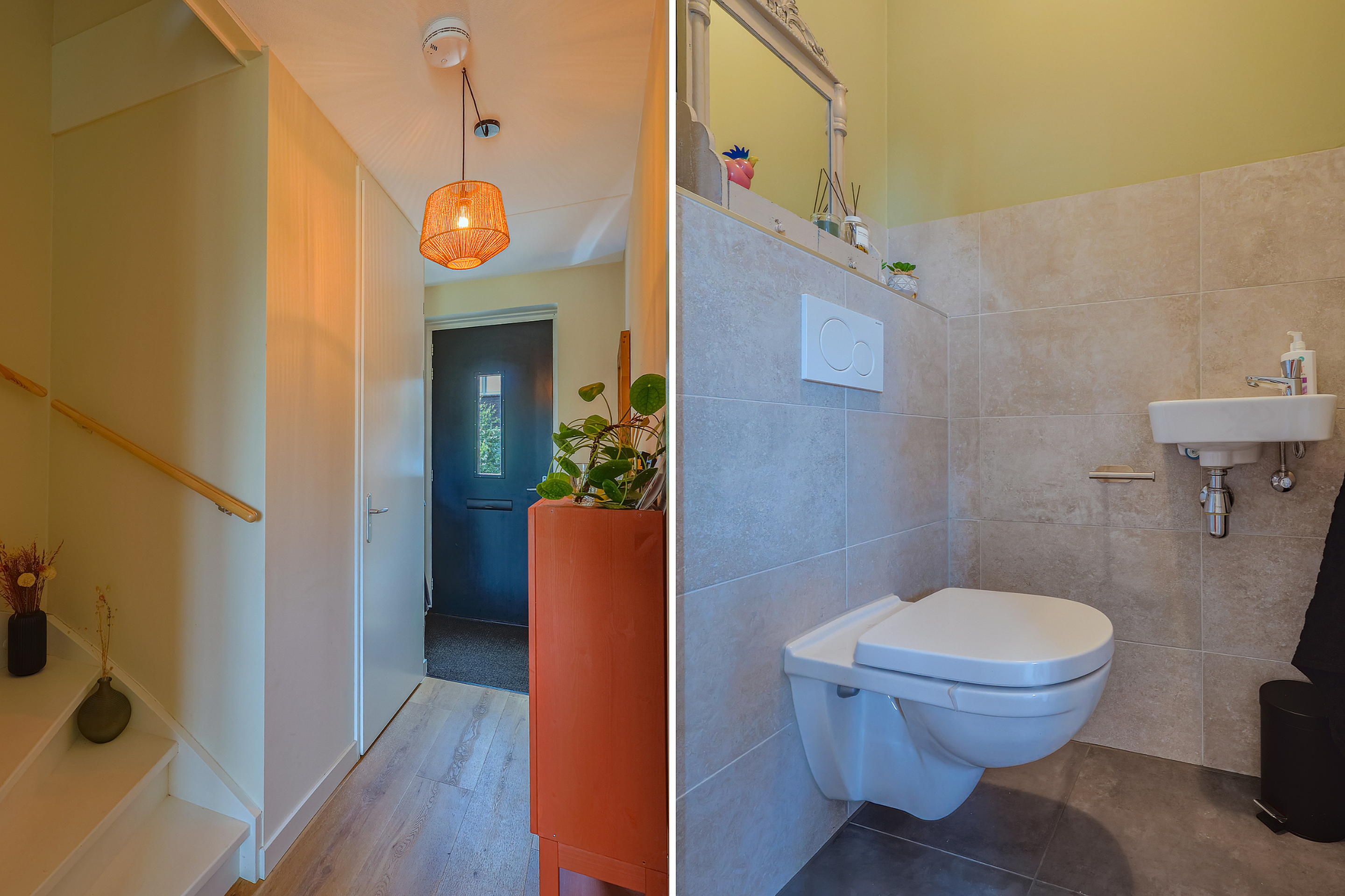 Begane grond Entree in de hal voorzien van de keurige toiletruimte voorzien van zwevend toilet en fonteintje, garderobe, trapopgang en de toegang tot de woonkamer. De woonkamer is opgedeeld in een eetgedeelte en een zitgedeelte. Het eetgedeelte bevindt zich direct naast de open keuken en vormt een natuurlijke overgang tussen de keuken en het woongedeelte. Aan de tuinzijde is het zitgedeelte met praktische trapkast gesitueerd. De gehele ruimte is net als de hal afgewerkt met een keurig doorgelegde pvc-vloer. De keuken is rijkelijk uitgerust met onder meer een inductiekookplaat, een afzuigkap, oven, koel-/vriescombinatie en een vaatwasser. Door de raampartij aan de voorzijde heb je een leuke kijk op de voorgelegen straat.