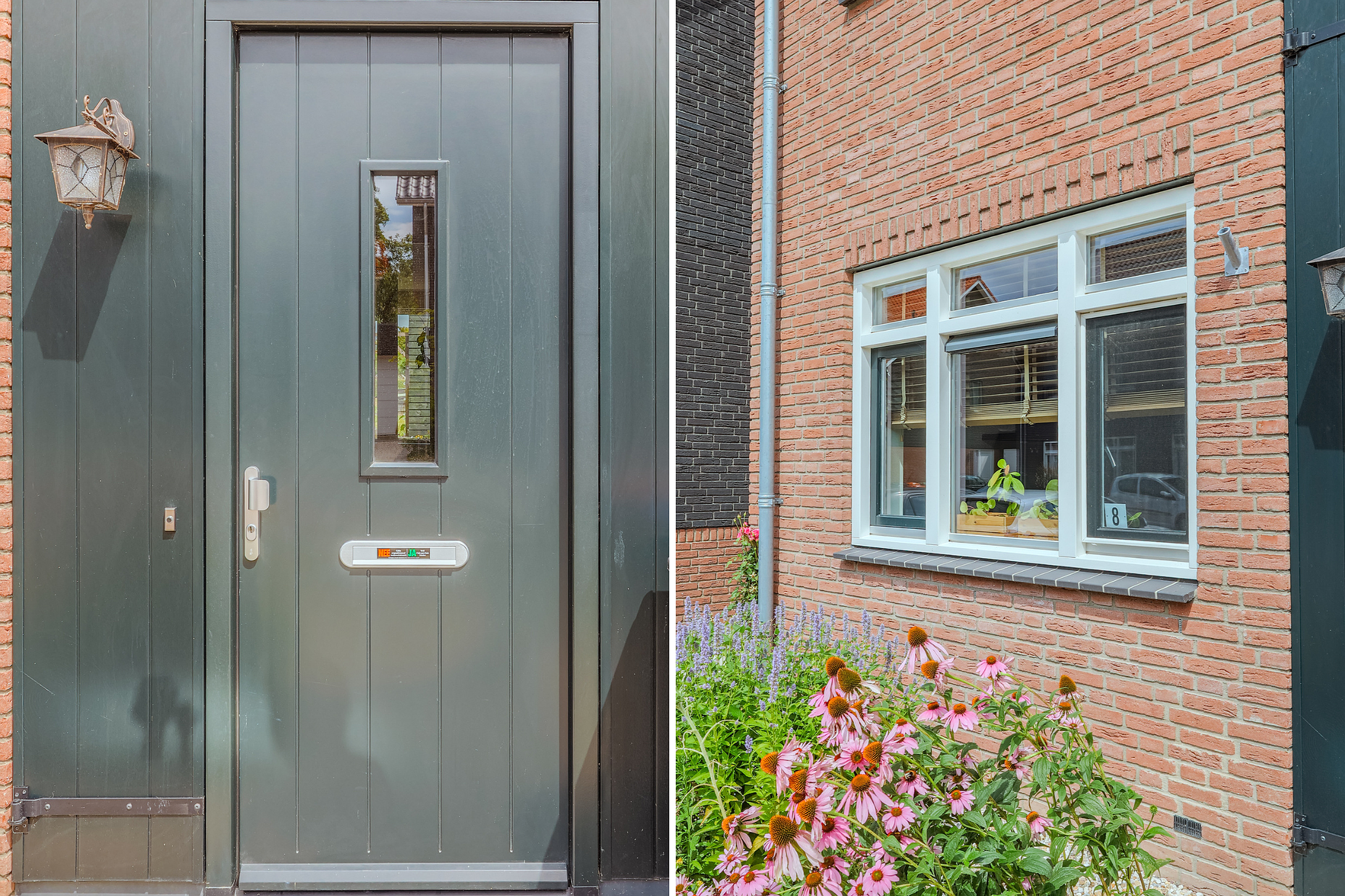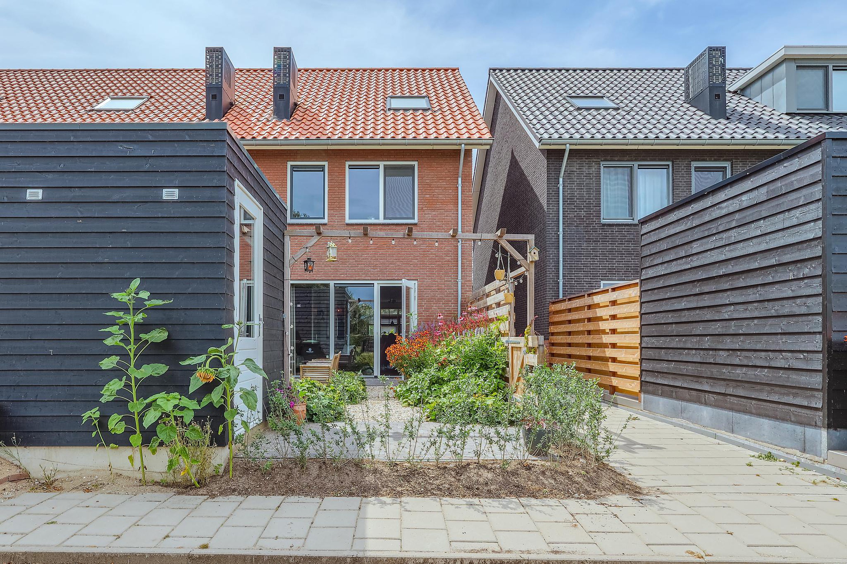 Aan de voorzijde van de woning bevindt zich een fraai aangelegde plantenborder met een variëteit aan kleurrijke bloemen en beplanting. Daarnaast zijn hier het pad naar de voordeur en een praktische opstelplaats voor de afvalcontainers gesitueerd. Via de brandgang aan de zijkant is de achterom bereikbaar.