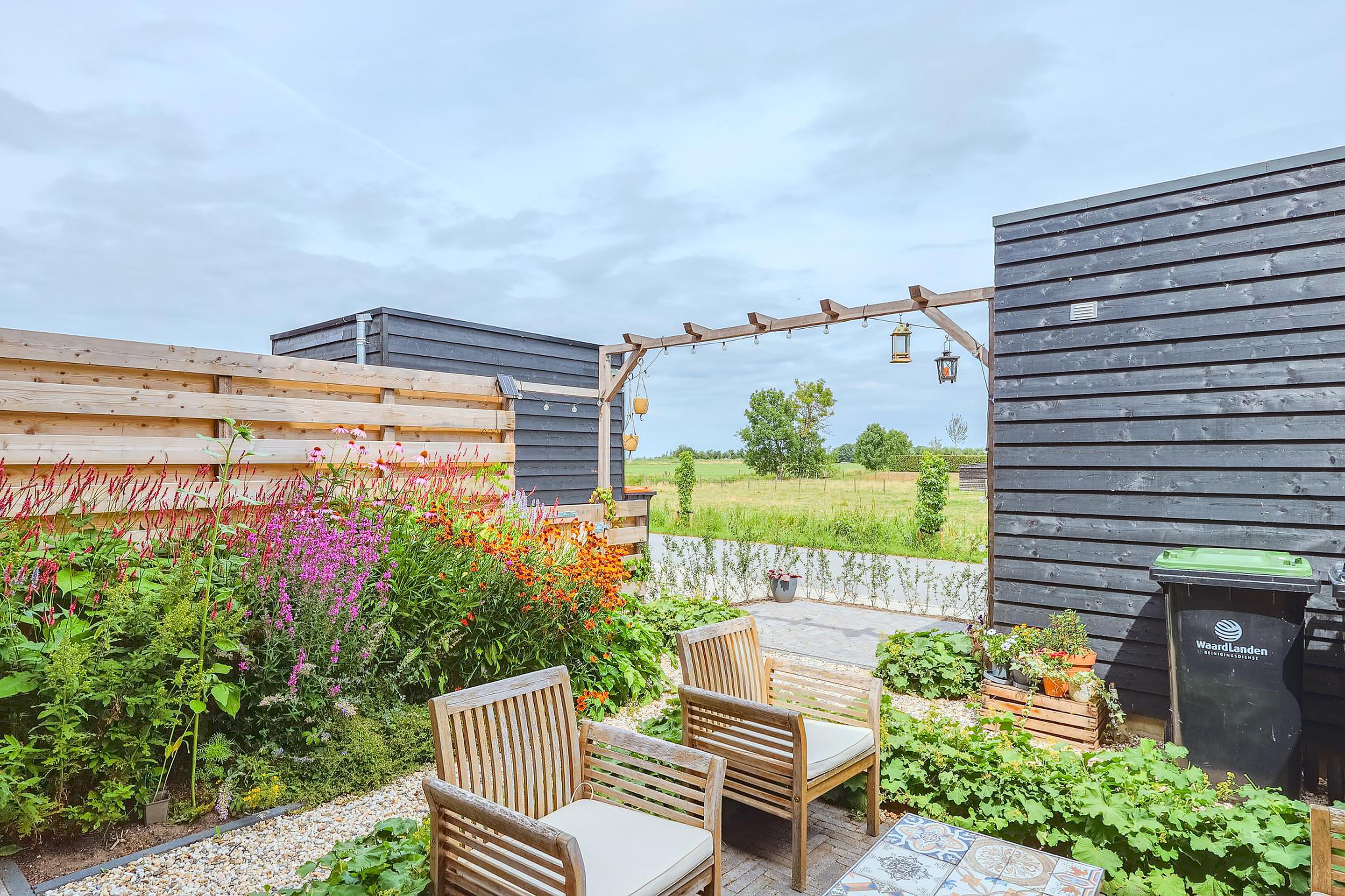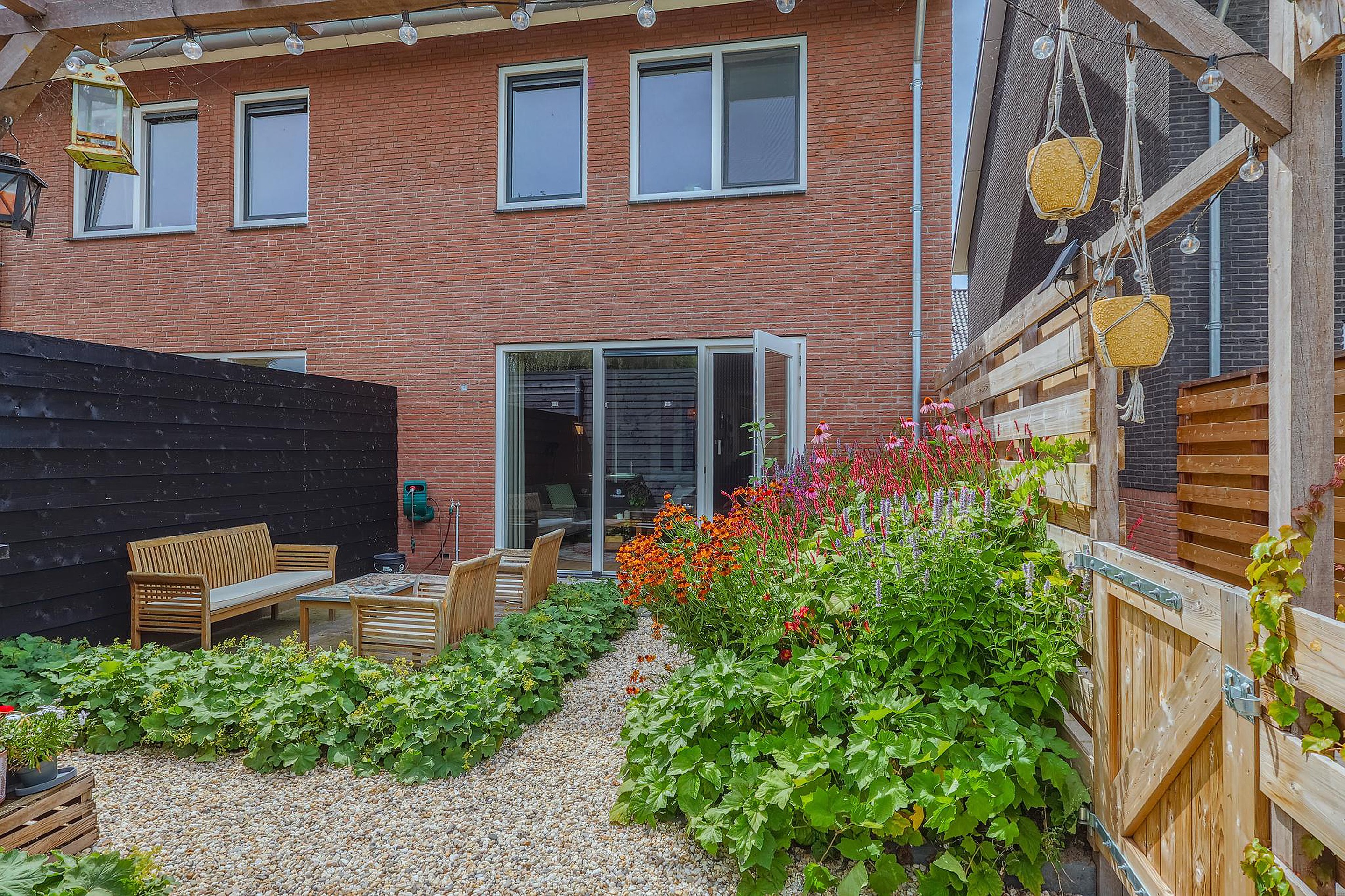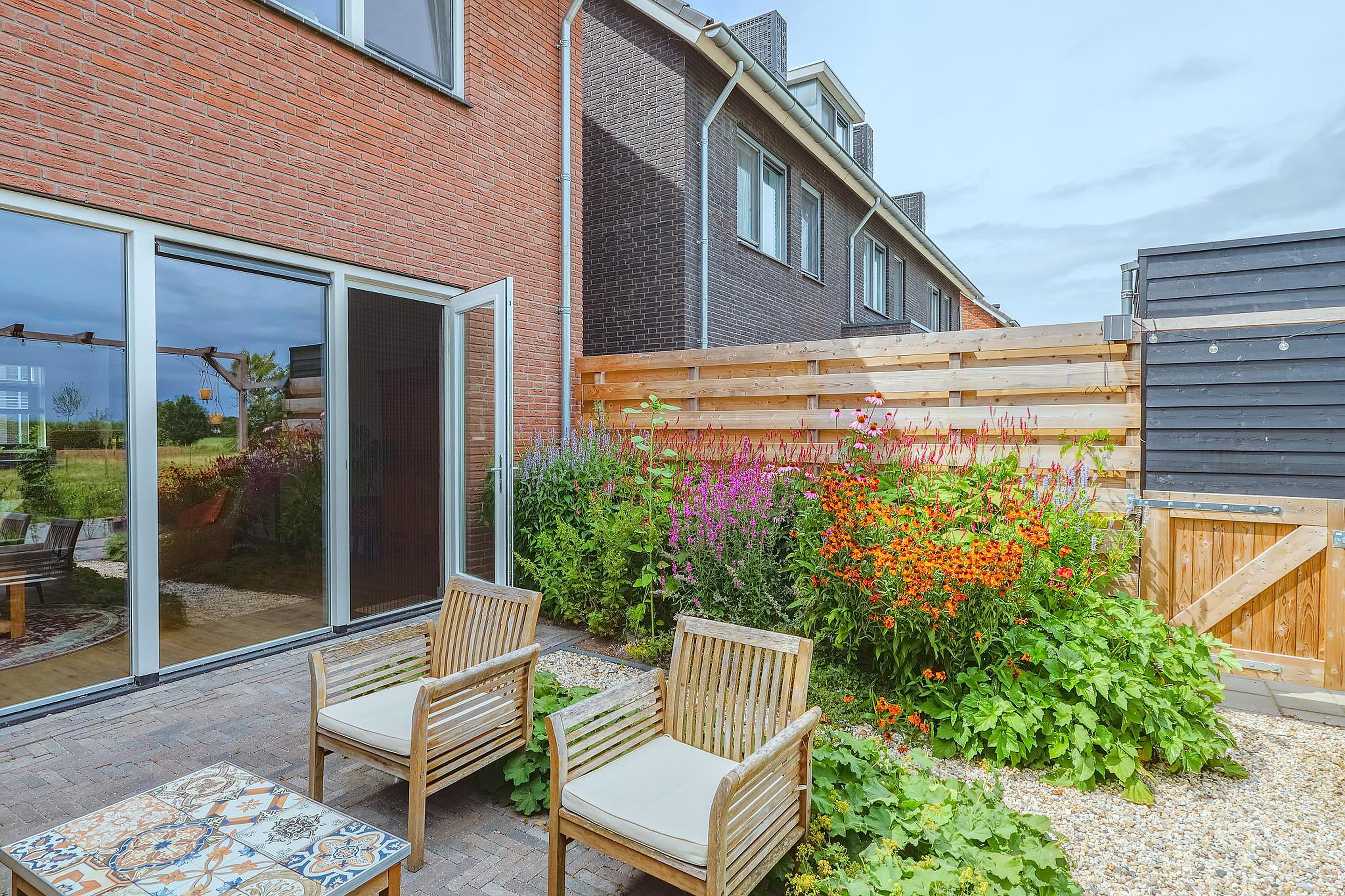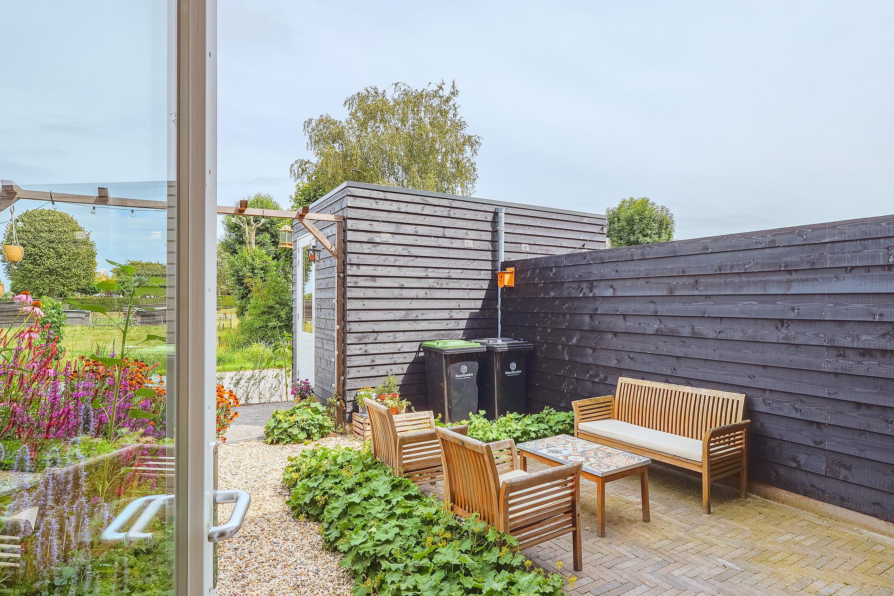 De achtertuin is gelegen op het oosten en is sfeervol ingericht met een afwisseling van bestrating, grind en plantenborders. De tuin beschikt over een achterom en achter op het perceel bevindt zich een praktische berging van circa 5 m2. Daarachter is het karakteristieke boerenpad behouden gebleven, vanwaar je een prachtig uitzicht hebt over het achterliggende polderlandschap.