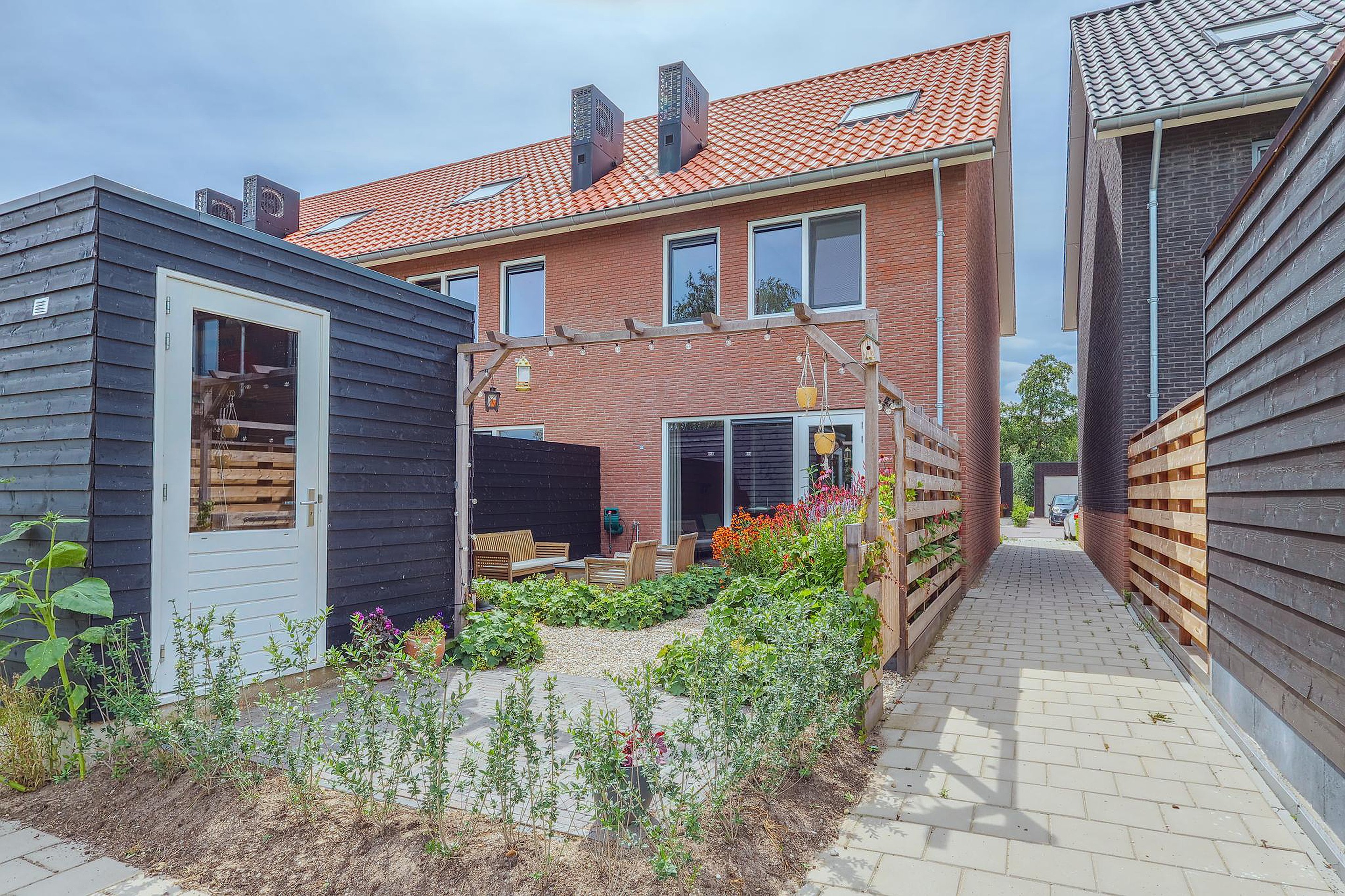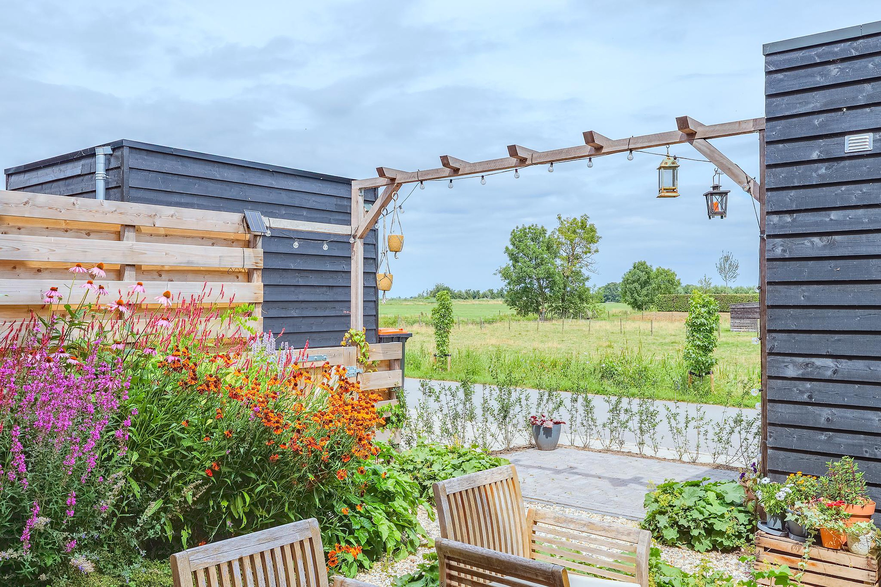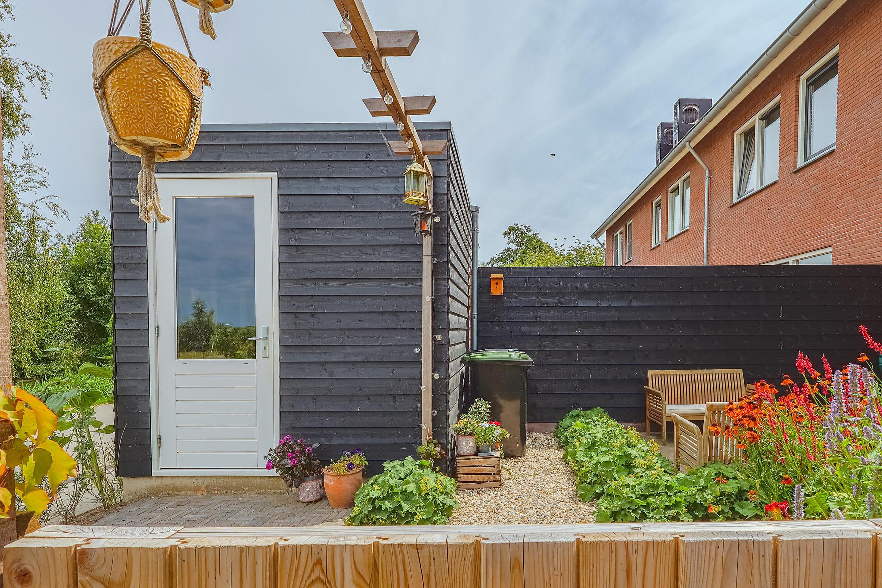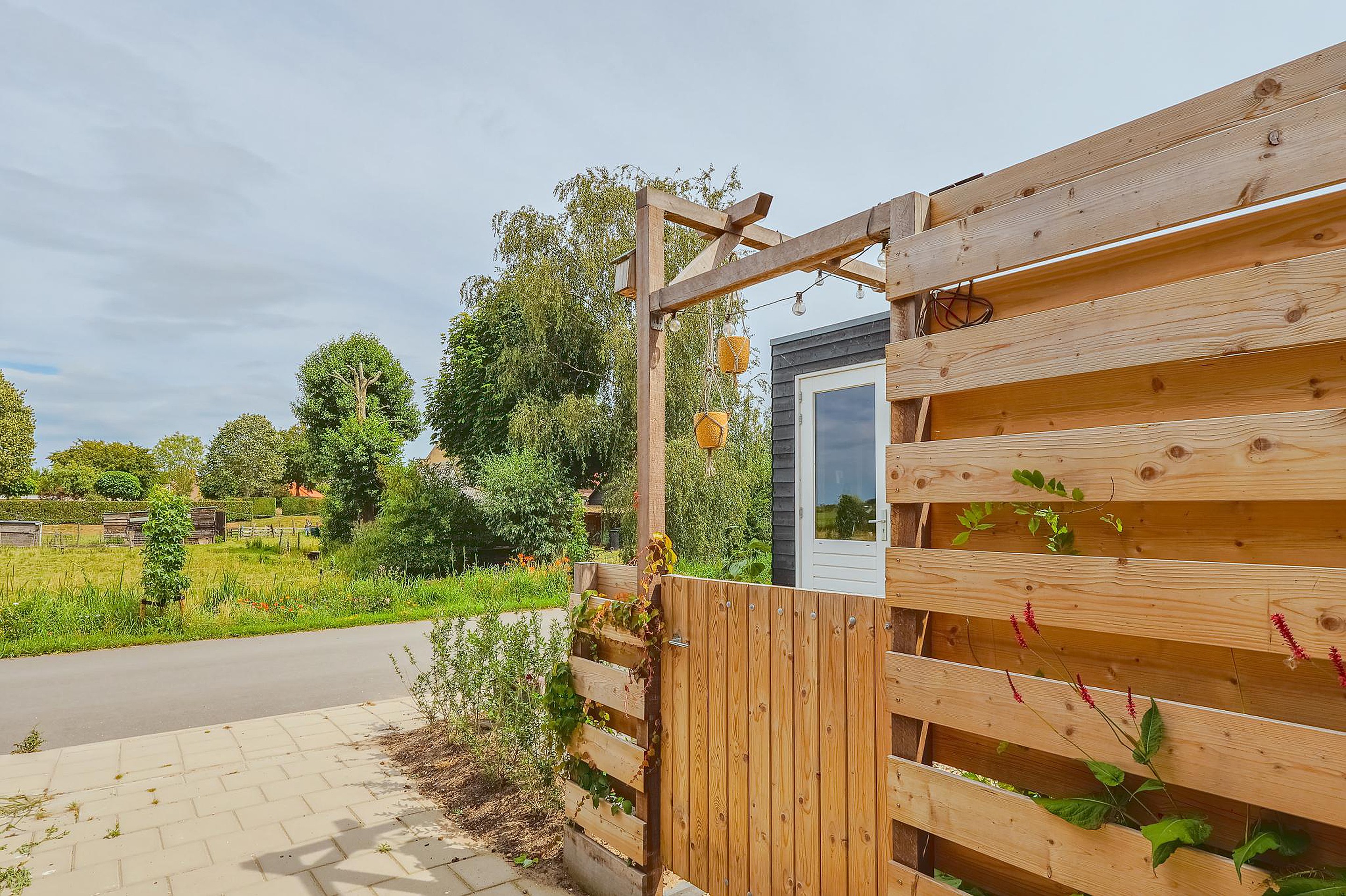 De achtertuin is gelegen op het oosten en is sfeervol ingericht met een afwisseling van bestrating, grind en plantenborders. De tuin beschikt over een achterom en achter op het perceel bevindt zich een praktische berging van circa 5 m2. Daarachter is het karakteristieke boerenpad behouden gebleven, vanwaar je een prachtig uitzicht hebt over het achterliggende polderlandschap.