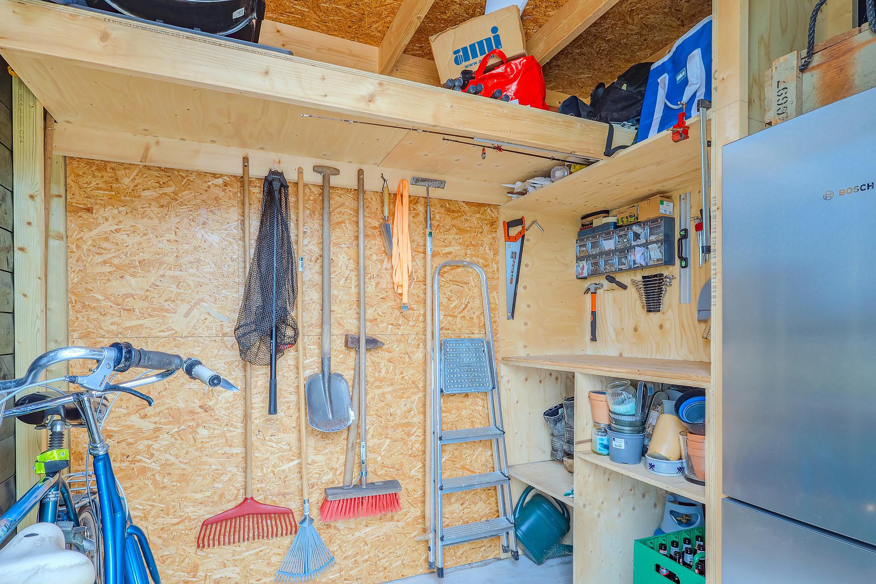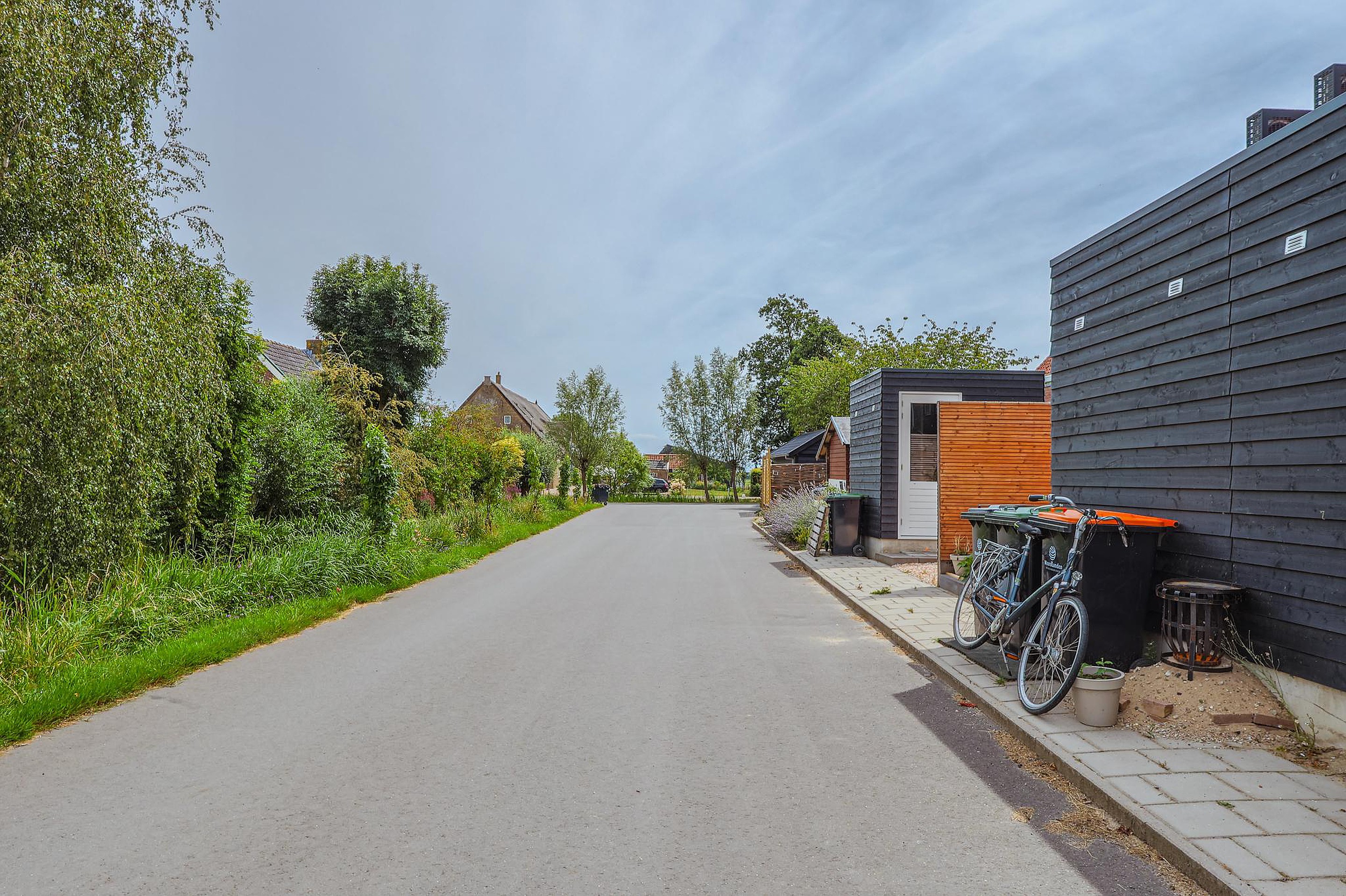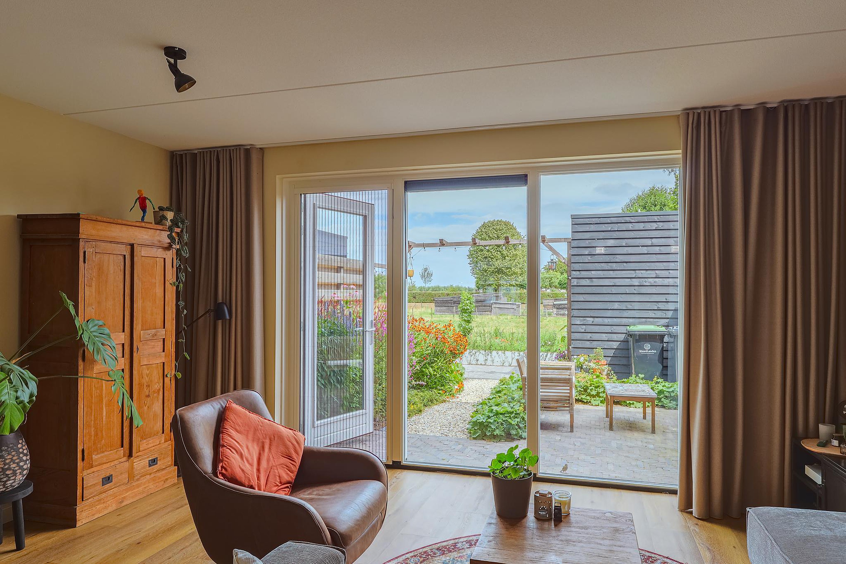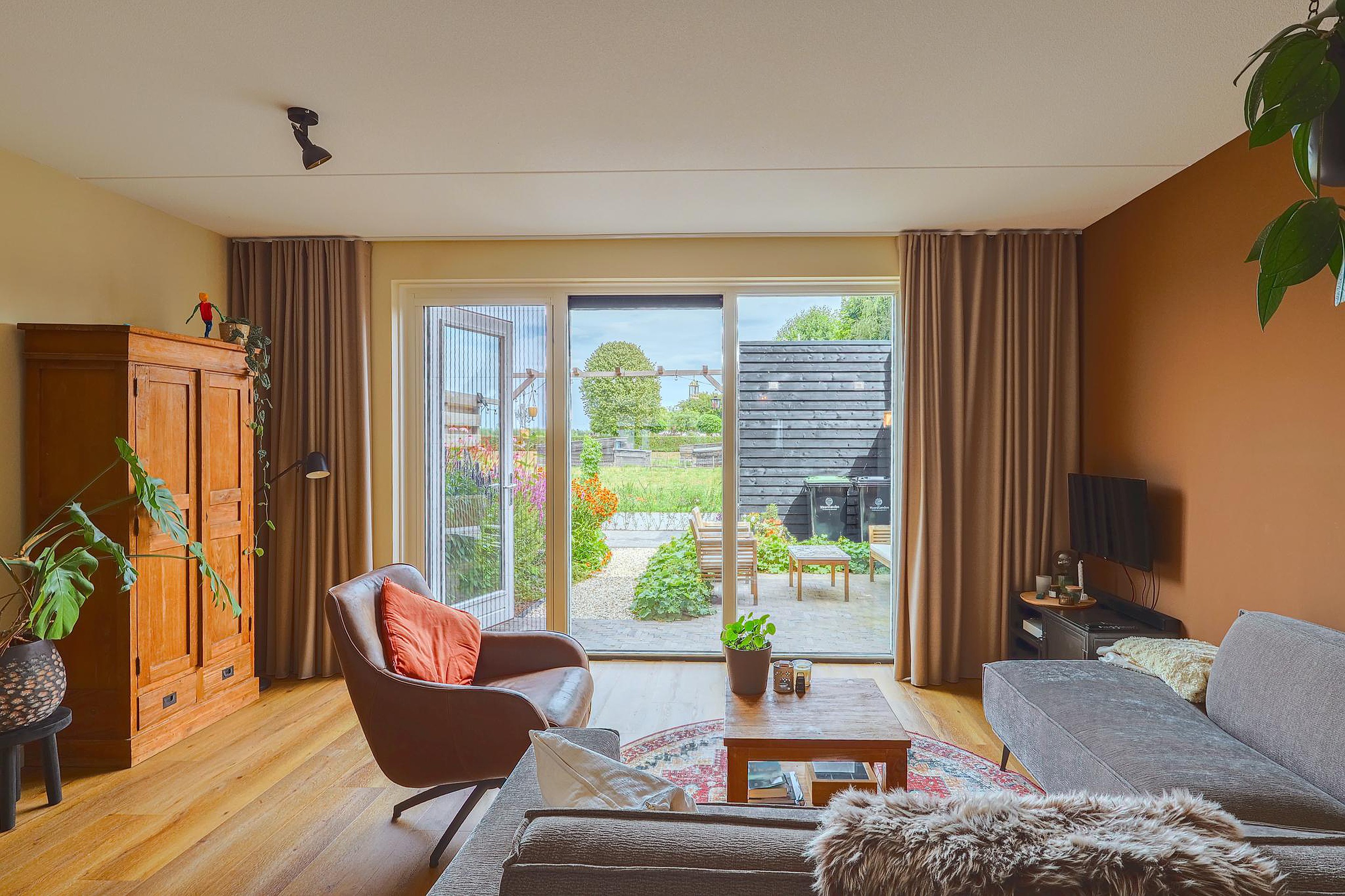 De achtertuin is gelegen op het oosten en is sfeervol ingericht met een afwisseling van bestrating, grind en plantenborders. De tuin beschikt over een achterom en achter op het perceel bevindt zich een praktische berging van circa 5 m2. Daarachter is het karakteristieke boerenpad behouden gebleven, vanwaar je een prachtig uitzicht hebt over het achterliggende polderlandschap.