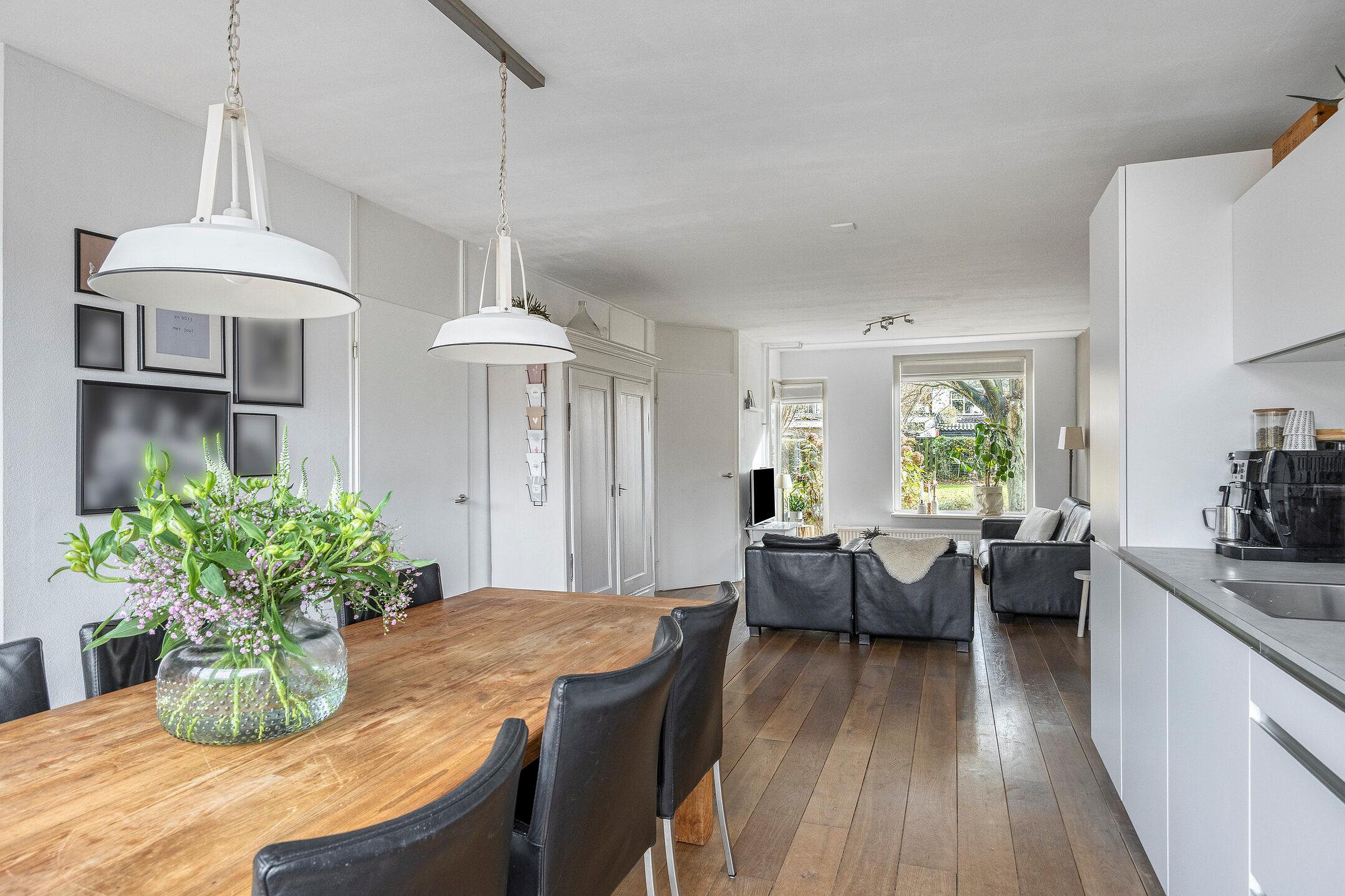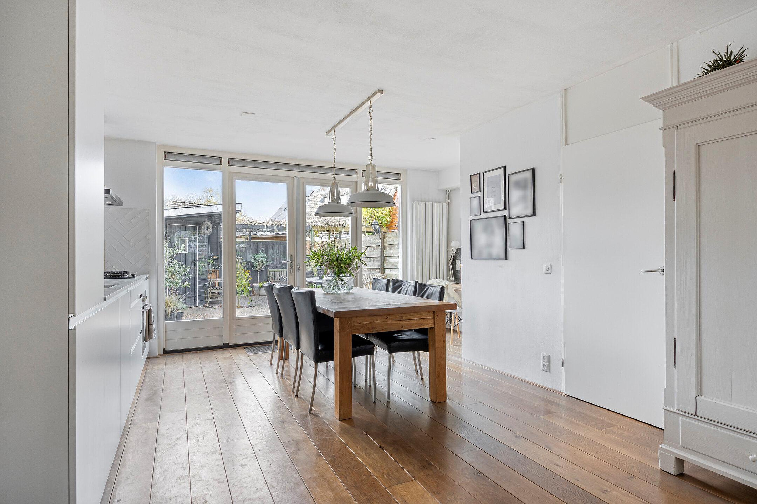 Begane grond Via de entree bereikt u de lichte doorzonwoonkamer met massieve houten vloer. Het grote raam aan de voorzijde én de vernieuwde pui aan de achterzijde zorgen voor een fijne lichtinval. De open keuken (2022) is uitgevoerd in een extra diepe opstelling voor extra bergruimte en voorzien van moderne apparatuur, waaronder een oven, XXL-vaatwasser, koelkast, no-frost vriezer en een 10 liter close-in boiler voor snel warm water. De voorbereiding voor een inductiekookplaat is overigens ook al aanwezig. Via de openslaande deuren bereikt u de achtertuin.