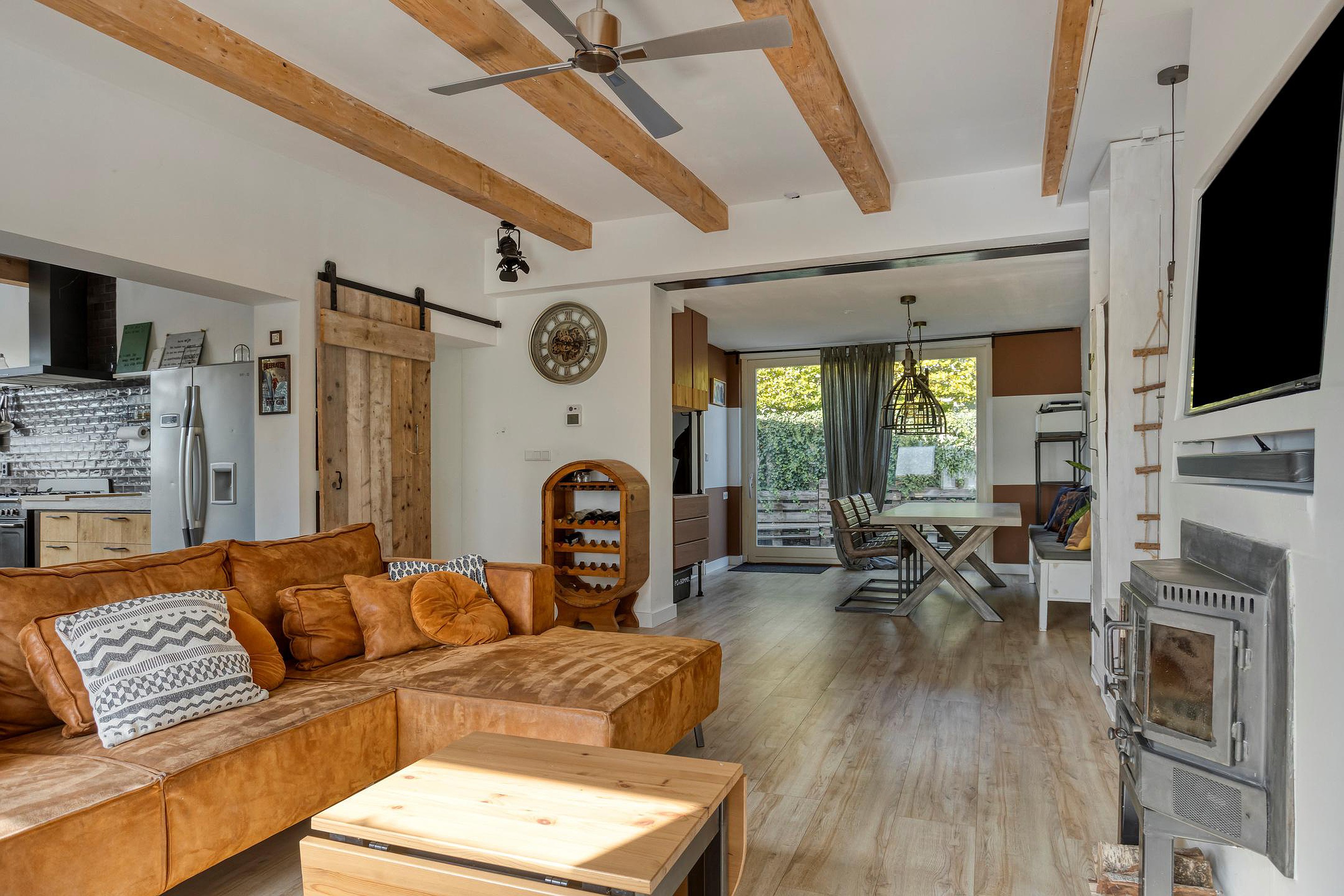 Bij binnenkomst valt direct de ruime en lichte woonkamer op, afgewerkt met pvc-vloer en vloerverwarming voor optimaal comfort. Aan de voorzijde bevindt zich de keuken, een echte eyecatcher voor kookliefhebbers. Deze is uitgerust met een quooker, afzuigkap, 6-pits gasfornuis met dubbele oven, een vaatwasser en een losse koelkast. Vanuit de keuken bereik je bovendien een praktische wasruimte.
