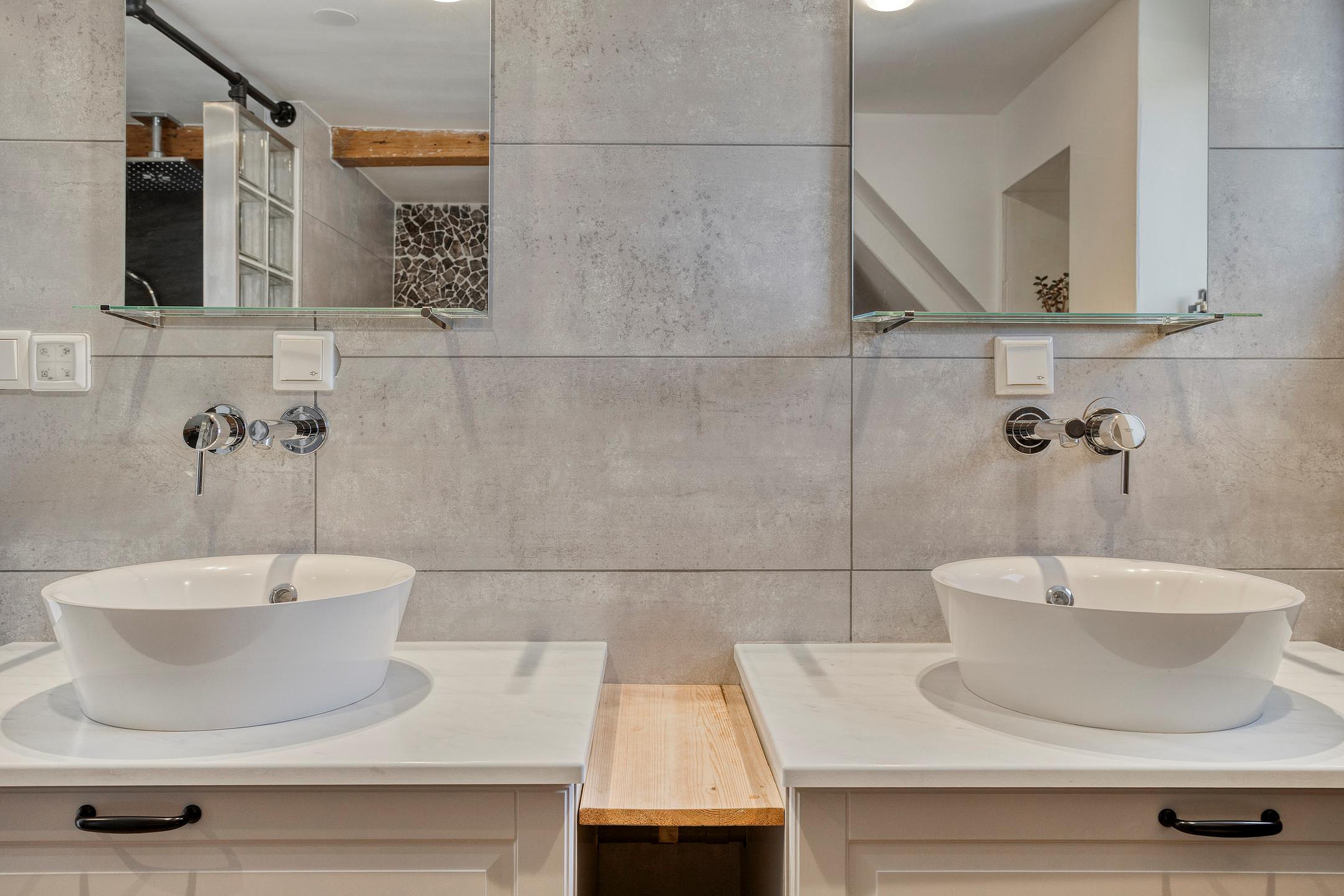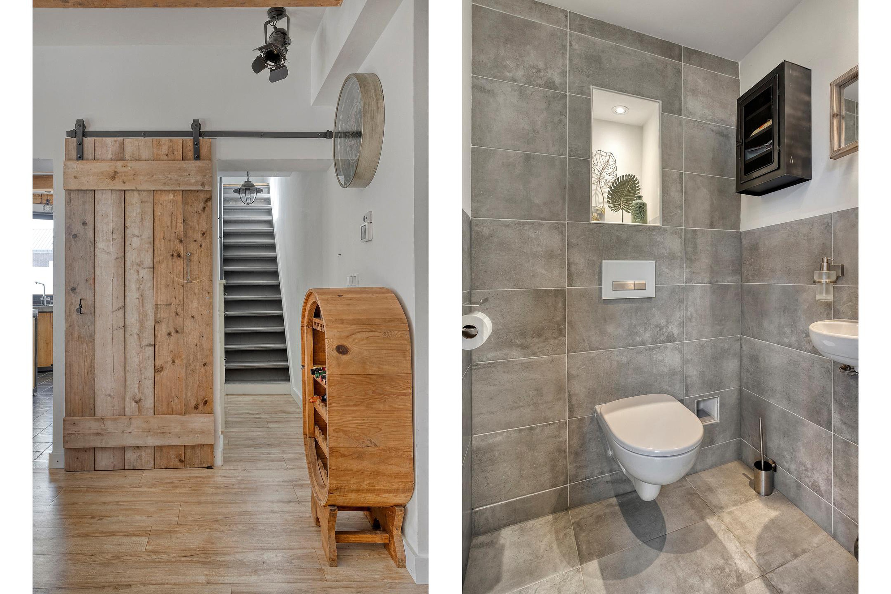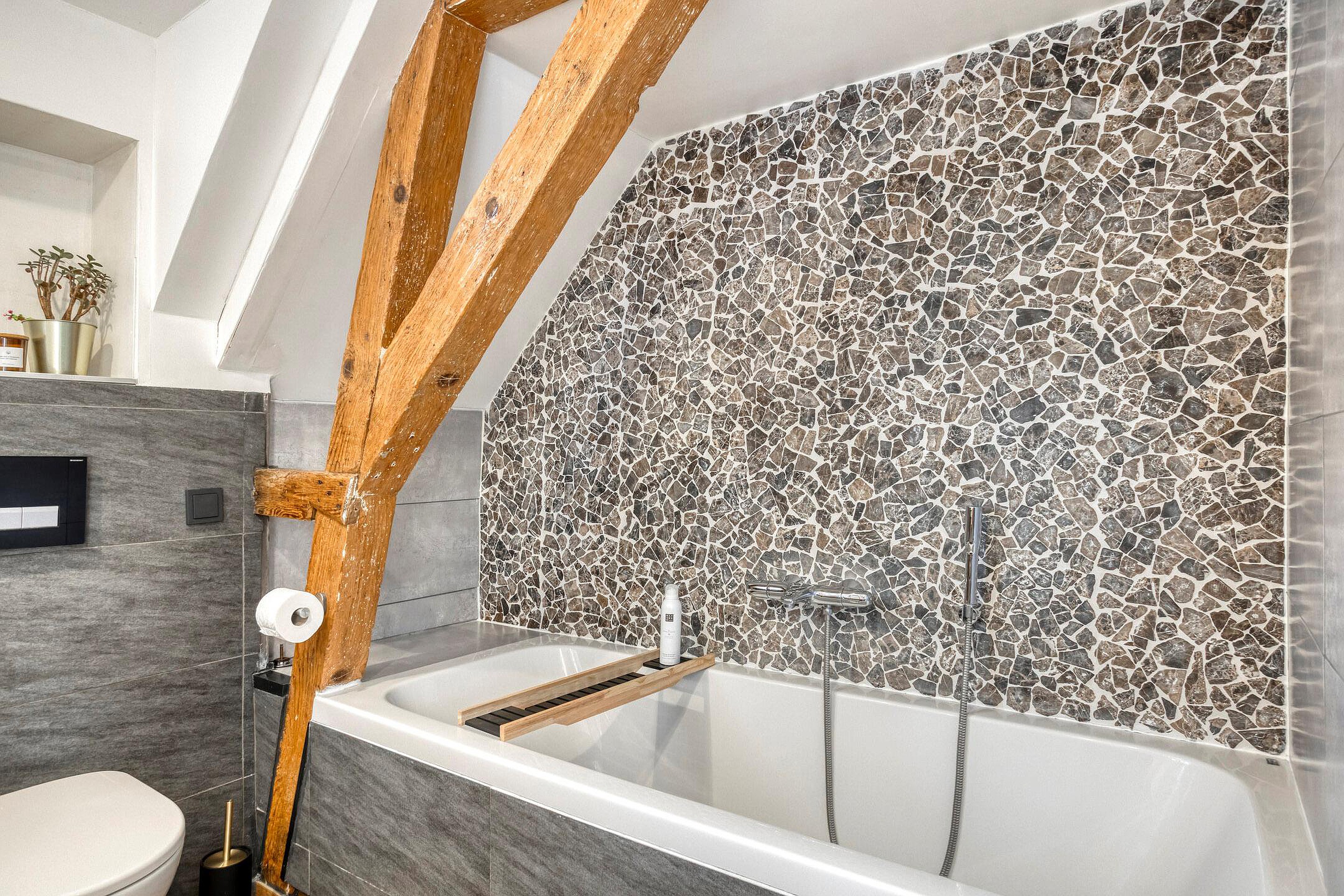 De ruime overloop is licht en praktisch, met plek voor de wasmachineopstelling. Er zijn drie slaapkamers, elk netjes afgewerkt met laminaatvloeren en gestuukte wanden en plafonds. In twee kamers zijn de originele balken in het zicht gelaten, wat de ruimtes een warme en karaktervolle uitstraling geeft.