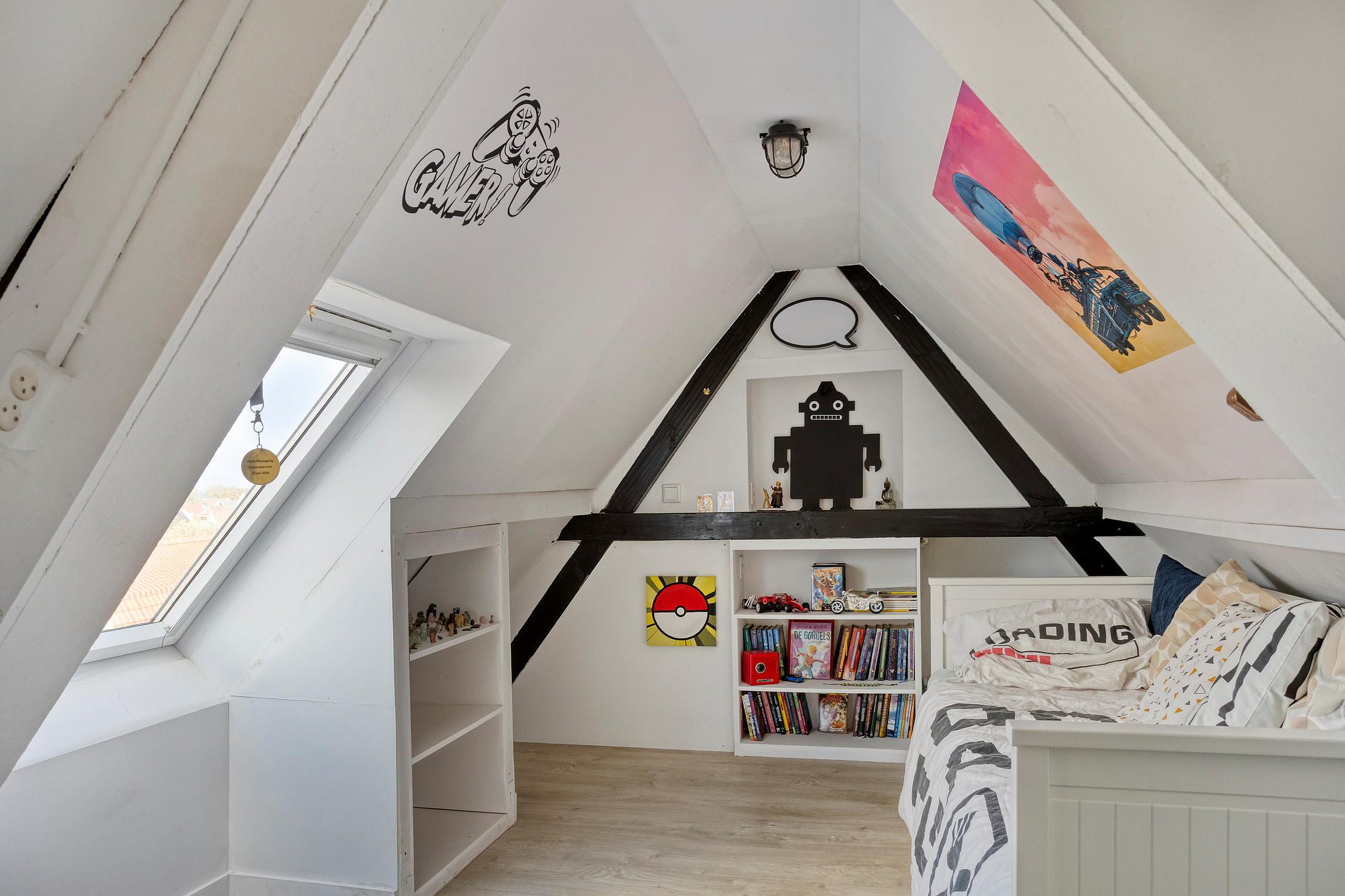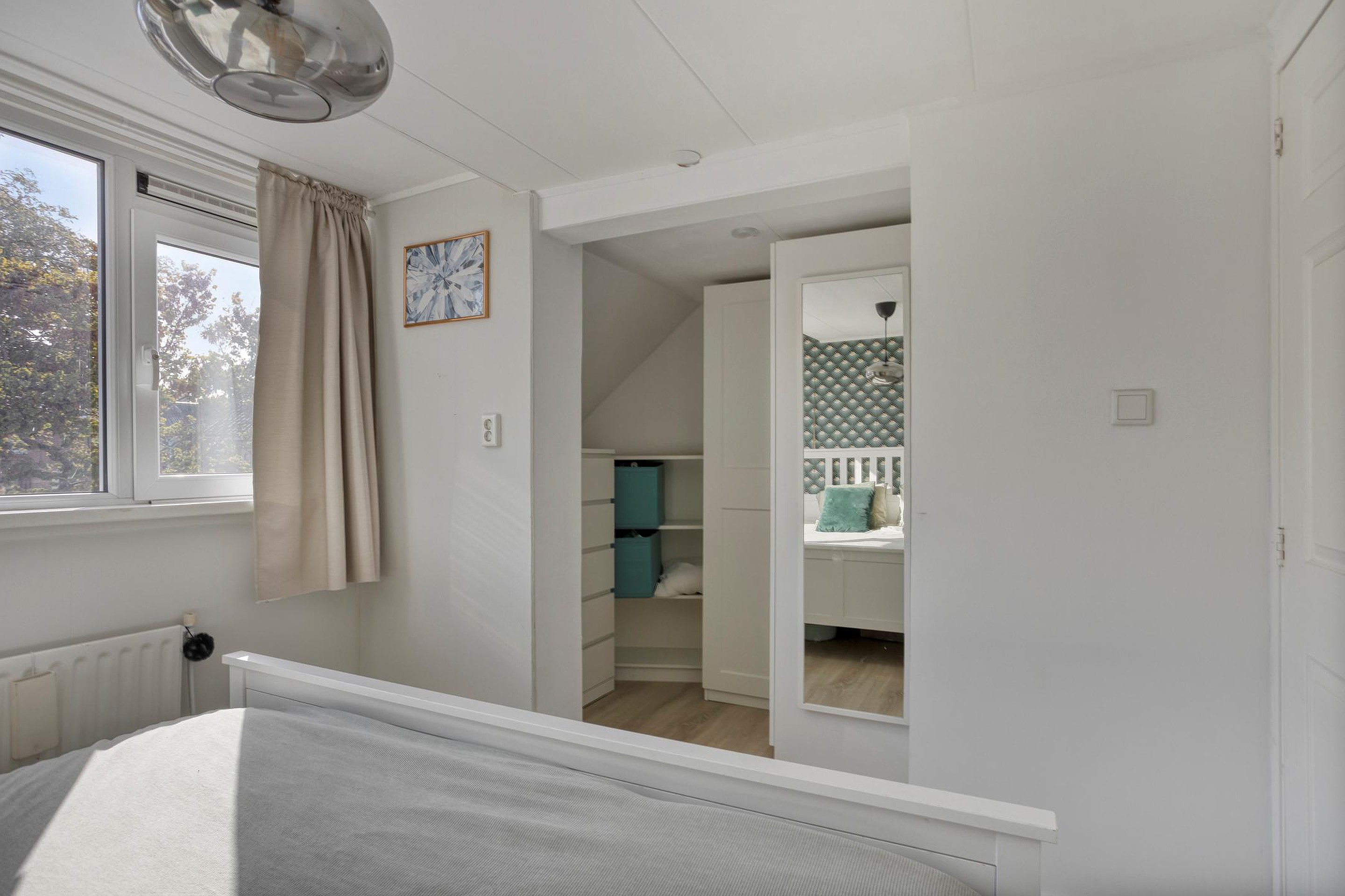 Via de vaste trap kom je op de tweede verdieping. Op de overloop is volop bergruimte en daarnaast bevindt zich hier de vierde slaapkamer. Dankzij de kapconstructie en ramen is dit een volwaardige kamer die geschikt is als slaapkamer, thuiskantoor of hobbyruimte. Net als de rest van het huis is ook deze verdieping netjes afgewerkt en direct te gebruiken.
