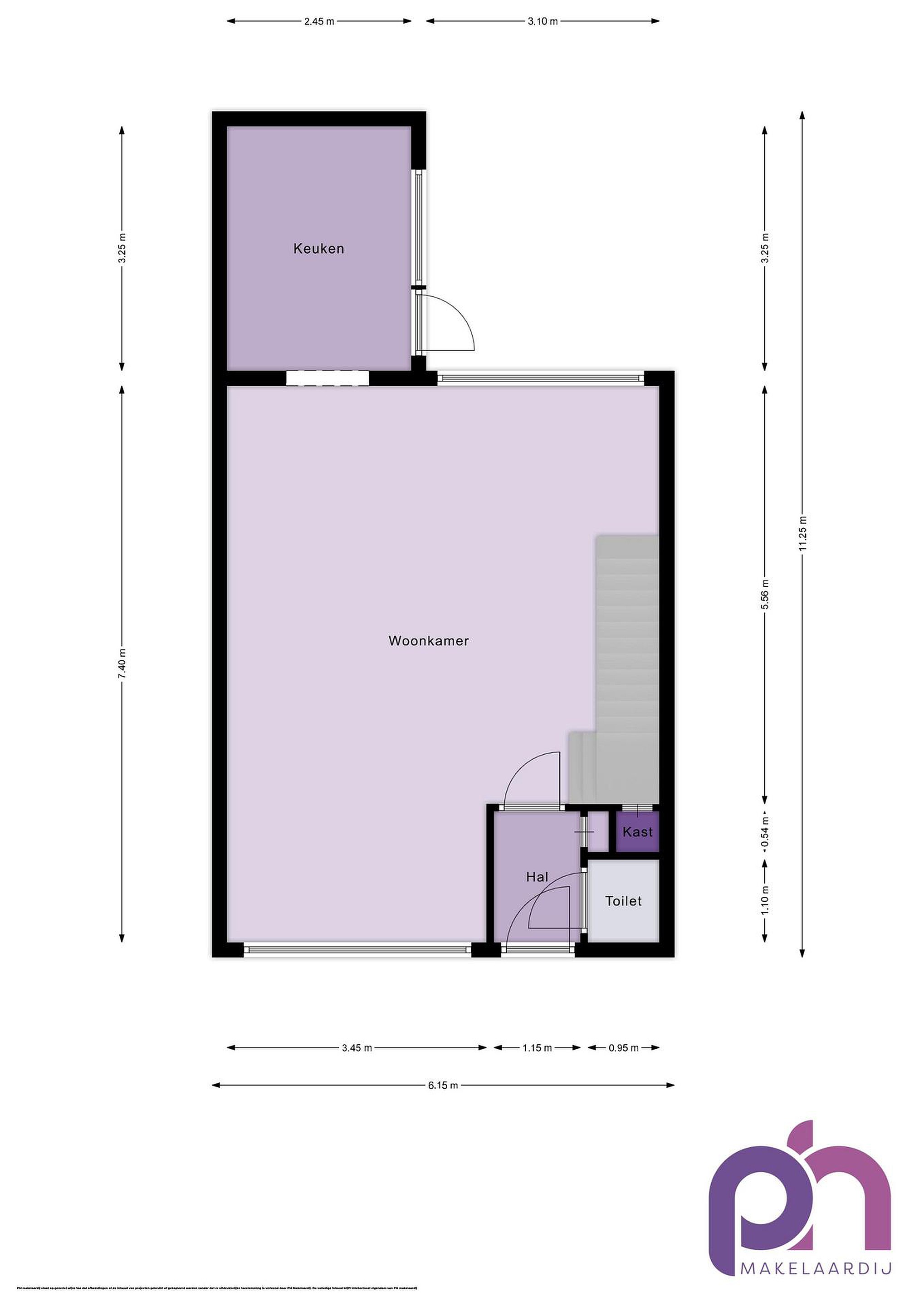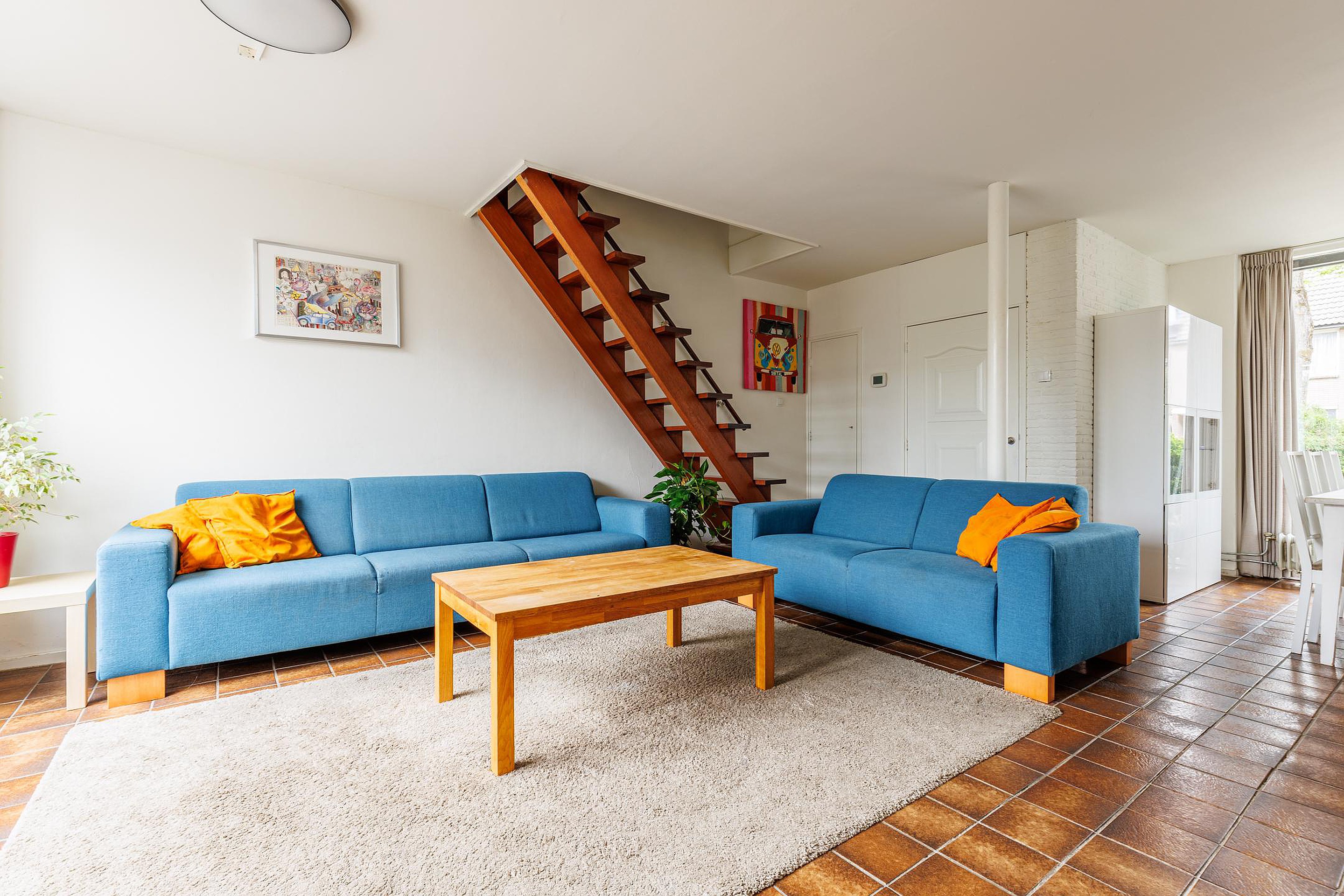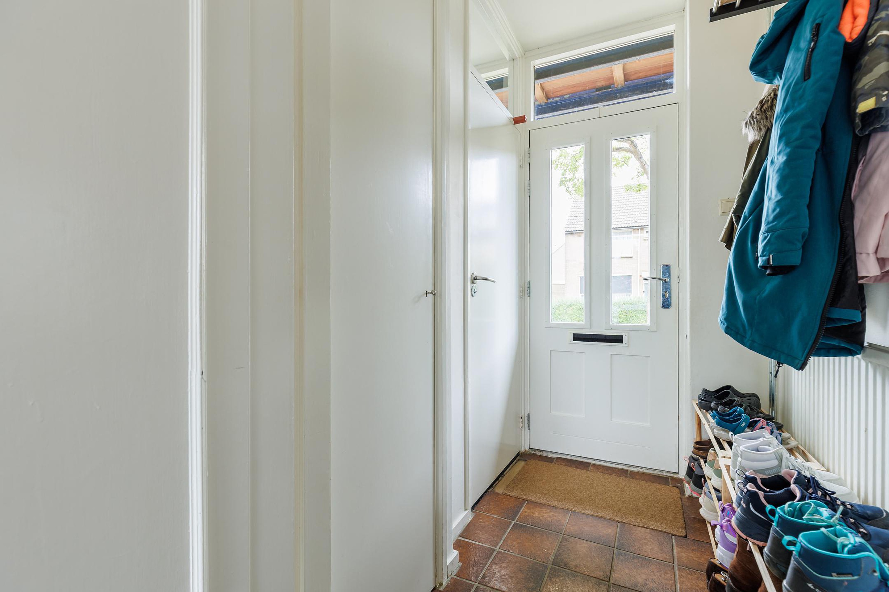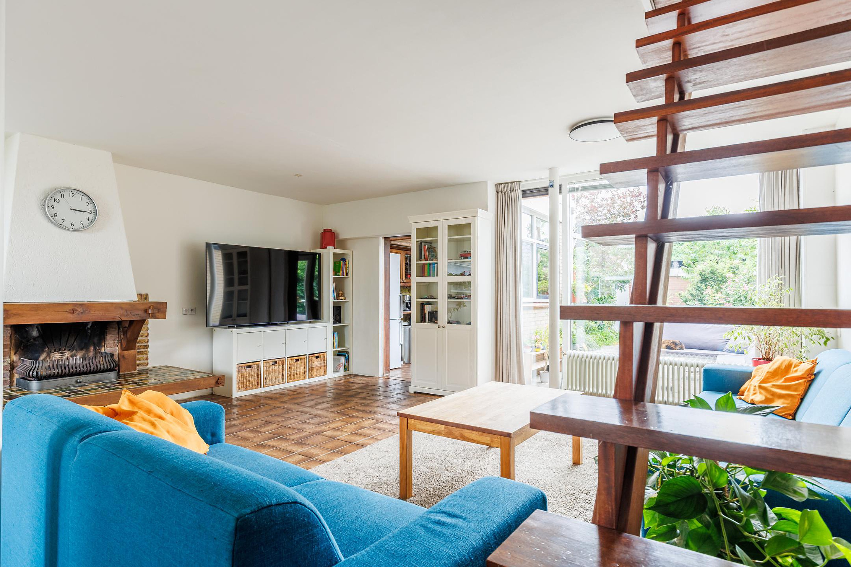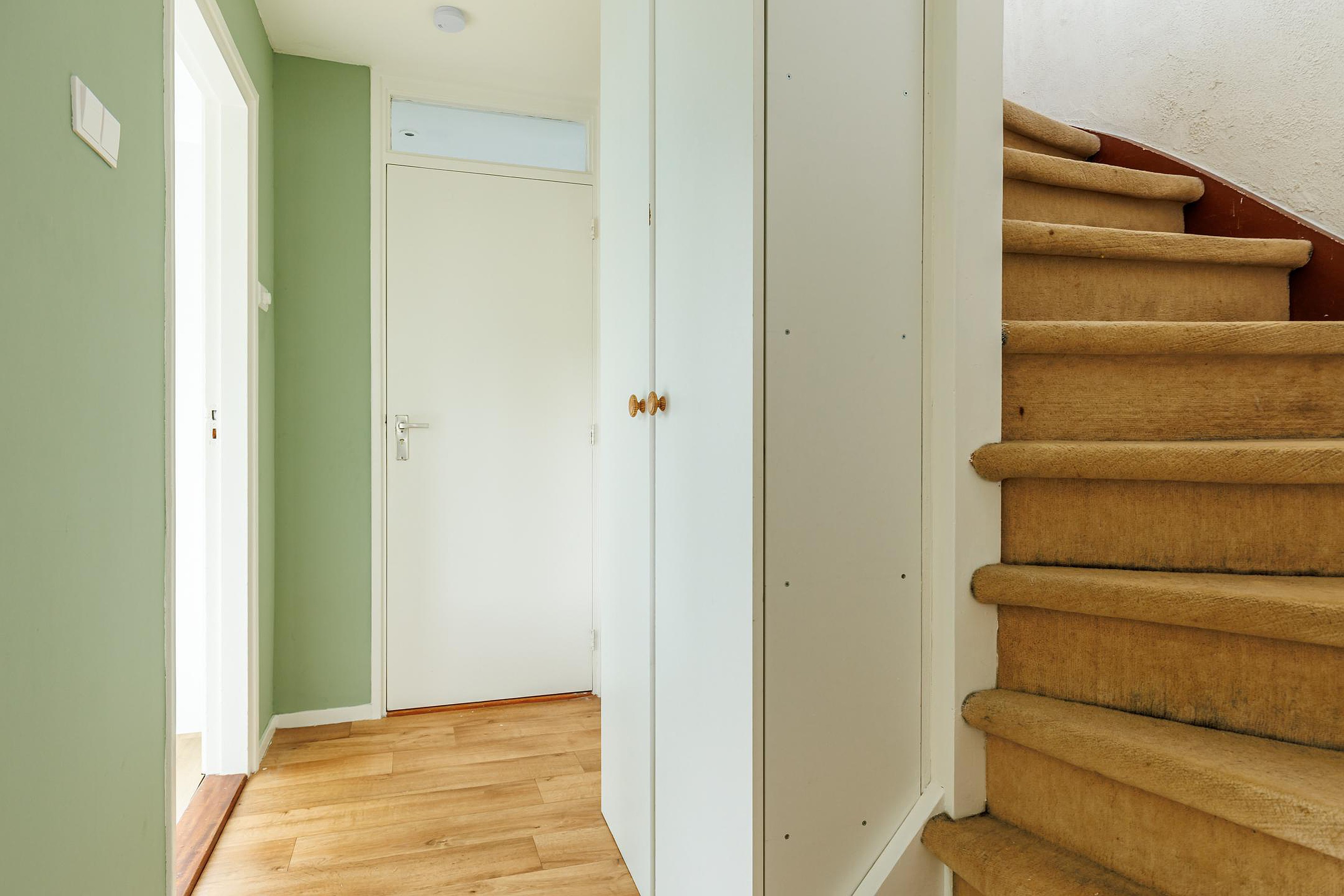 Entree met meterkast en toilet. Vanuit de hal stap je de doorzonwoonkamer binnen, voorzien van grote raampartijen aan de voor- en achterzijde en een open trapopgang naar de eerste verdieping. In het midden van de woonkamer bevindt zich een (niet-functionele) haard; de schoorsteen is in 2023 verwijderd, waardoor deze enkel nog als decoratief element aanwezig is. Aan de achterzijde van de woning bevindt zich de afgesloten keuken, met een praktische opstelling en een loopdeur naar de achtertuin.