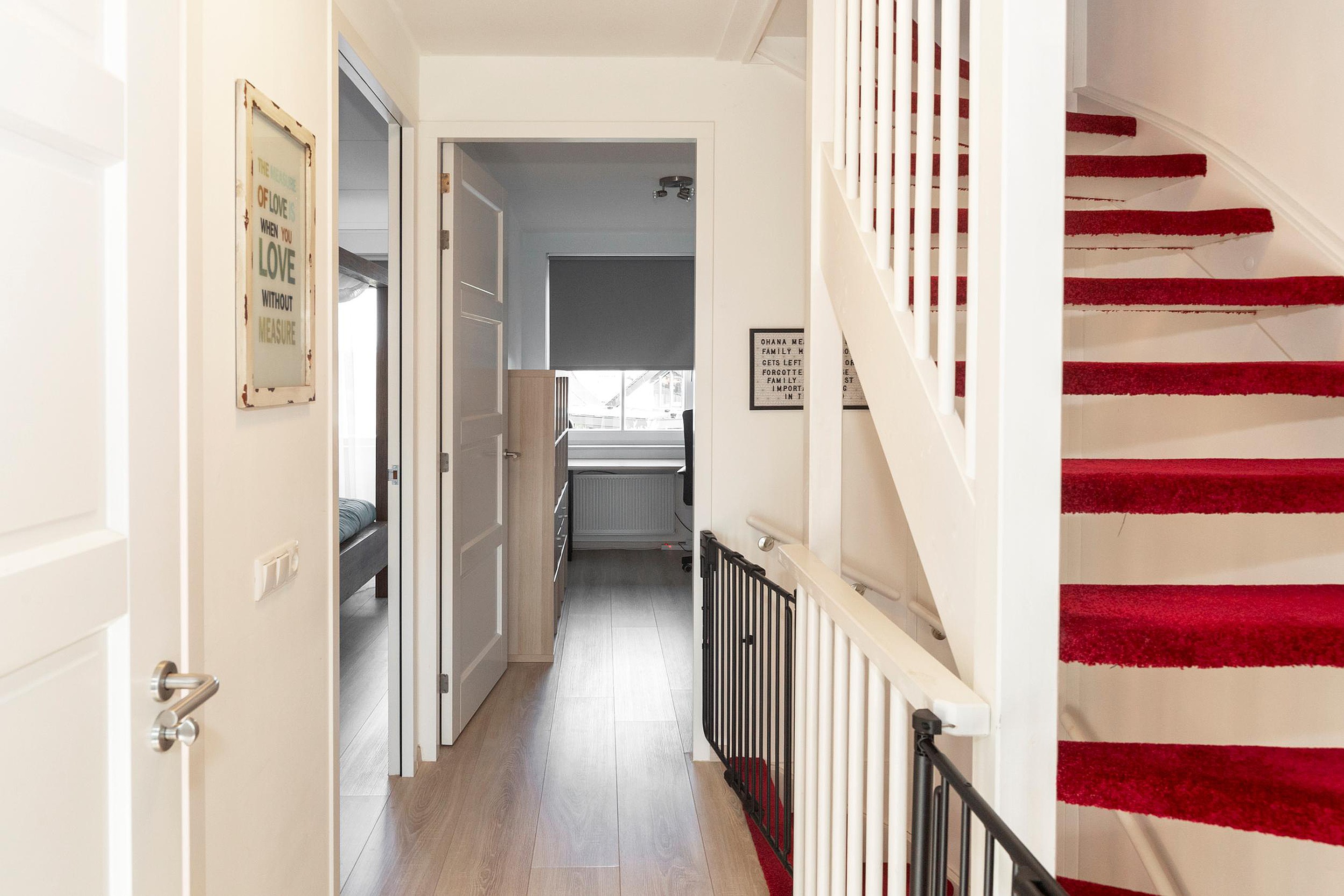Via de overloop heb je toegang tot drie ruime slaapkamers en de badkamer, voorzien van een inloopdouche, tweede toilet en een wastafel. Deze verdieping is afgewerkt met een keurige laminaatvloer.