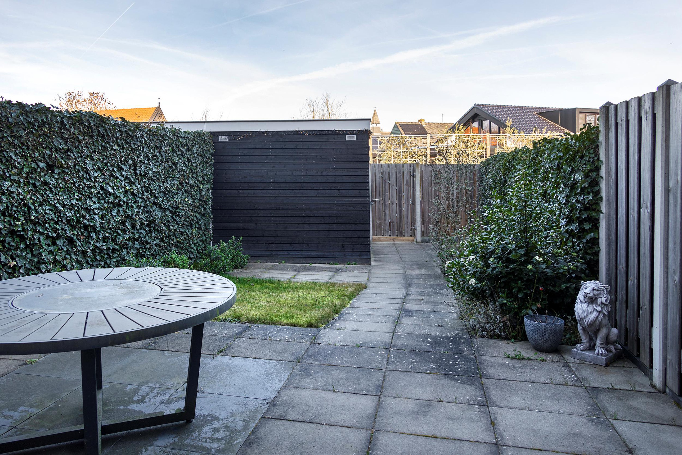 De woning beschikt over zowel een voor- als een achtertuin en biedt hiermee meerdere plekken in de zon op mooie dagen. De lang uitgestrekte achtertuin ligt op het noordwesten, verder vind je hier een vrijstaande houten berging, voorzien van elektra. Er is een achterom aanwezig.