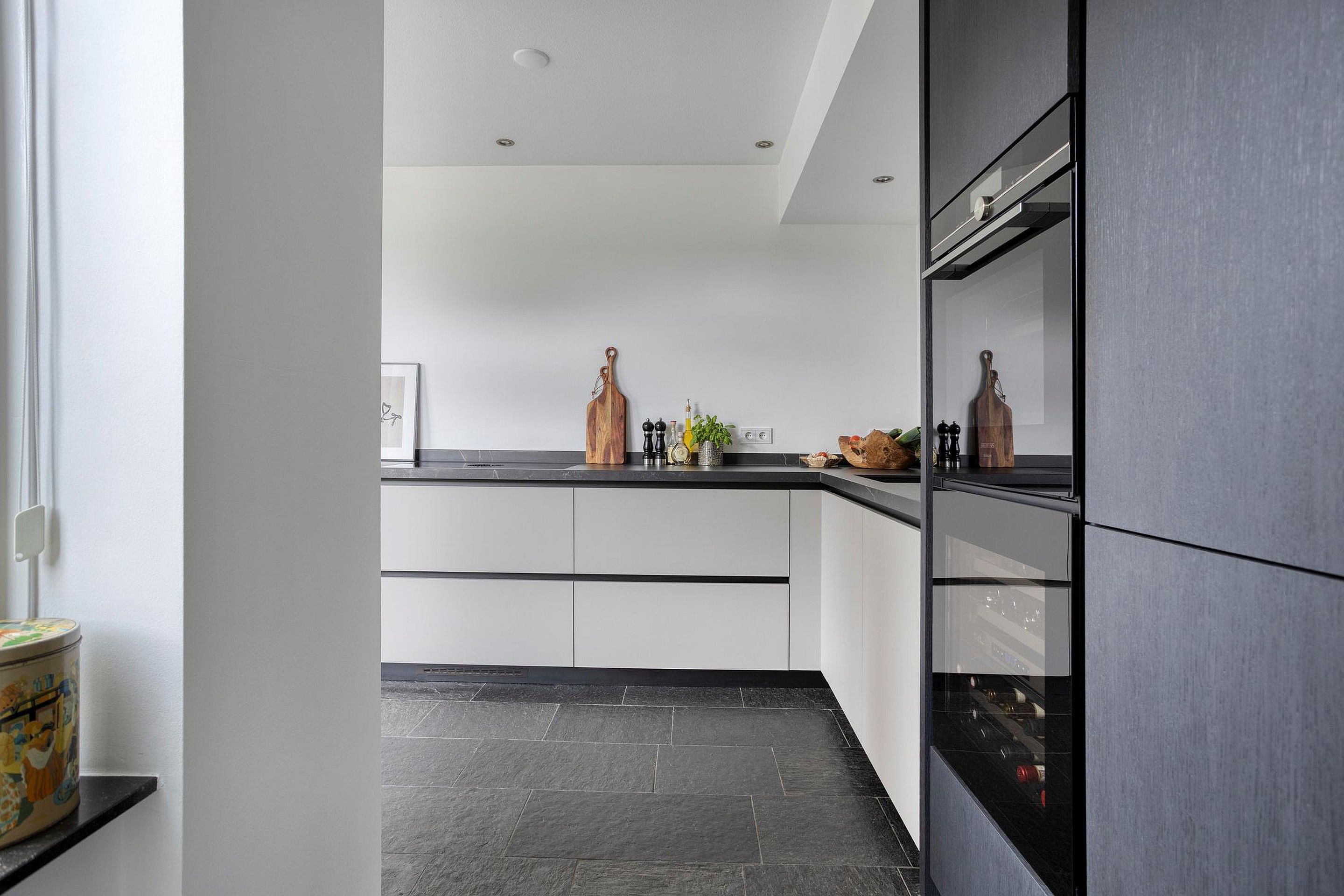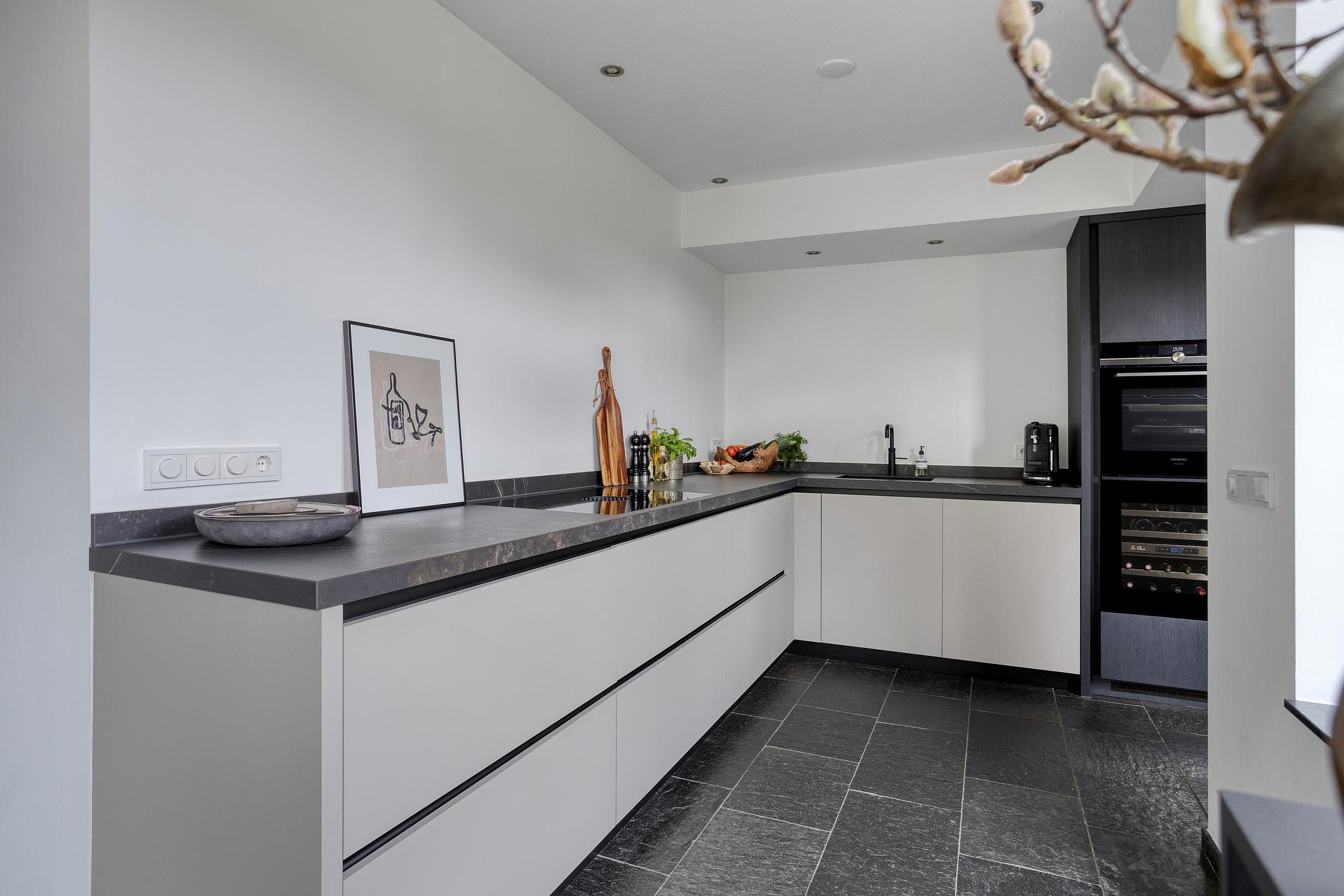 De in 2021 vernieuwde keuken is modern vormgegeven en voorzien van hoogwaardige inbouwapparatuur, waaronder Siemens apparatuur, een Bora kookplaat, een Quooker en een wijnklimaatkast. De keuken biedt volop werk- en bergruimte en sluit naadloos aan op de praktische bijkeuken, die toegang geeft tot zowel de tuin als de garage.