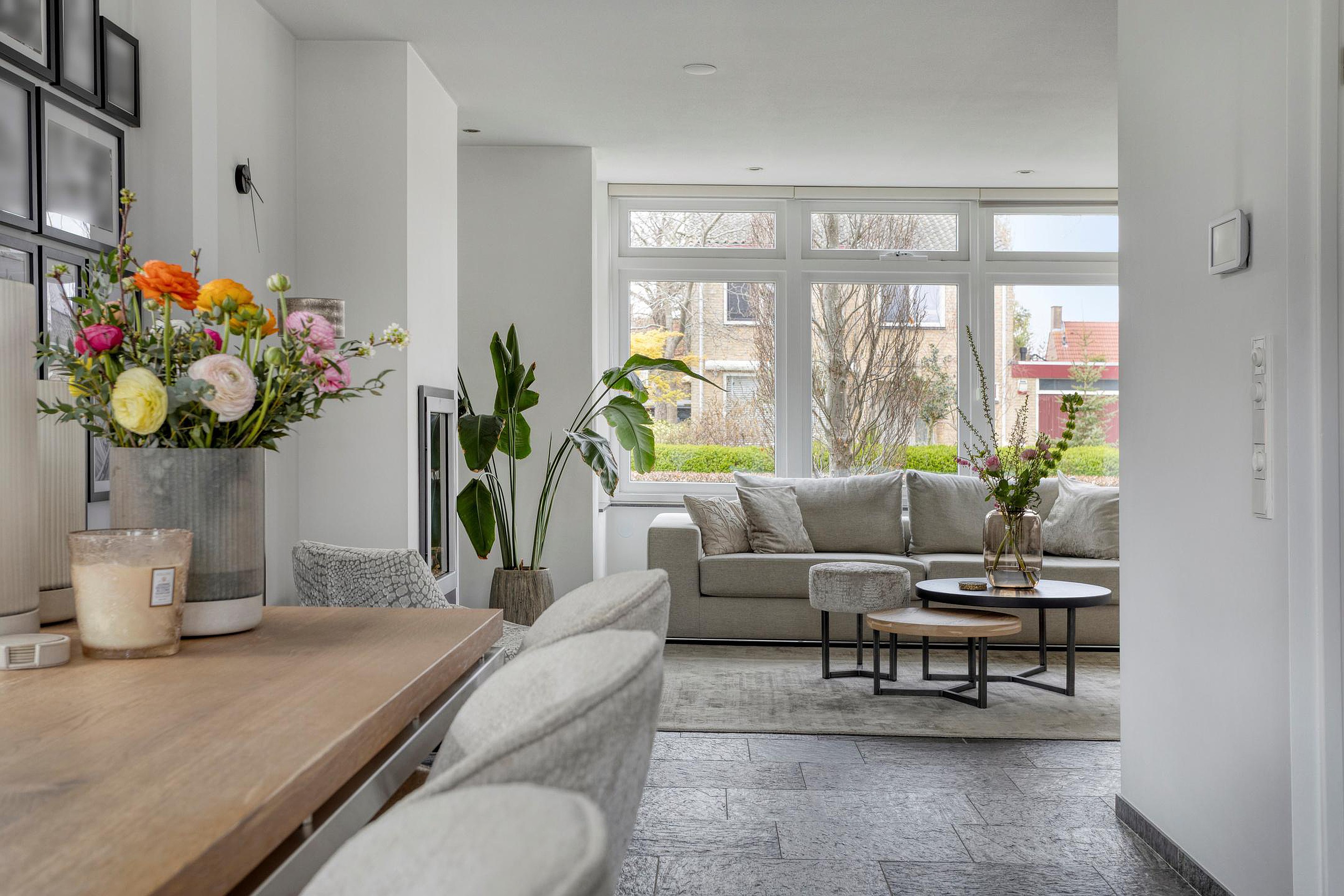 Begane grond De entree geeft toegang tot een verzorgde hal met toilet en trapopgang. Vanuit hier ontvouwt zich de royale woonkamer, waar grote raampartijen en twee charmante erkers zorgen voor een prachtige lichtinval en een ruimtelijk gevoel. De indeling is open en uitnodigend, met een prettige balans tussen sfeer en functionaliteit.