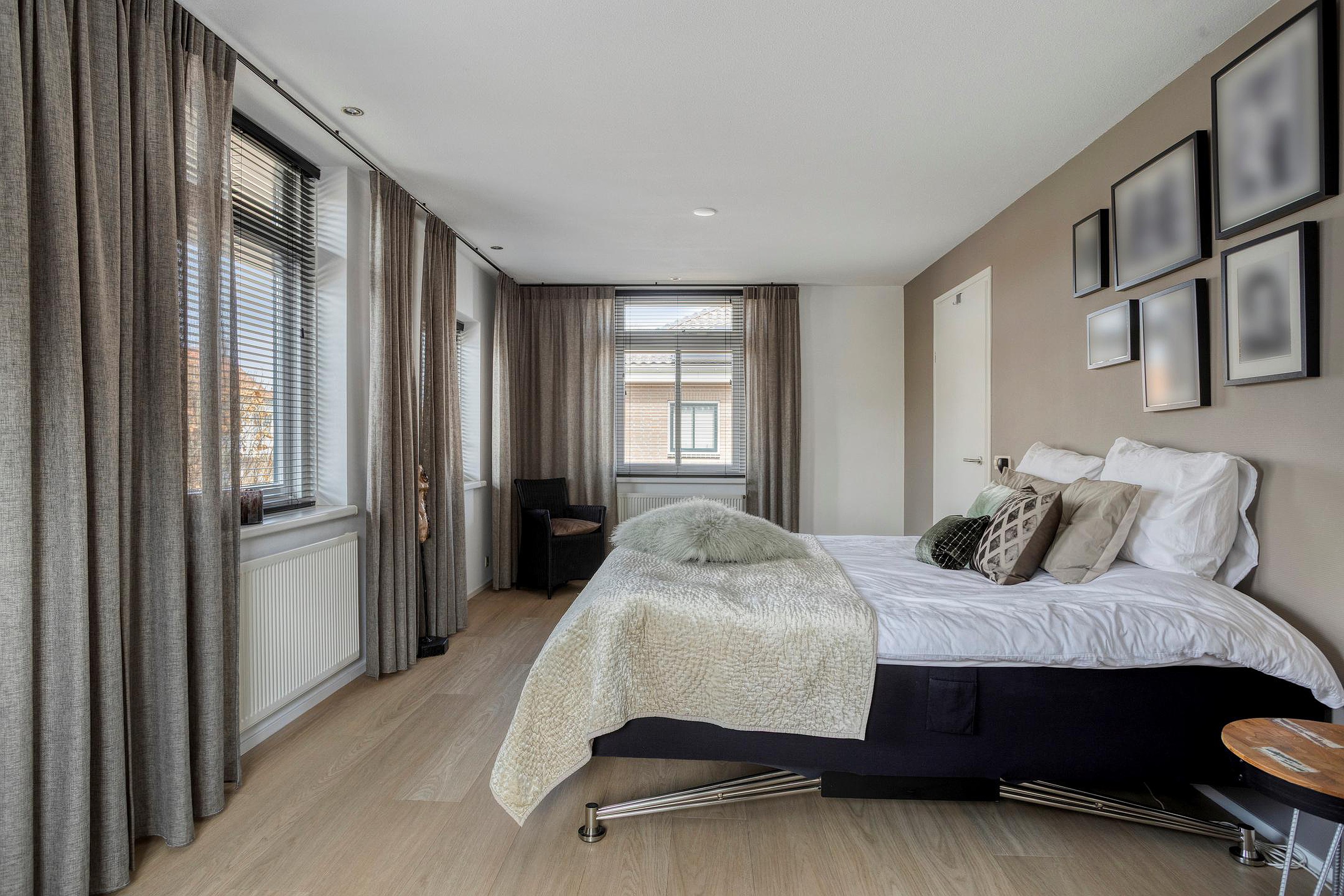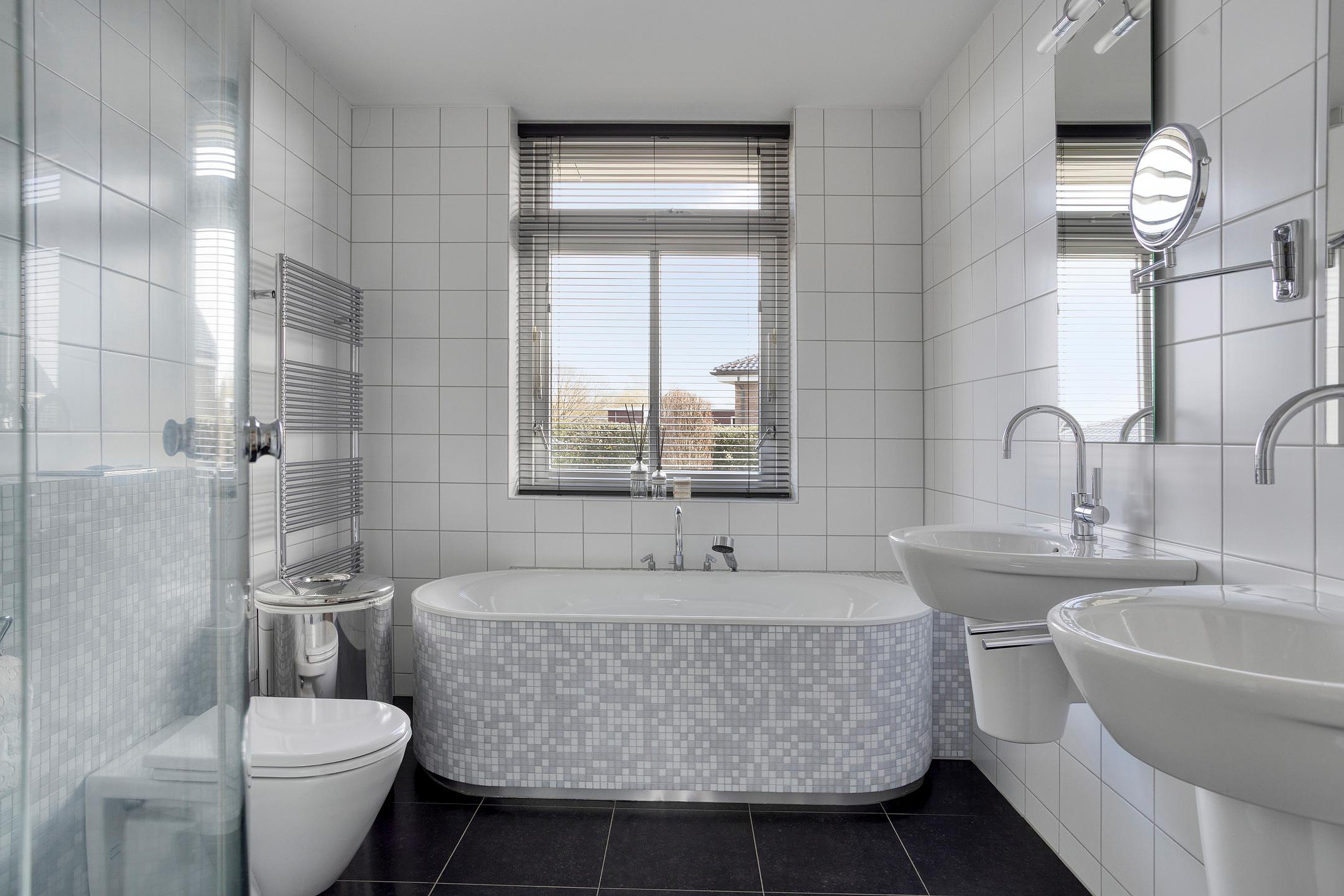 Eerste verdieping Op de eerste verdieping bevinden zich twee ruime slaapkamers waarvan een met een royale walk-in closet. Deze kamer kan eventueel worden opgedeeld in twee slaapkamers waardoor en 3 slaapkamers kunnen worden gerealiseerd op de eerste verdieping . De badkamer is stijlvol ingericht en voorzien van een ligbad, separate douche, dubbele wastafel en designradiator – een comfortabele en serene ruimte om de dag te beginnen of af te sluiten.