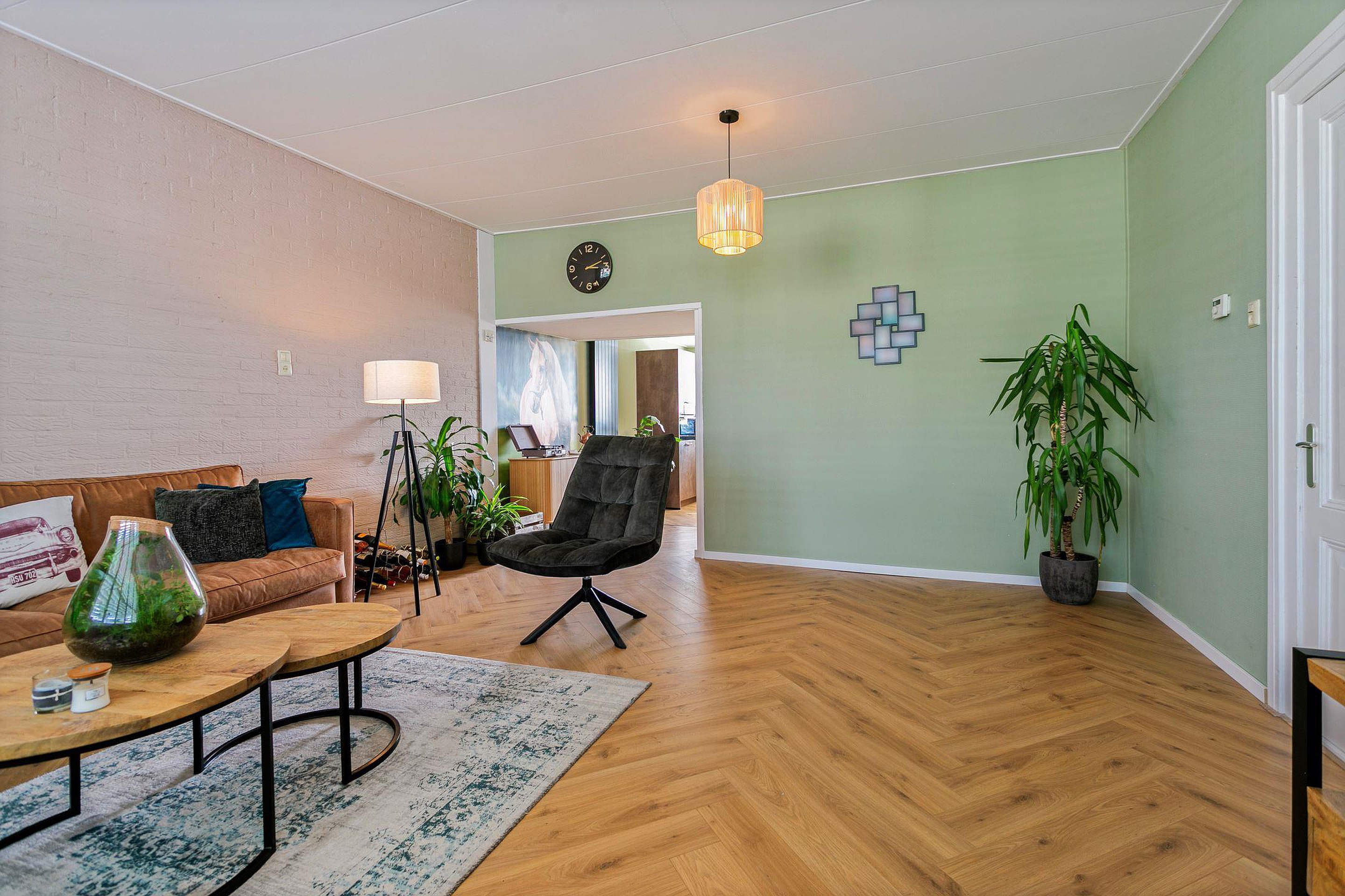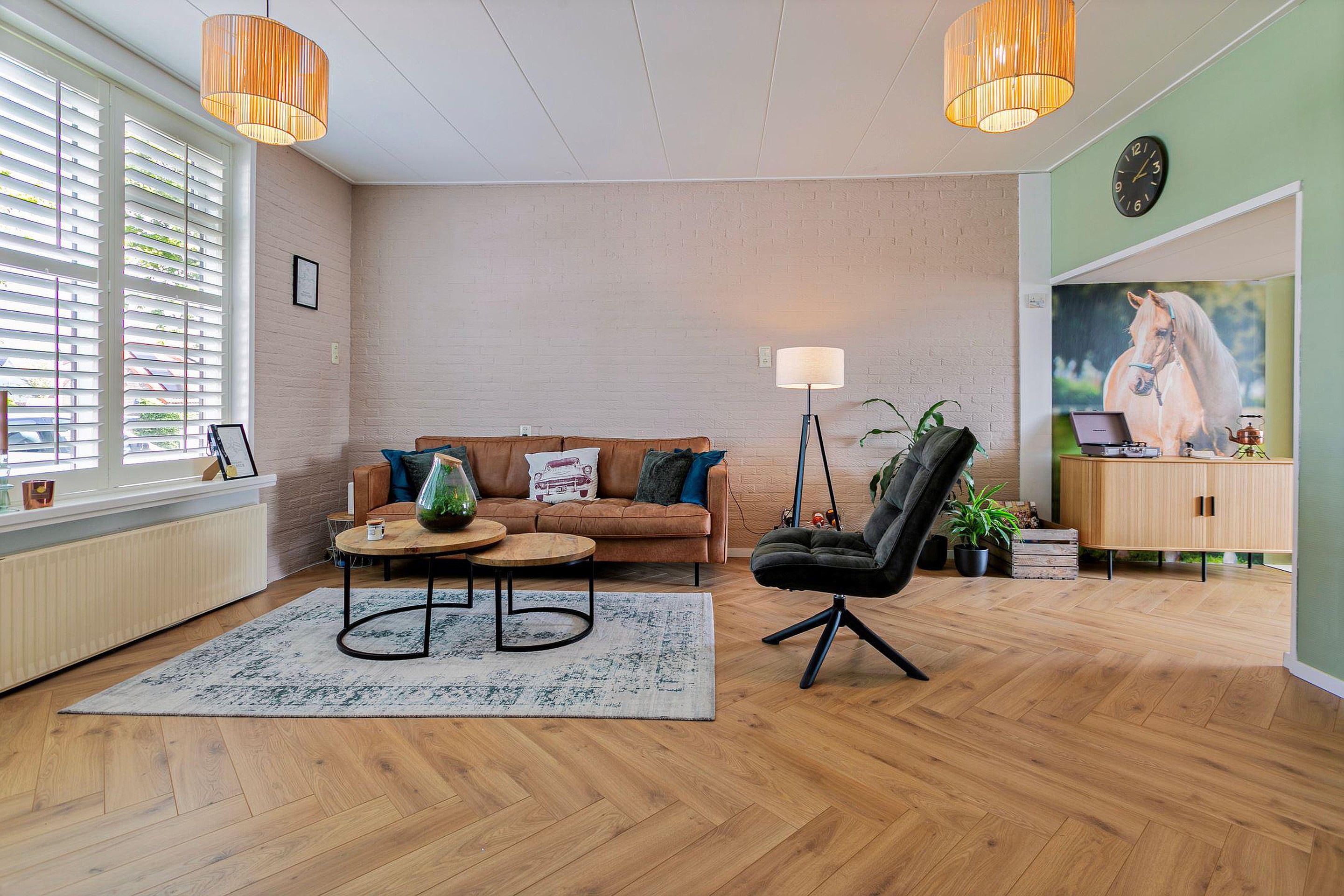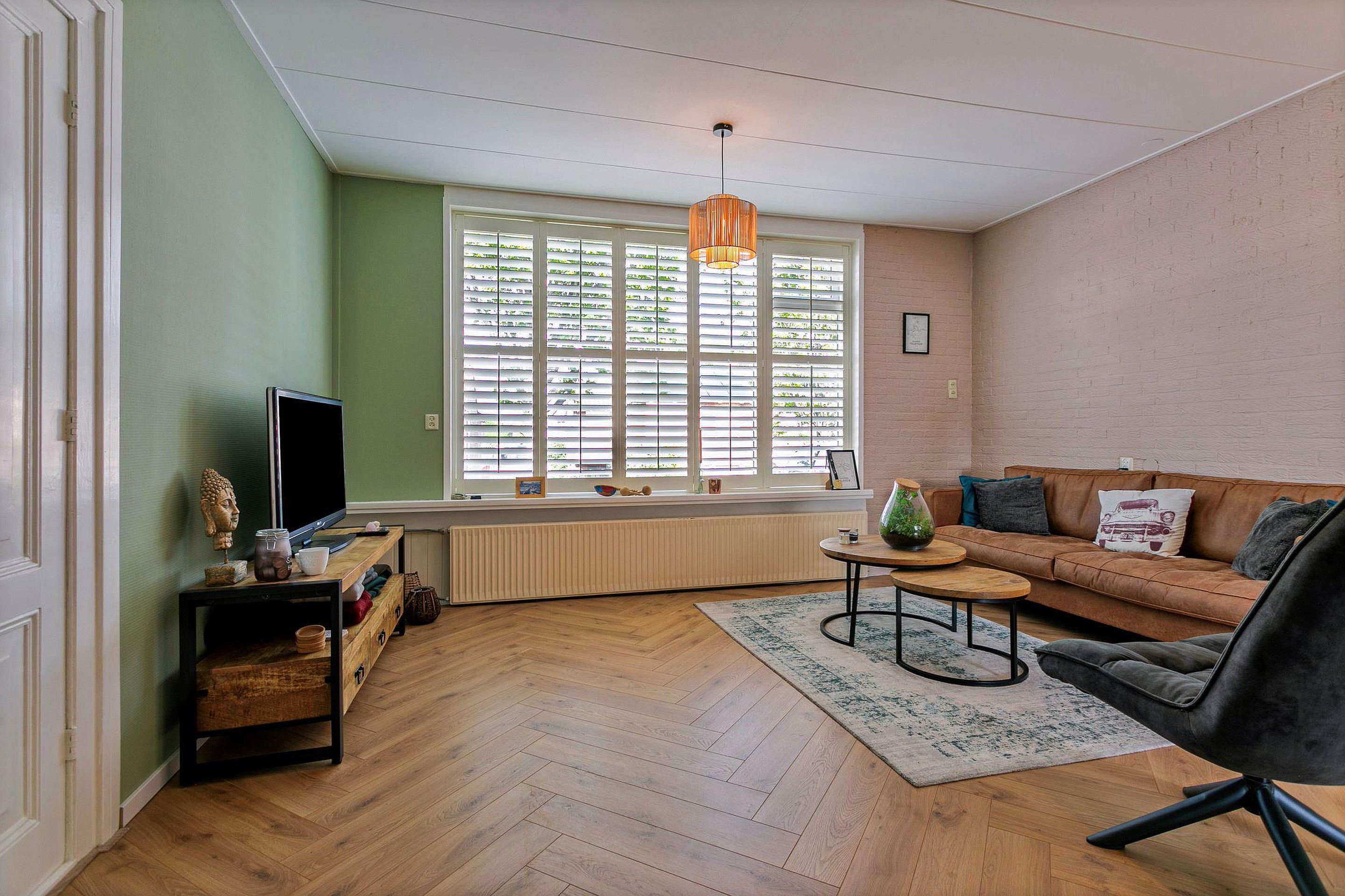 - Sfeervolle woonkamer met eiken parketvloer, shutters en trapkast
