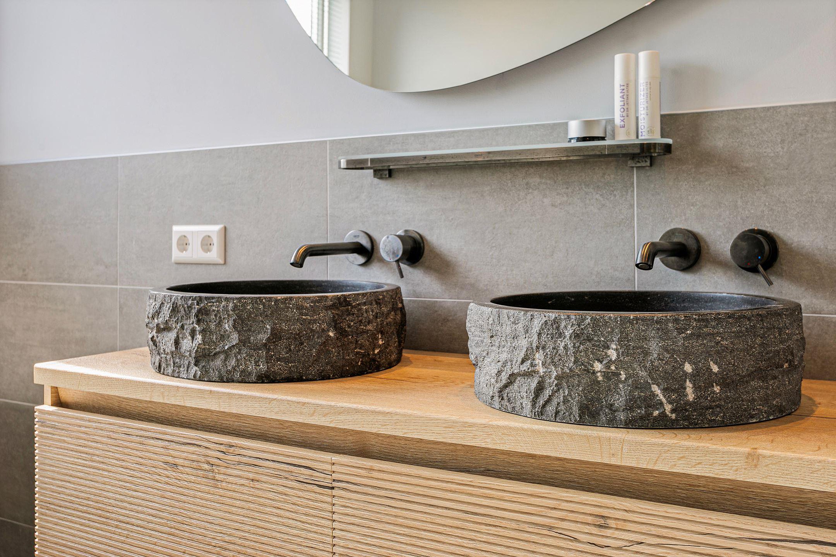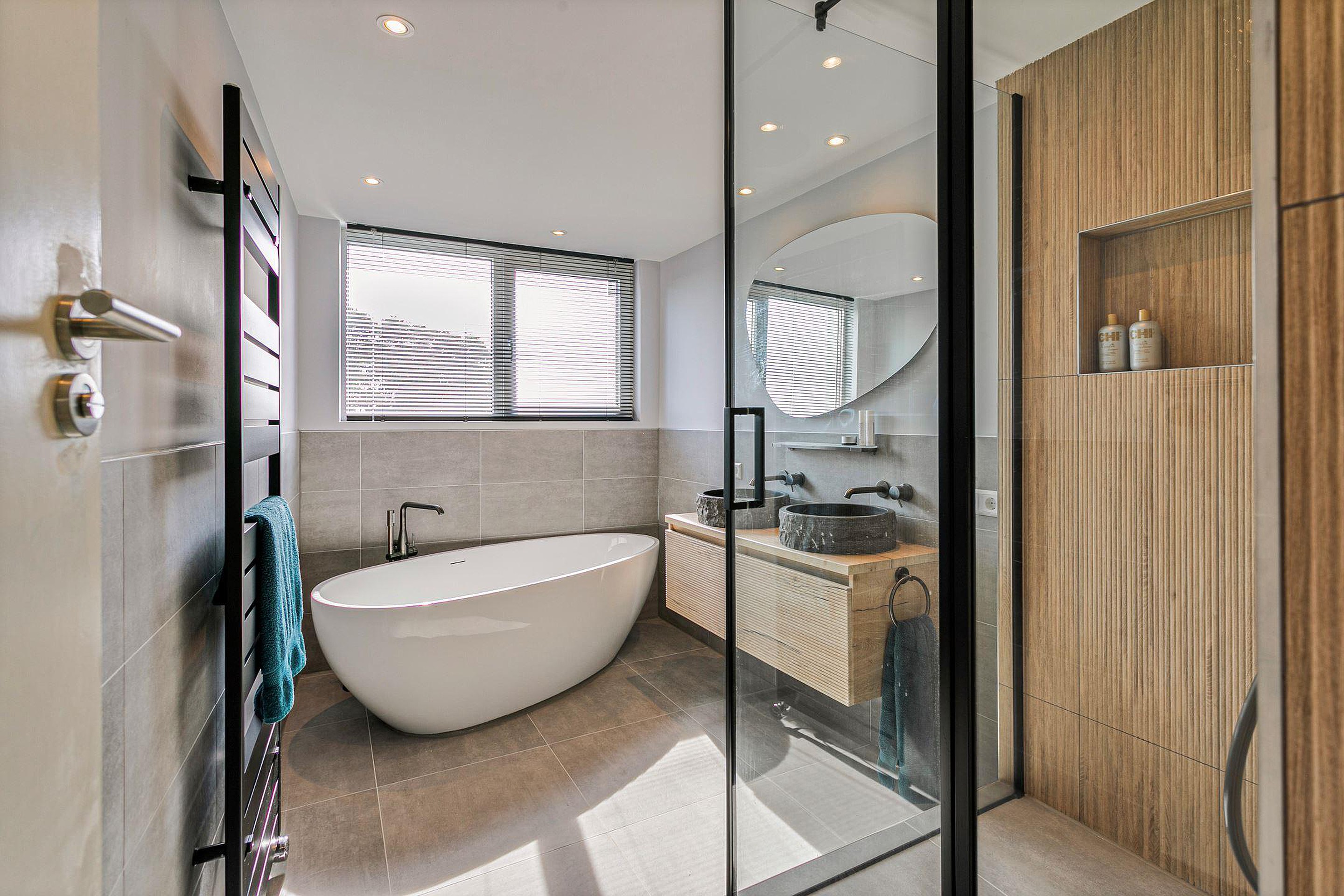 - Luxe badkamer met ligbad, inloopdouche, dubbel wastafelmeubel en designradiator