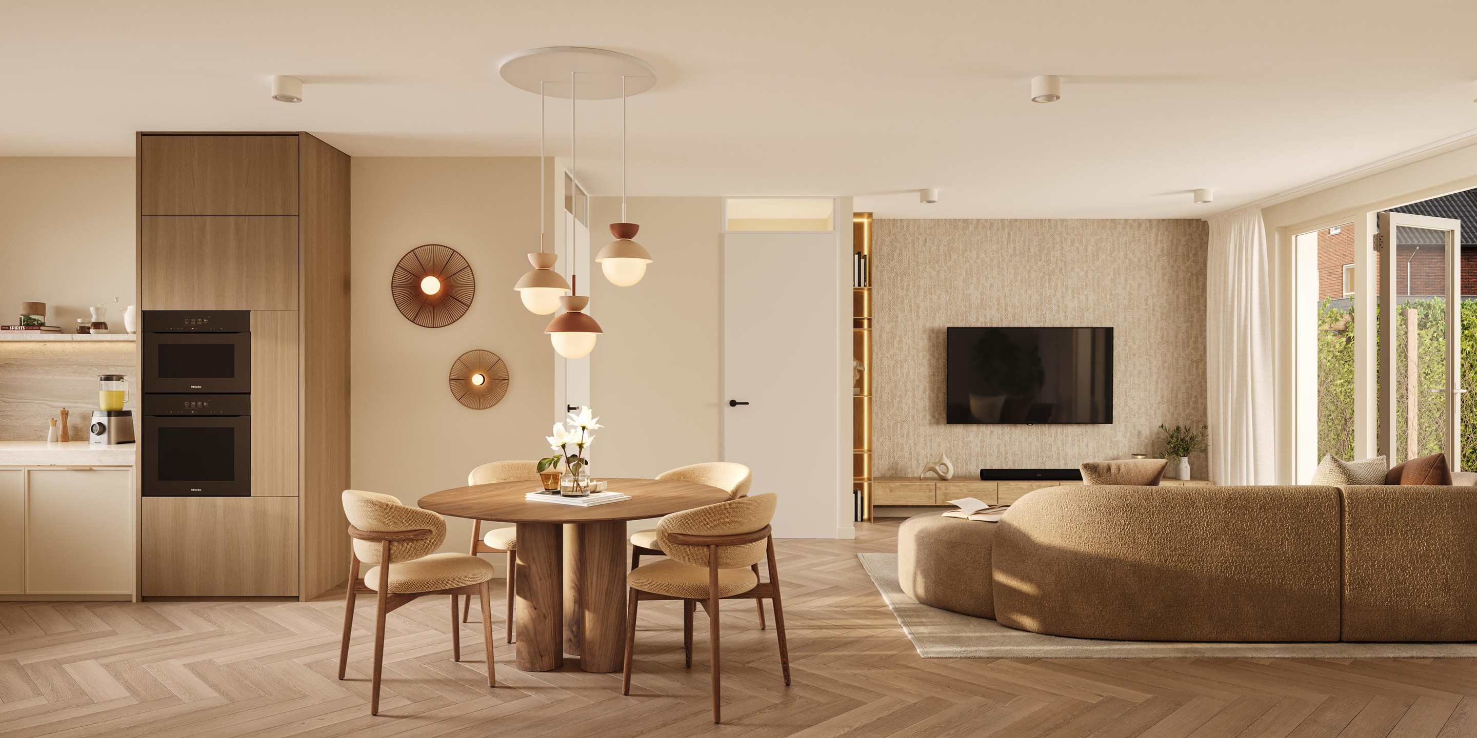 De buitenruimte combineert esthetiek met functionaliteit. Hagen, bloemrijke zones en een variëteit aan bomen zorgen voor verkoeling, biodiversiteit en wateropvang. Nestelplekken voor vogels en vleermuiskasten creëren een levendige, natuurlijke omgeving. Zo ervaart u een harmonieuze balans tussen mens en natuur direct vanuit uw tuin of terras.