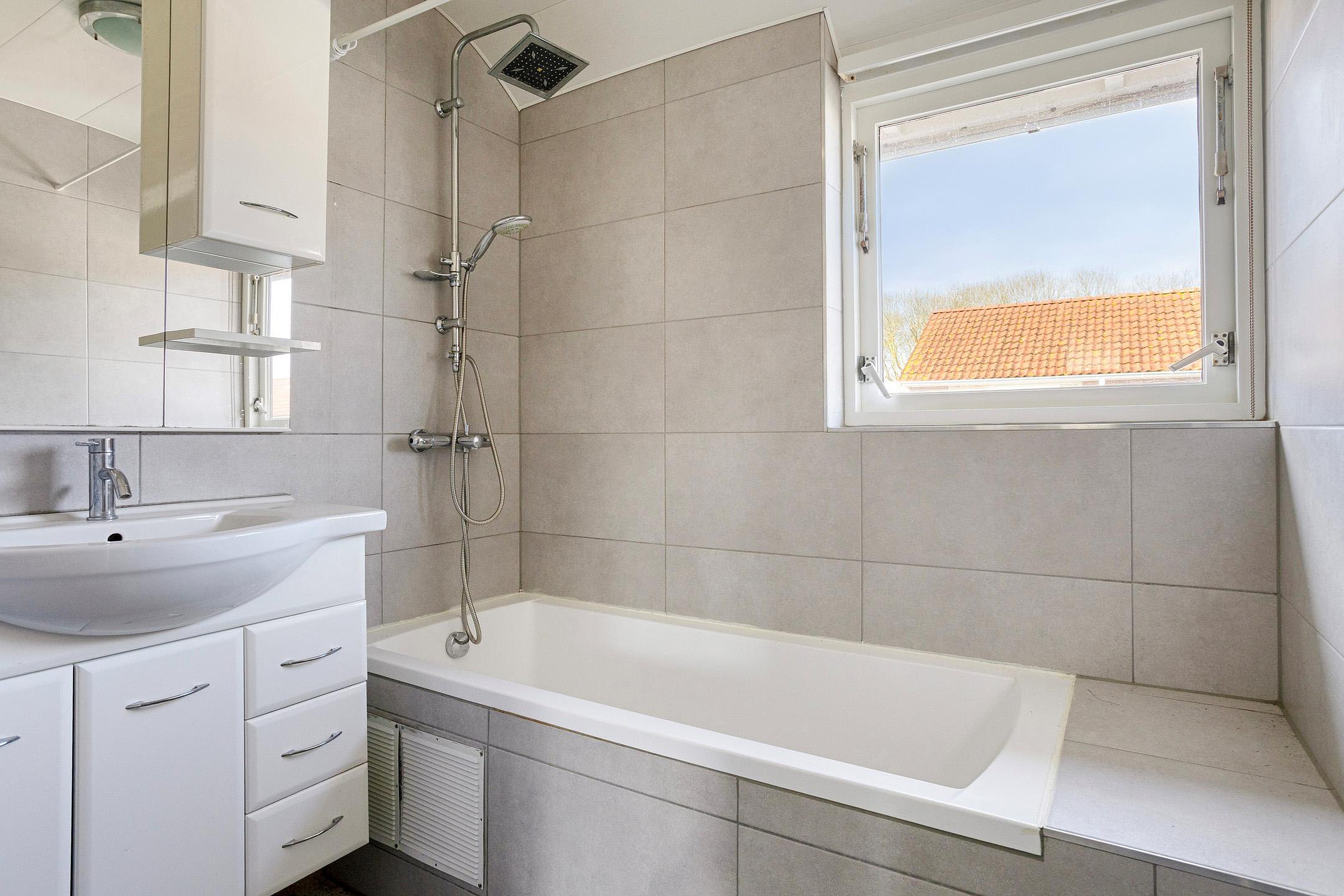 De badkamer is compact maar functioneel en voorzien van een ligbad, wastafel en douche.