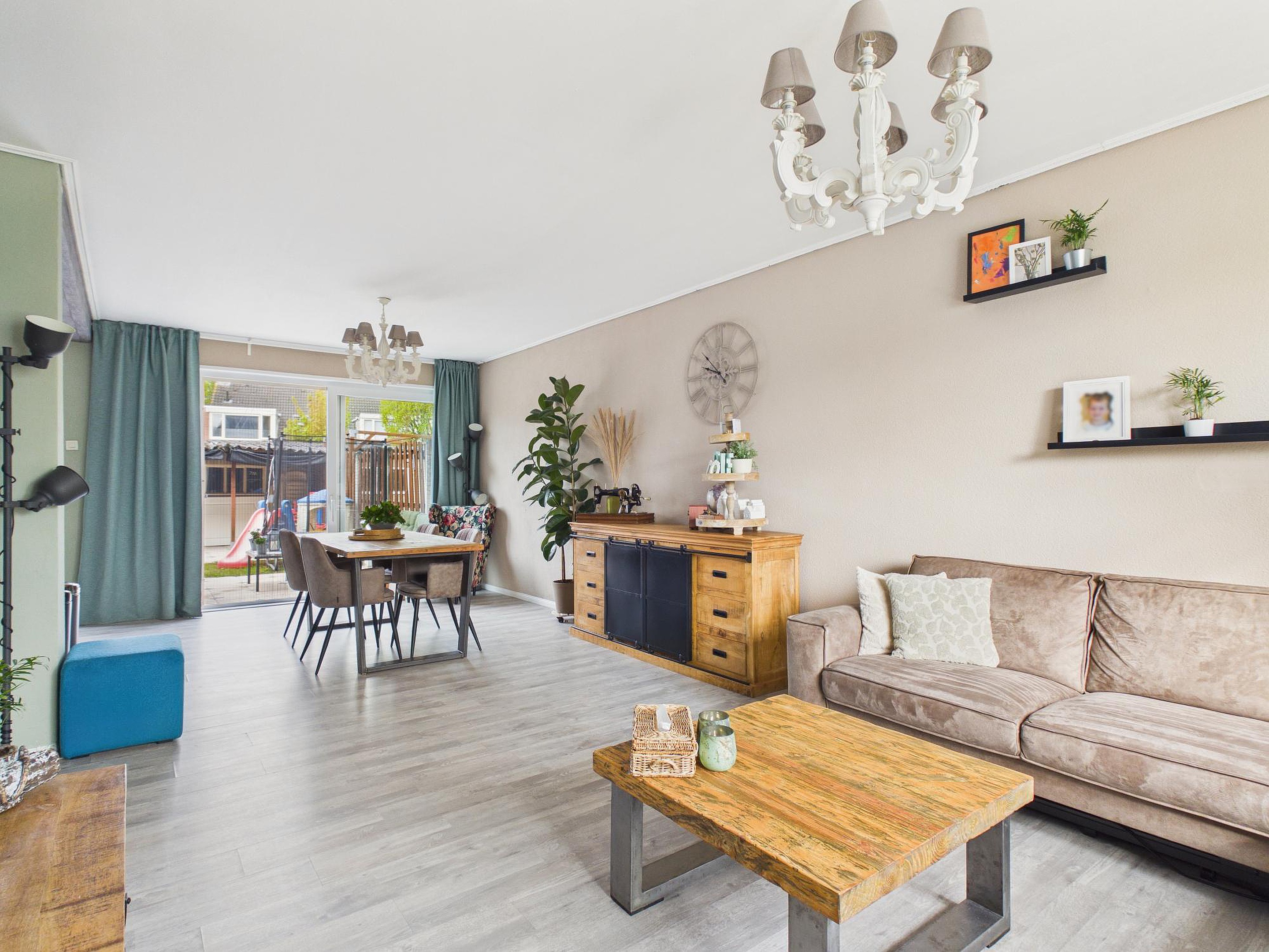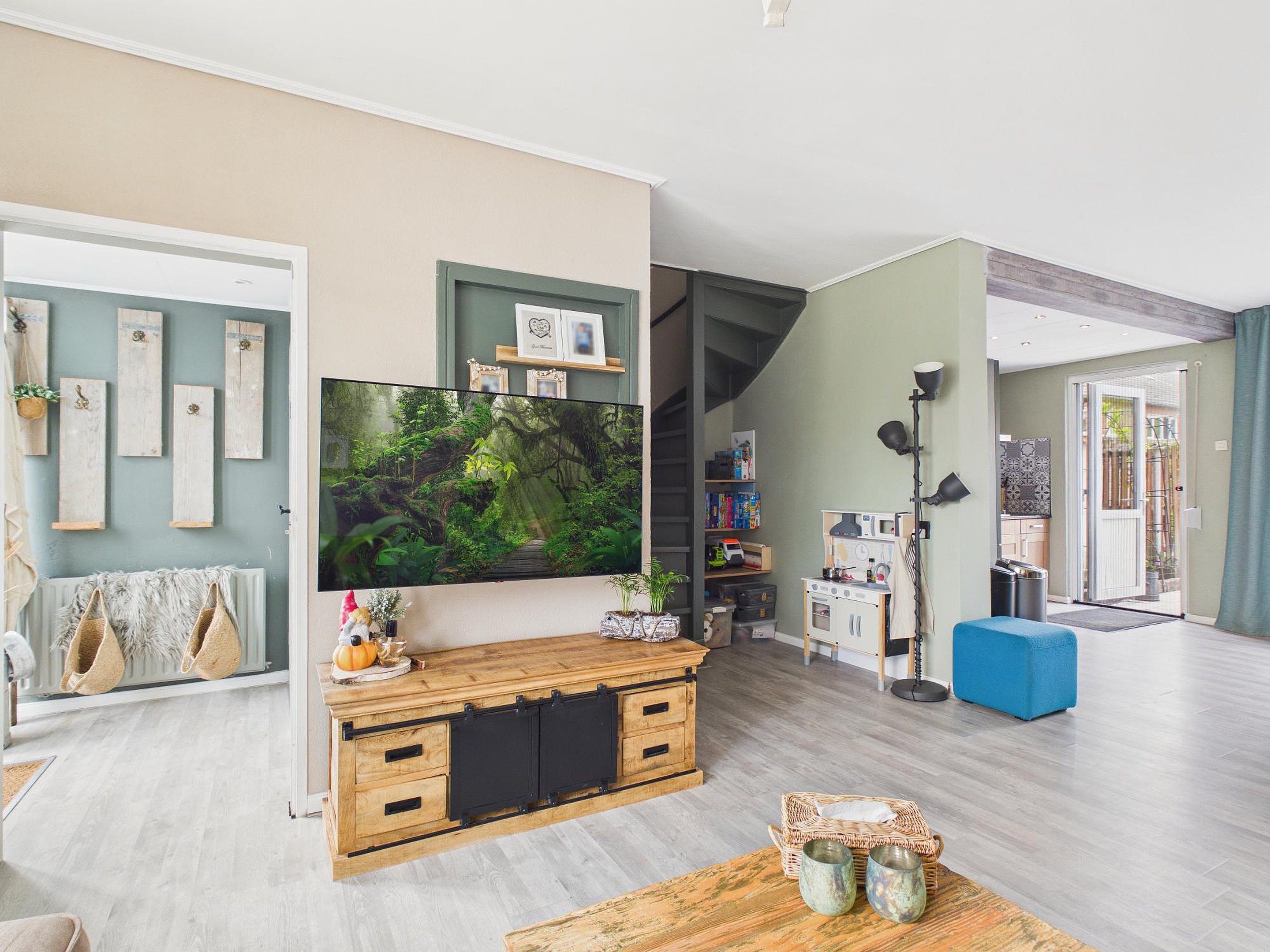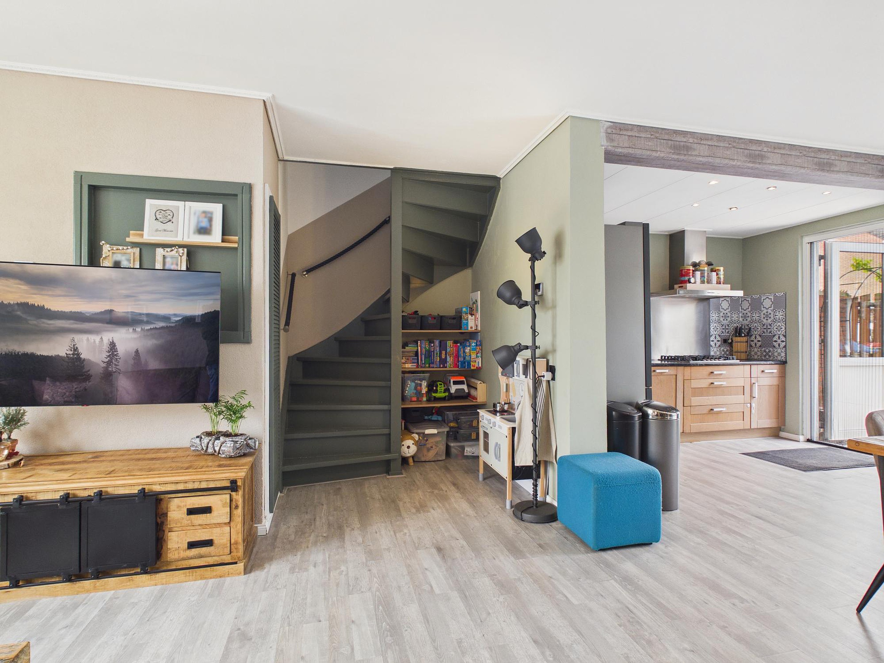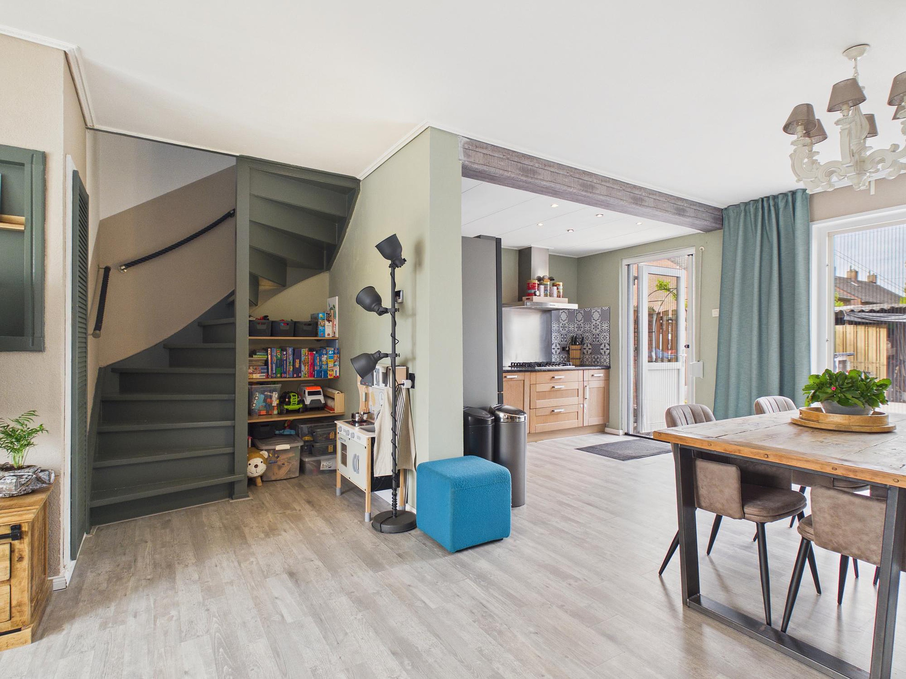 Via de voordeur stap je binnen in een nette hal, voorzien van toilet en meterkast. Vanuit hier kom je in de ruime en lichte woonkamer met open keuken — een fijne, open leefruimte waar je je direct thuis voelt. Via de schuifpui stap je zo de tuin in, perfect voor binnen-buiten genieten. De trap in de woonkamer leidt naar de eerste verdieping.