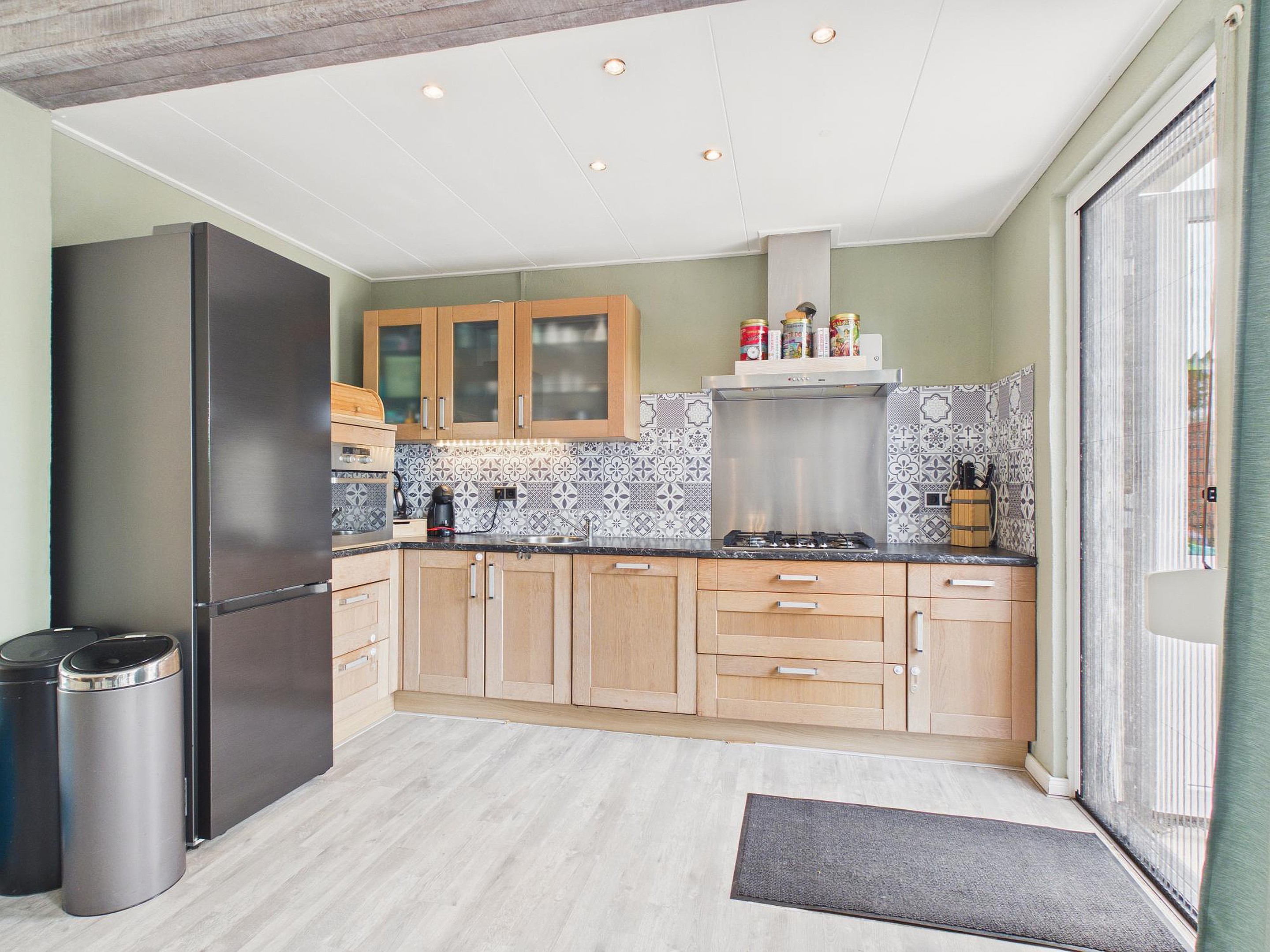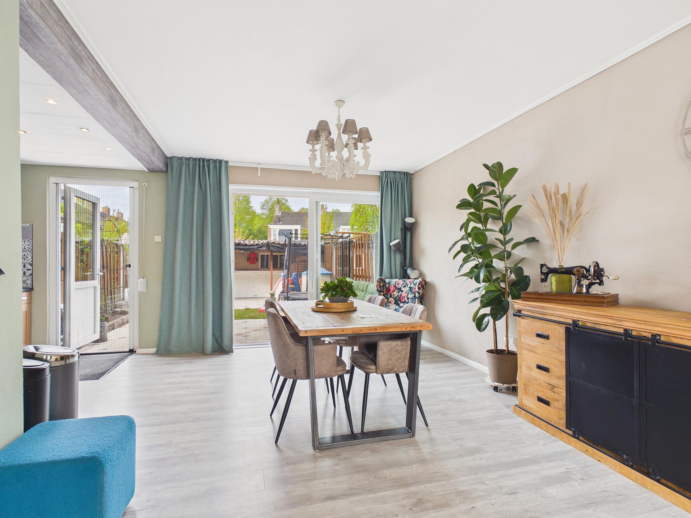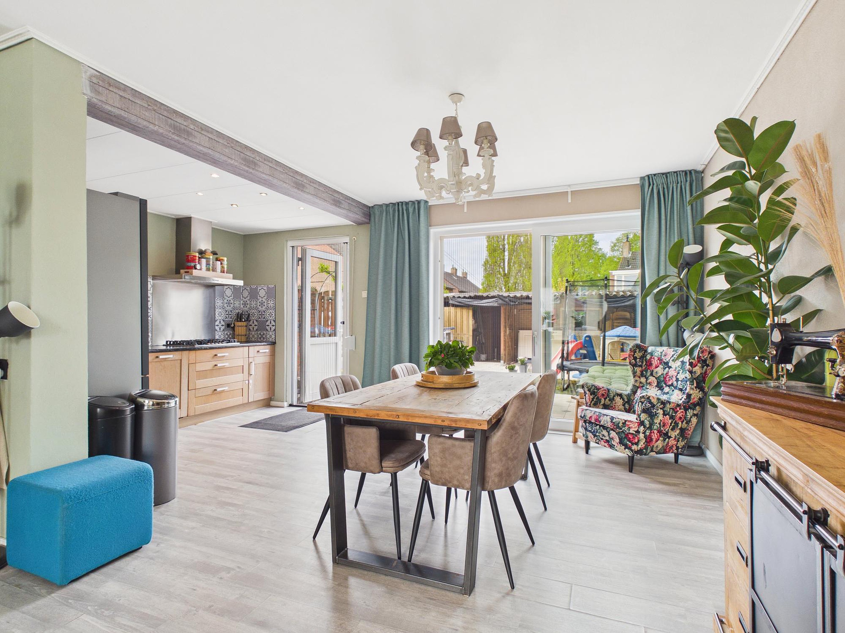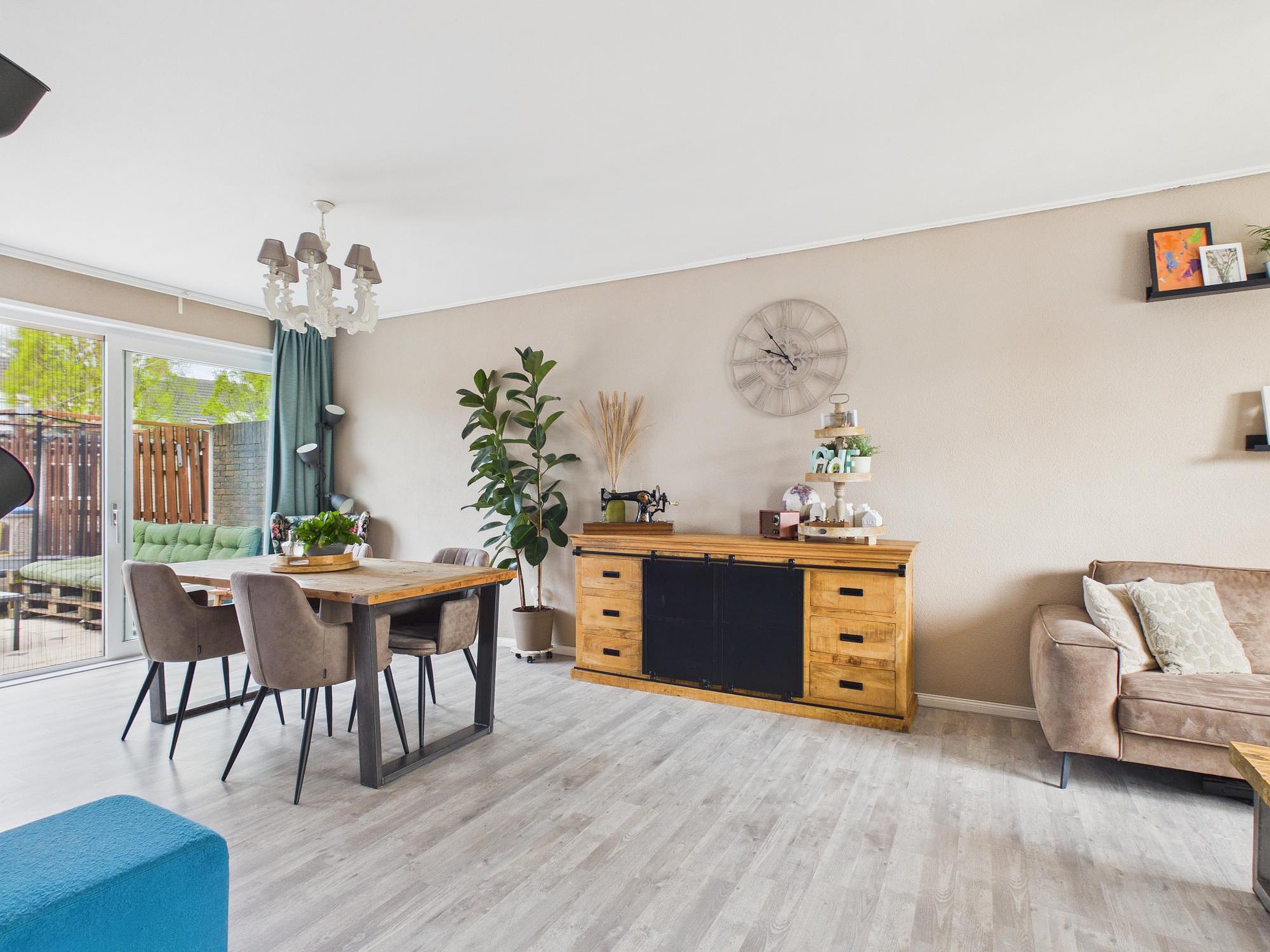 Via de voordeur stap je binnen in een nette hal, voorzien van toilet en meterkast. Vanuit hier kom je in de ruime en lichte woonkamer met open keuken — een fijne, open leefruimte waar je je direct thuis voelt. Via de schuifpui stap je zo de tuin in, perfect voor binnen-buiten genieten. De trap in de woonkamer leidt naar de eerste verdieping.