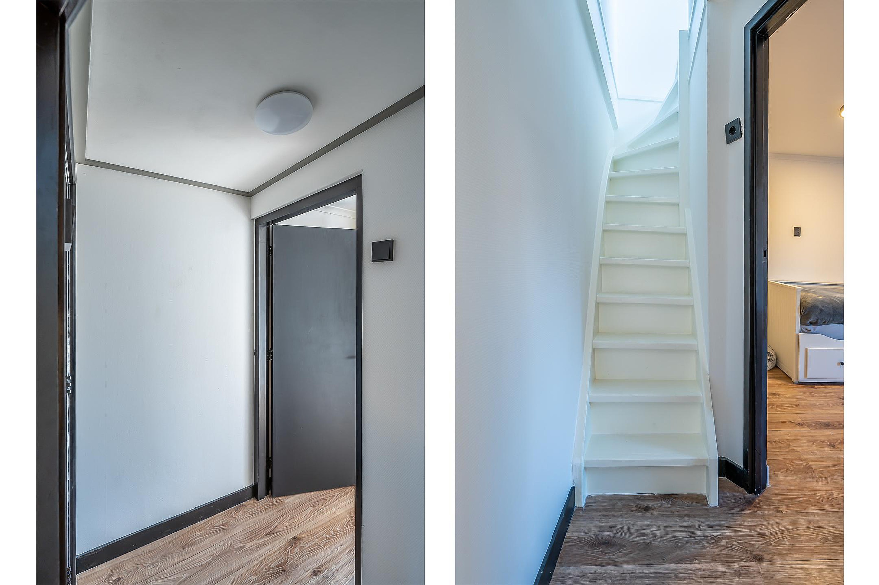 Vanaf de begane grond leidt een vaste trap vanuit de woonkamer naar de eerste verdieping. Hier kom je terecht op de overloop met vaste trap naar de zolder. De eerste verdieping beschikt over twee slaapkamers. Eén van deze slaapkamers biedt uitzicht op de Basiliek van Oudenbosch. Vanuit de achterste slaapkamer is er directe toegang tot het dakterras via een raam.