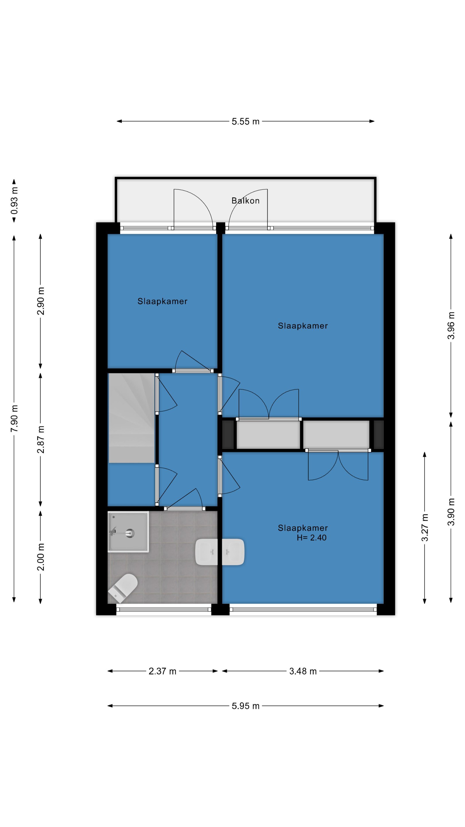 Links, aan de voorzijde van de woning (Oosten) is de kleinste slaapkamer. Dit zou een ideale thuiswerkplek of hobbykamer kunnen zijn. De master bedroom ligt eveneens aan de voorzijde. Heerlijk, want daar komt ’s morgens het zonnetje op. Nog lekkerder is het balkon, waar je vanuit beide kamers naar toe kunt. Een mooie extra buitenruimte waar je bv. een tuinstoel kunt neerzetten om rustig een boek te kunnen lezen, wat mooie bloembakken te plaatsen of; gewoon je droogrek neer te zetten.